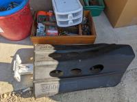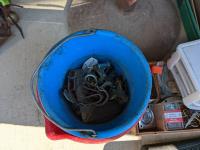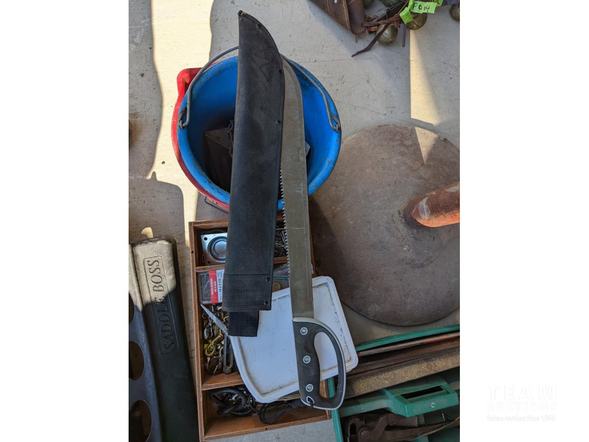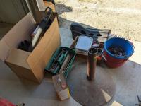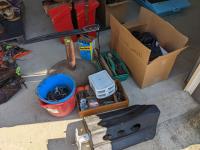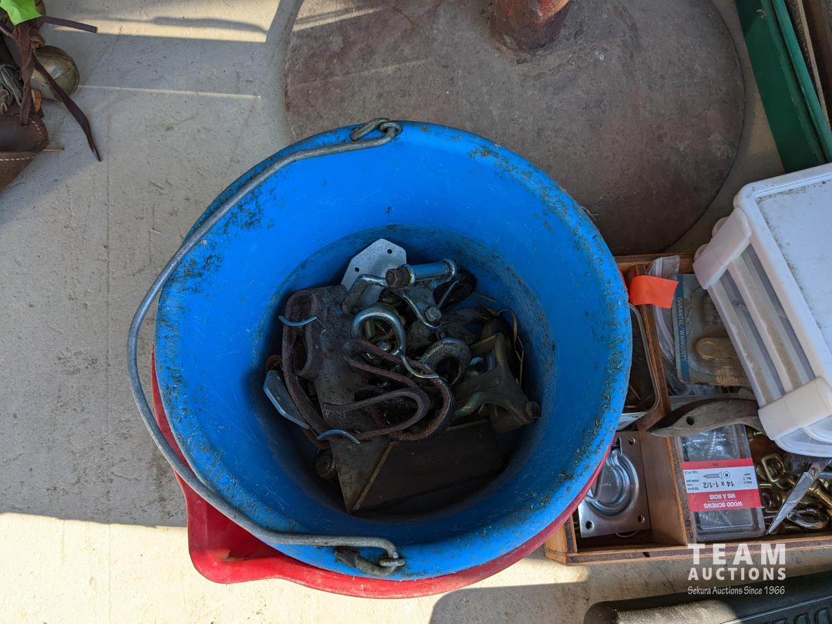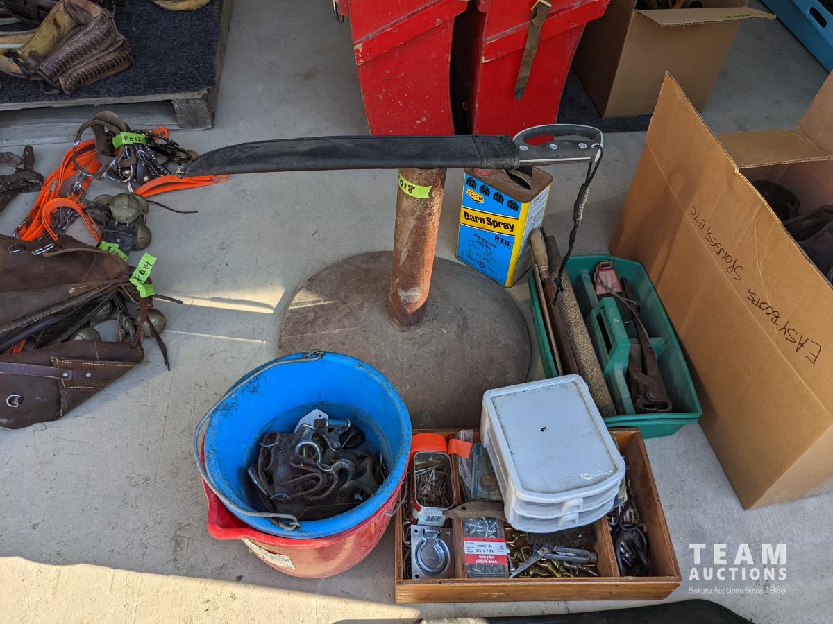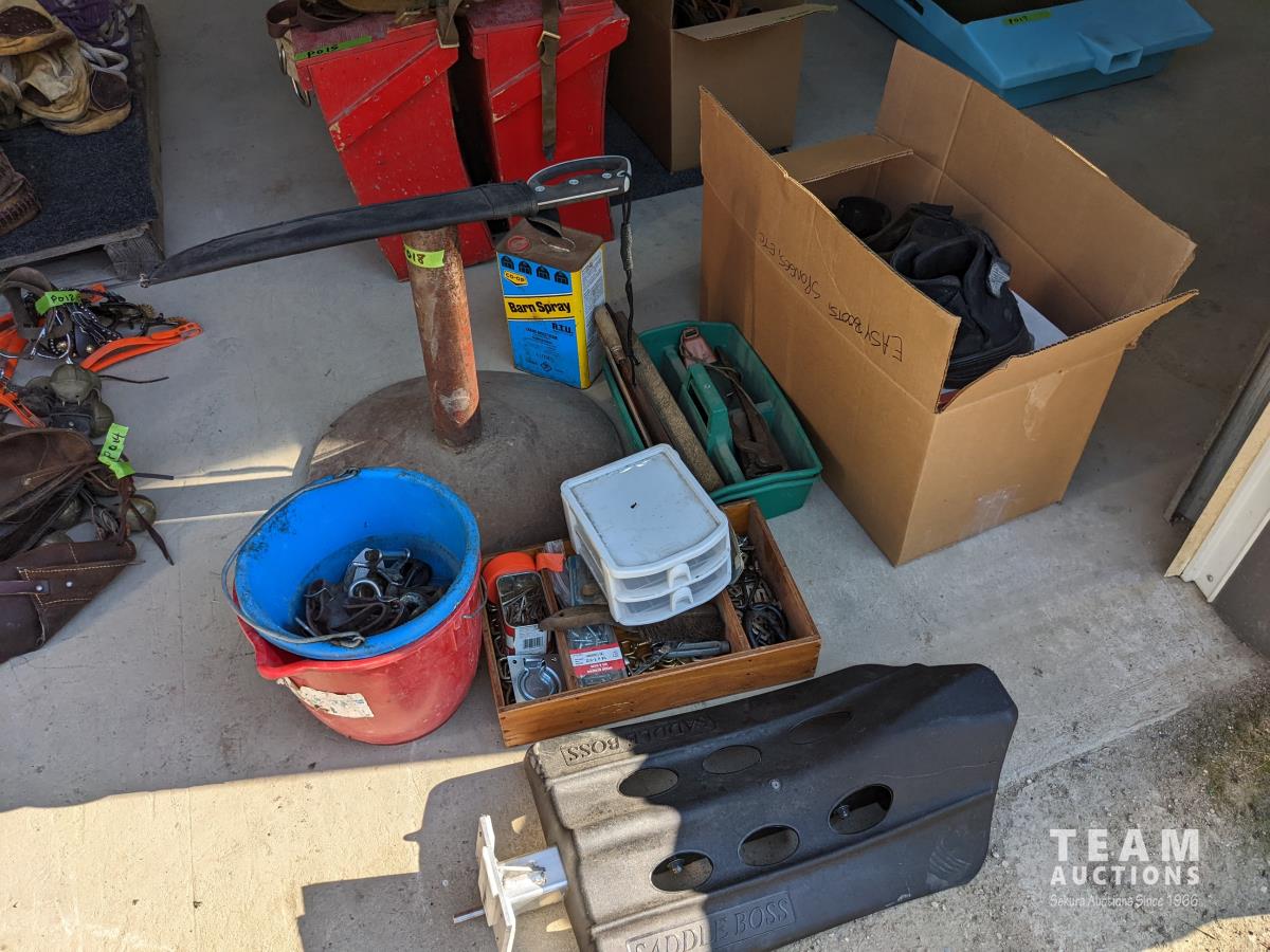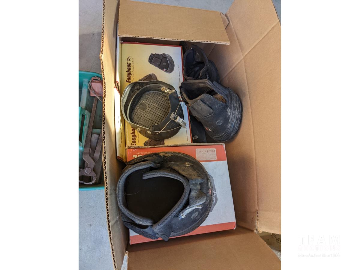 (9) Easy boots of various sizes, hoof stand, (2) poly pails, (2) Unused size 80 horse blankets, survival knife, saddle rack, barn spray