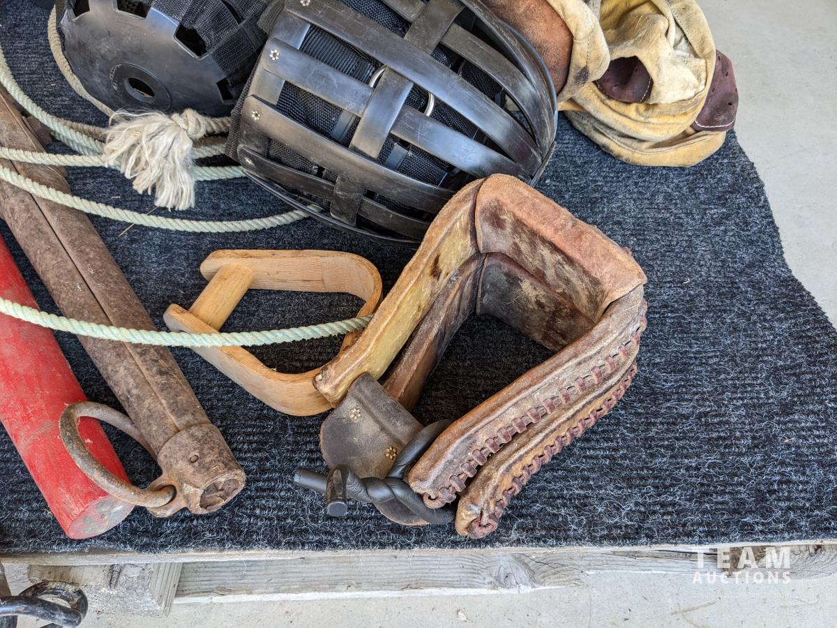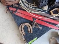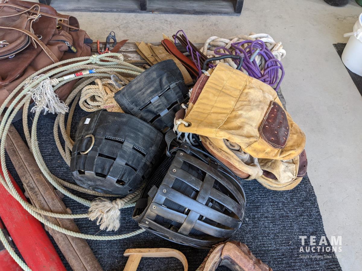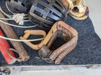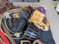 (2) Nylon saddle bags, (2) leather bags, (3) yokes, (4) horse muzzles, (5) feed bags, rope, (2) lariats, (2) horse shoess, (4) cinch straps