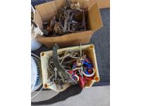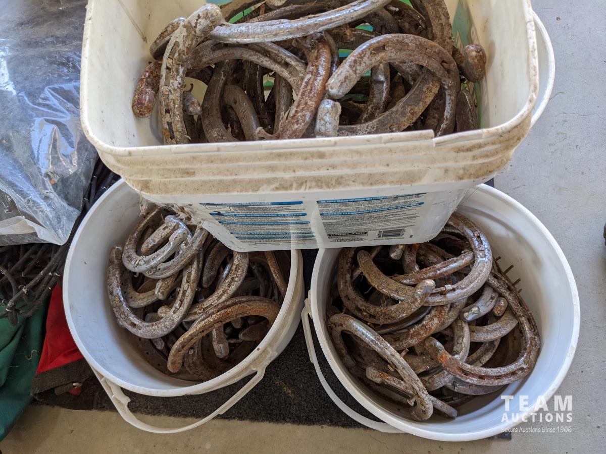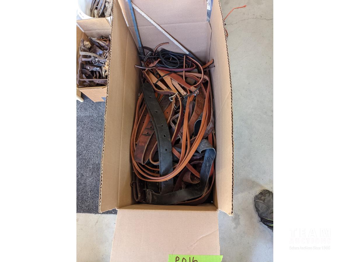 box of leather, used horse shoes, round bay hay net, square bale hay nets, buckles, spurs, bits, (2) whips