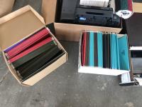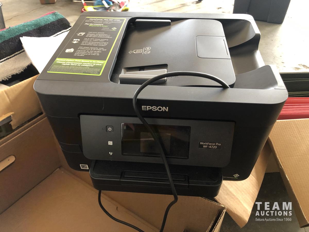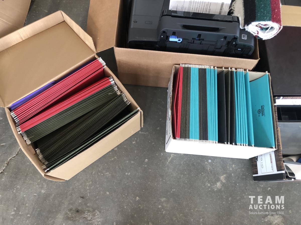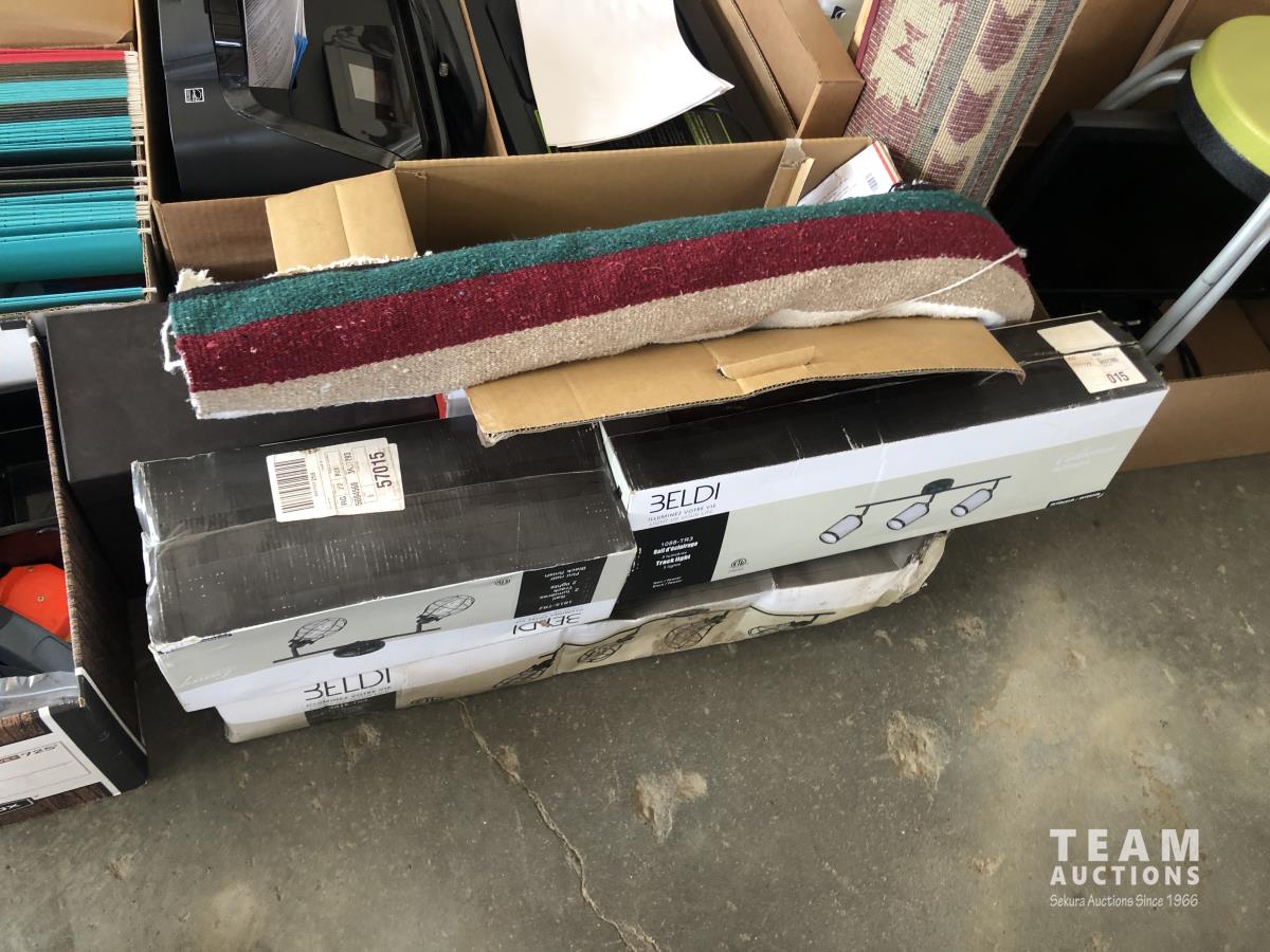 Miscellaneous office supplies, (3) printers, filing cabinet, computer monitor , keyboard & track lights