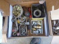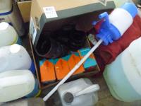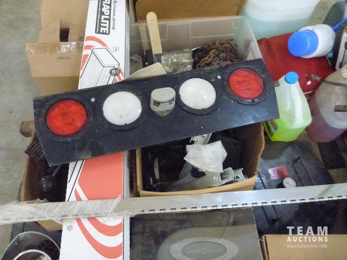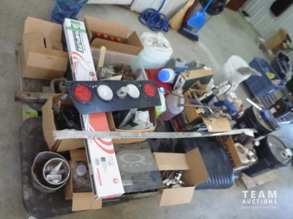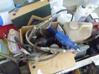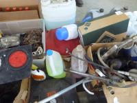 receiver hitch, (8) 1 litre 10W40 motor oil, shop fluids, grease fittings, grease guns, coveralls, hose clamps, misc items