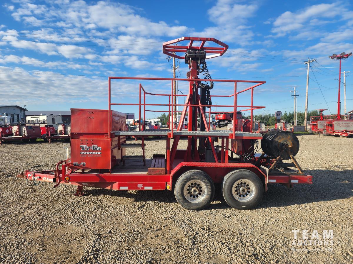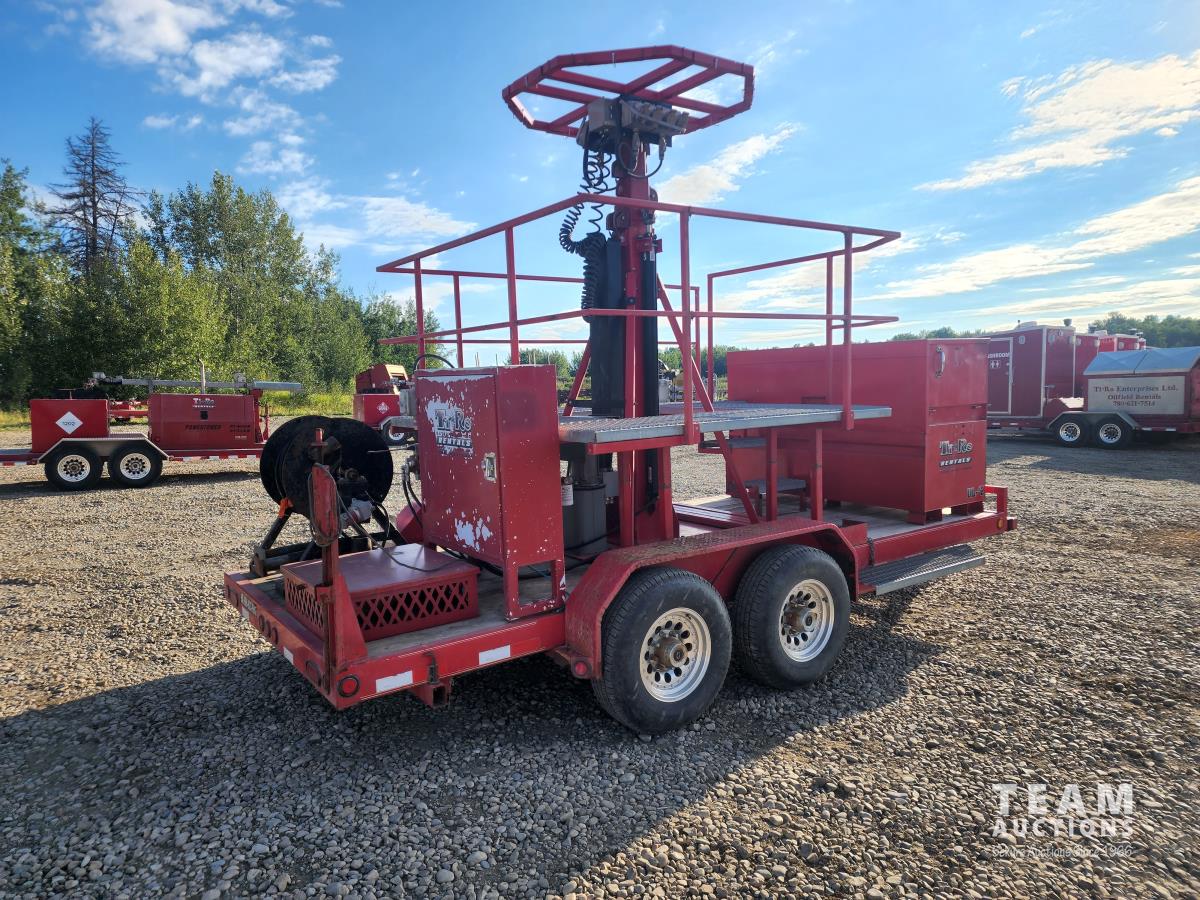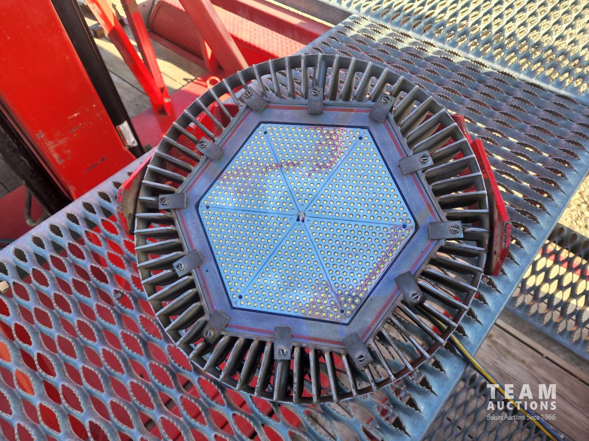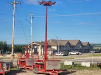 (2) 7,000 lb axles, 80 inch wide, torflex suspension, (8) lights, 235/80R16 tires on aluminum rims, 45 ft height, (8) LED lumen 26,000 watt lights, lights over a 400 ft circle, operates with 220 watt single phase power