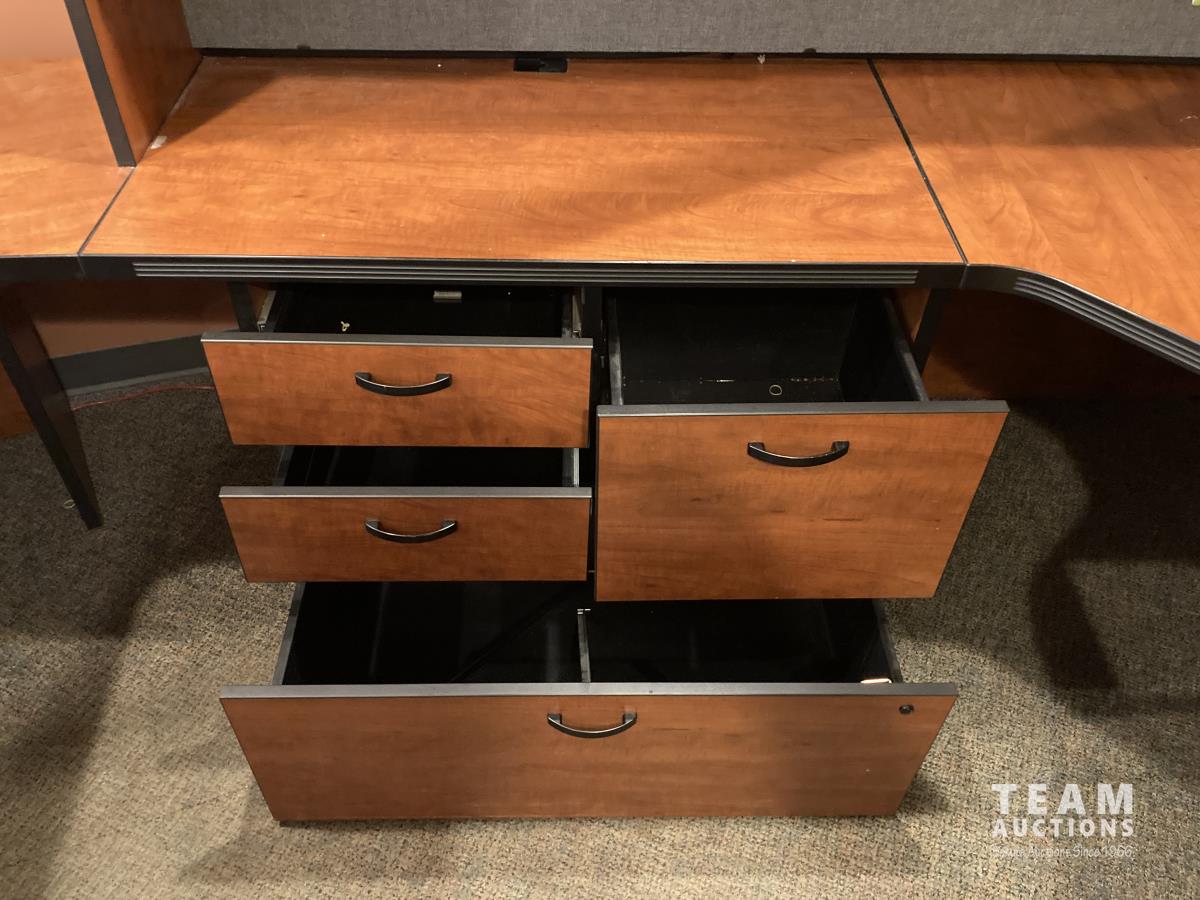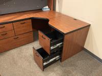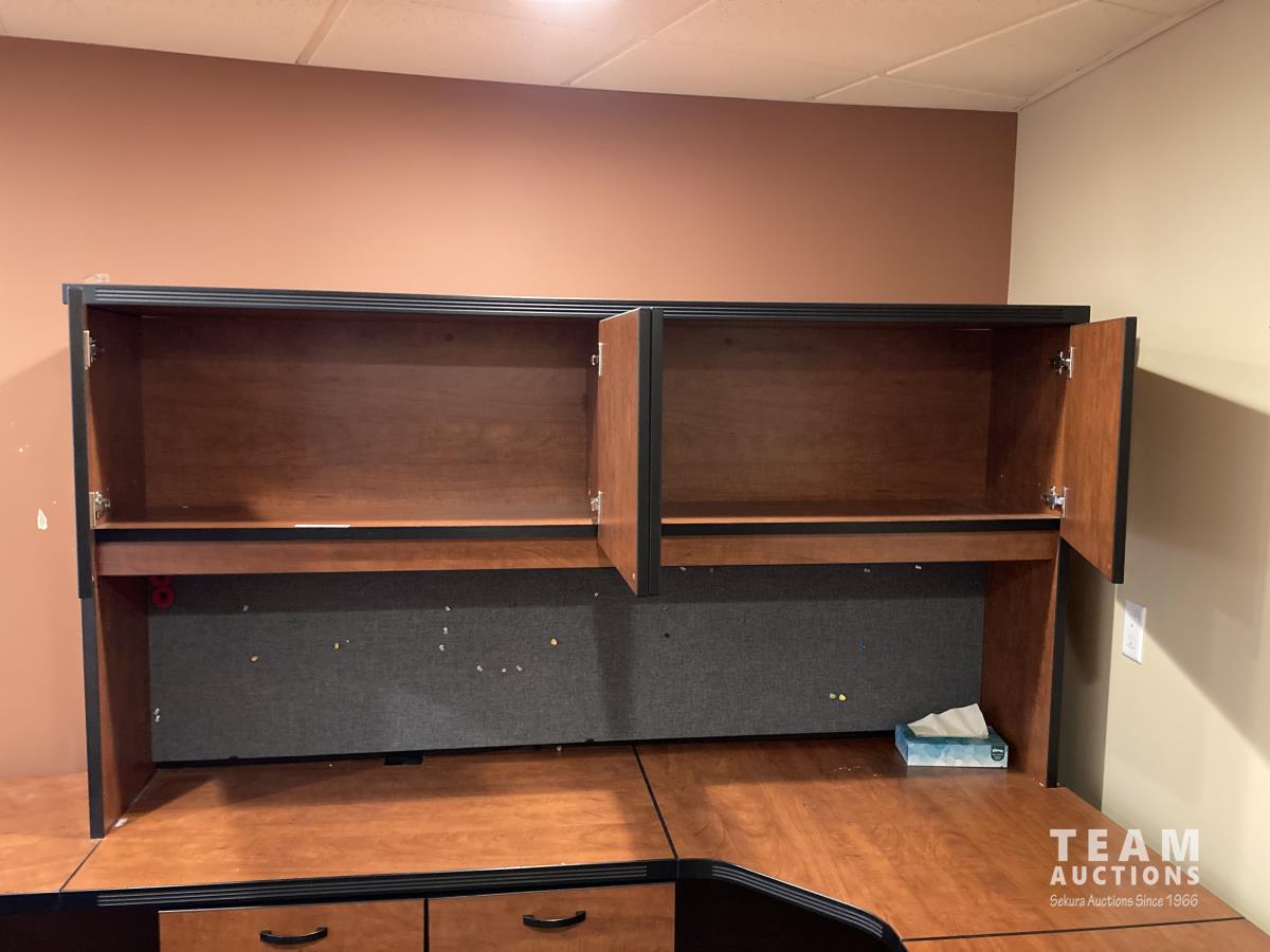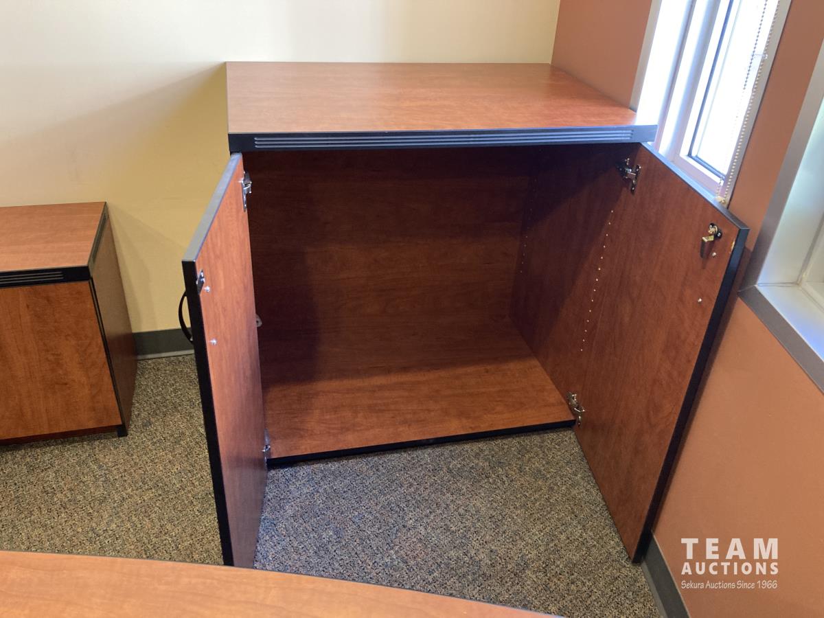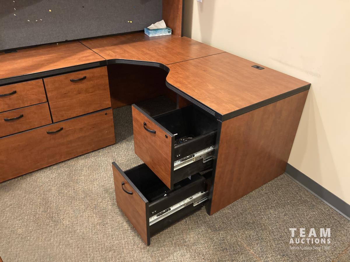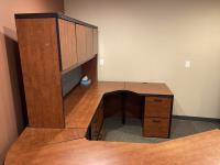 Main desk 48 inch x 72 inch x 29 inch, side desk with cabinet 36 inch x 95 inch x 70 inch, end desk 30 inch x 30 inch x 29 inch, separate cabinets 24 inch x 36 inch x 36 inch and 15 inch x 36 inch x 21-1/2 inch