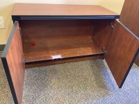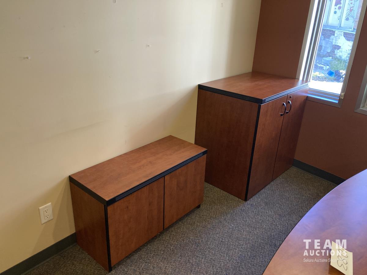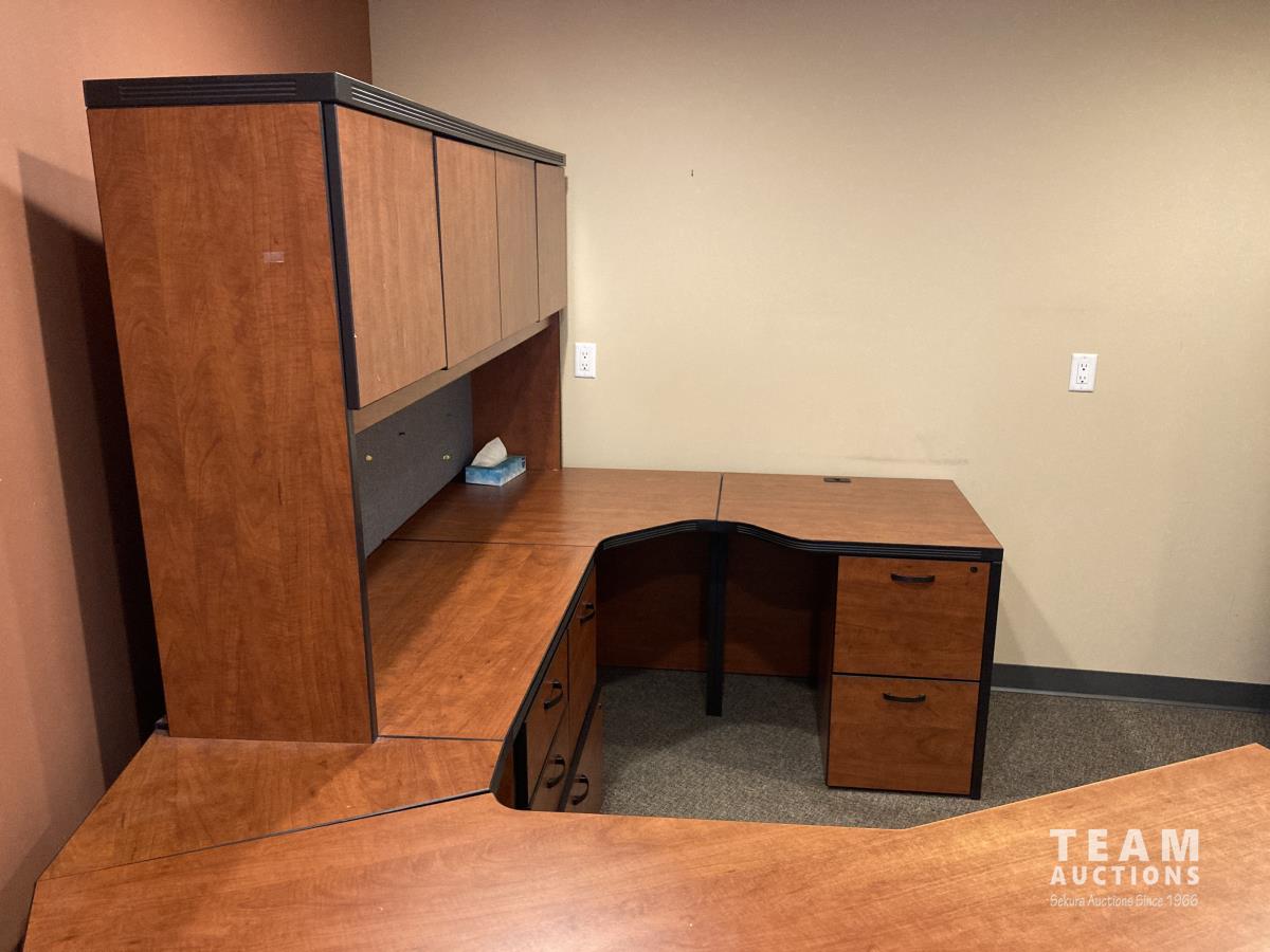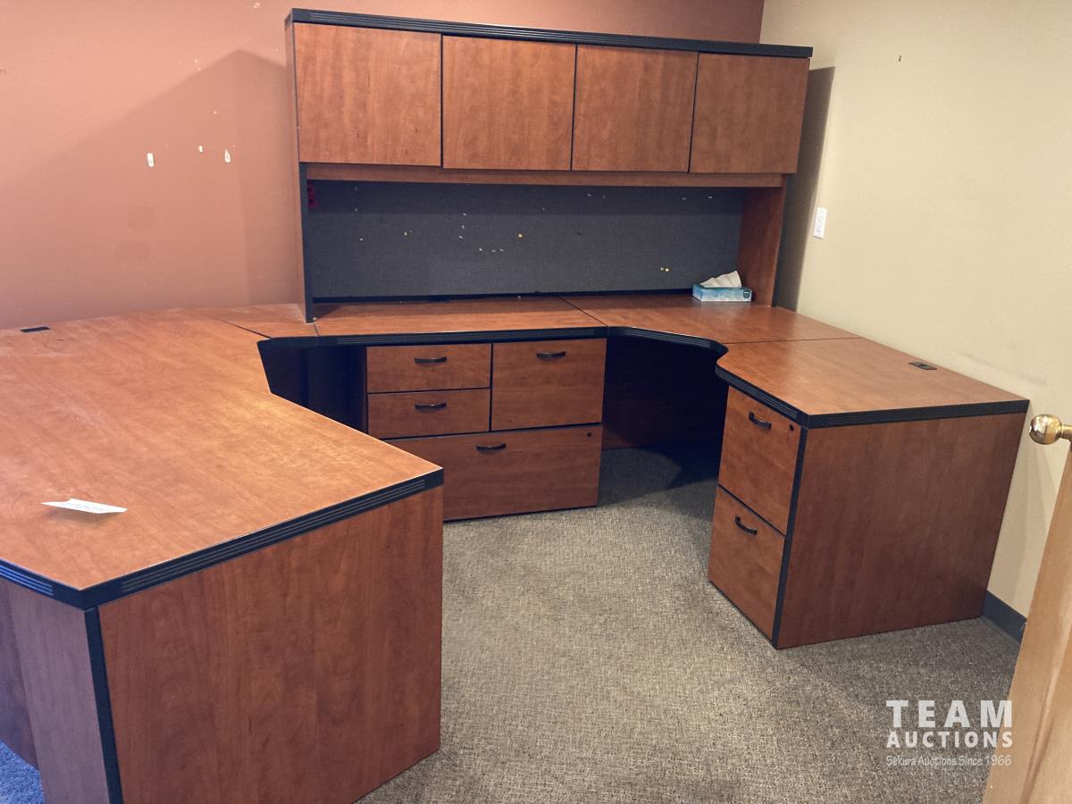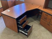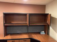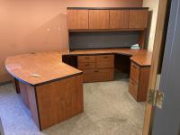 Main desk 48 inch x 72 inch x 29 inch, side desk with cabinet 36 inch x 95 inch x 70 inch, end desk 30 inch x 30 inch x 29 inch, separate cabinets 24 inch x 36 inch x 36 inch and 15 inch x 36 inch x 21-1/2 inch