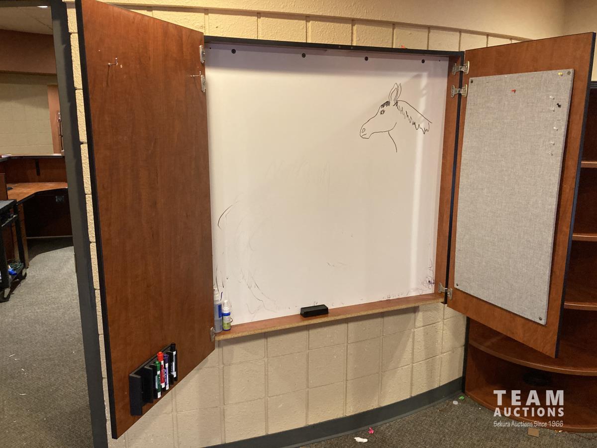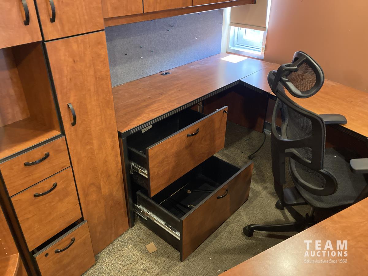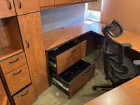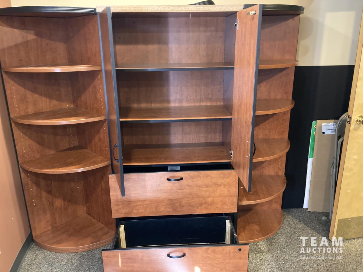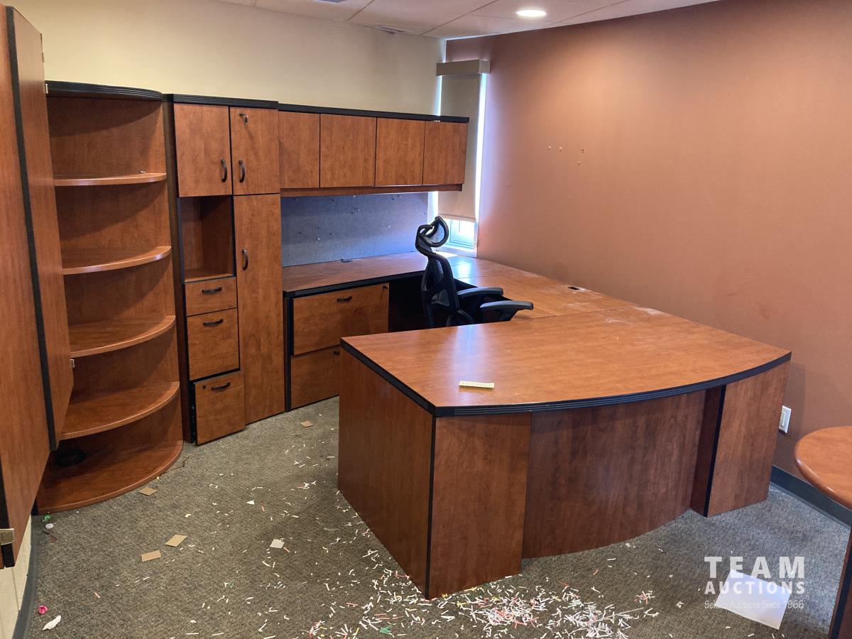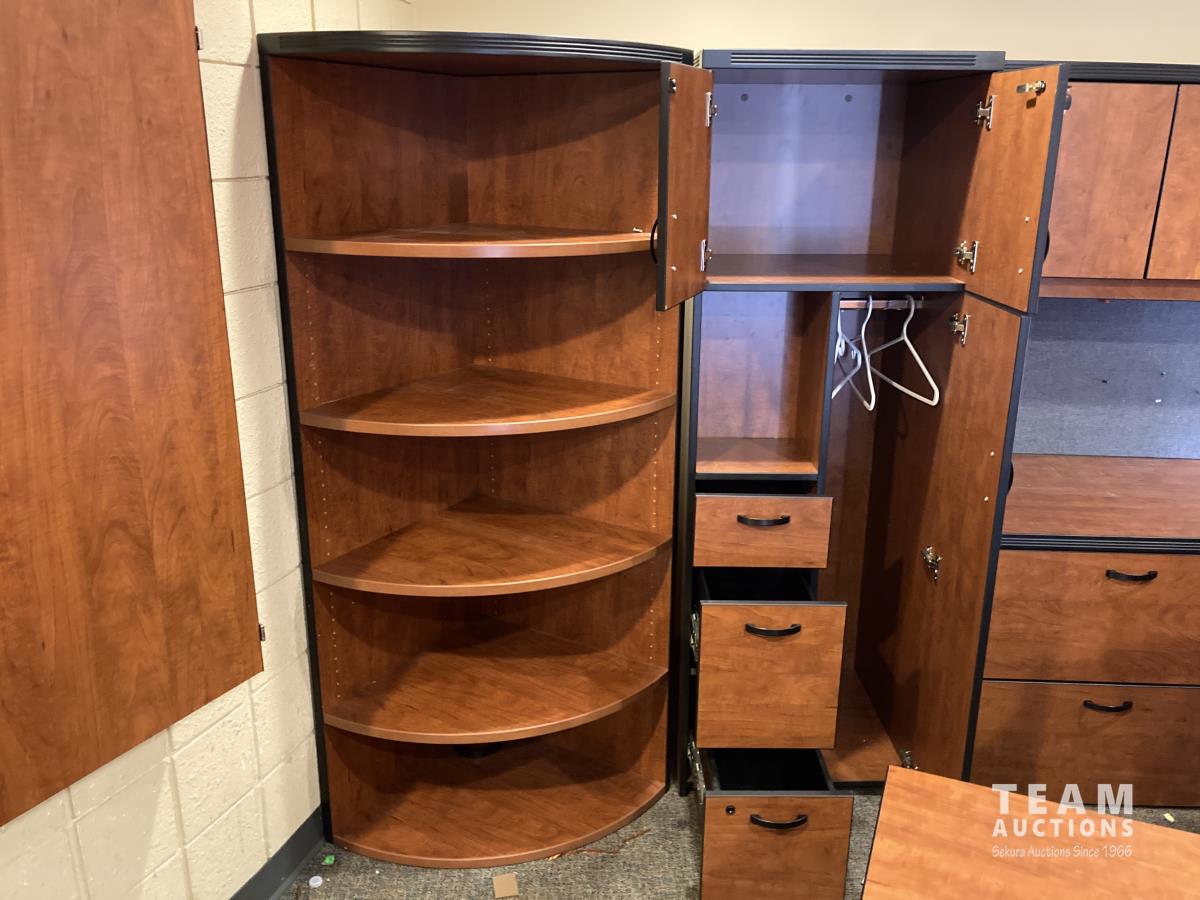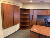 Main desk 72 inch x 105 inch x 29 inch, side desk with cabinets 24 inch x 72 inch x 70 inch, end cabinet 24 inch x 24 inch x 70 inch, pie shape shelf 24 inch x 33 inch x 70 inch, (2) pie shaped shelves 21 inch x 28 inch x 70 inch, separate cabinet 20 inch x 36 inch x 70 inch, white board cabinet 8 inch x 48 inch x 48 inch, round table 30 inch diameter x 29 inch