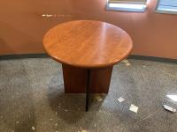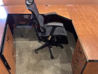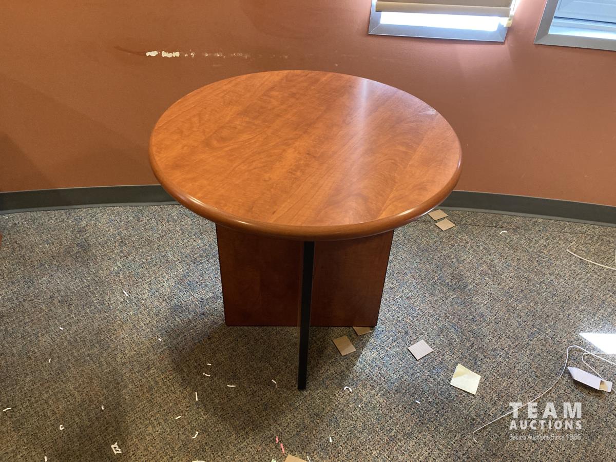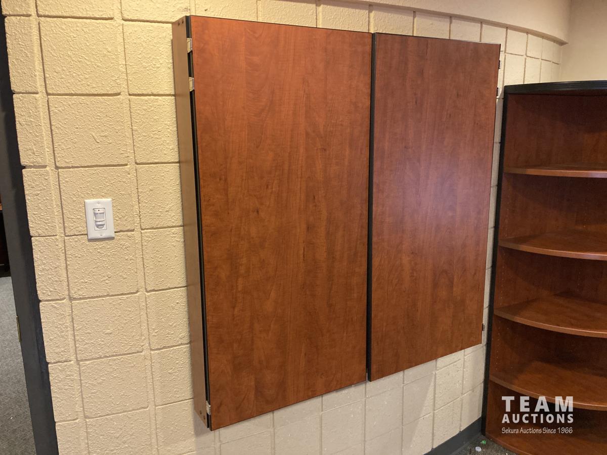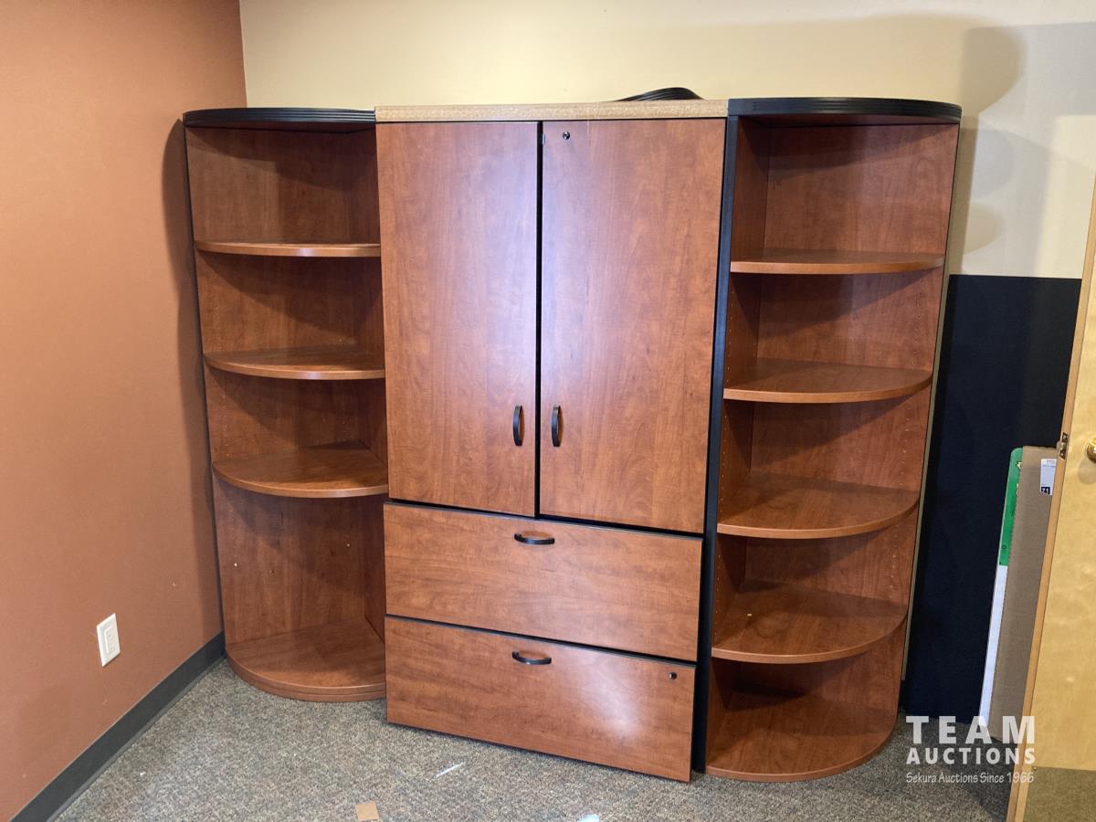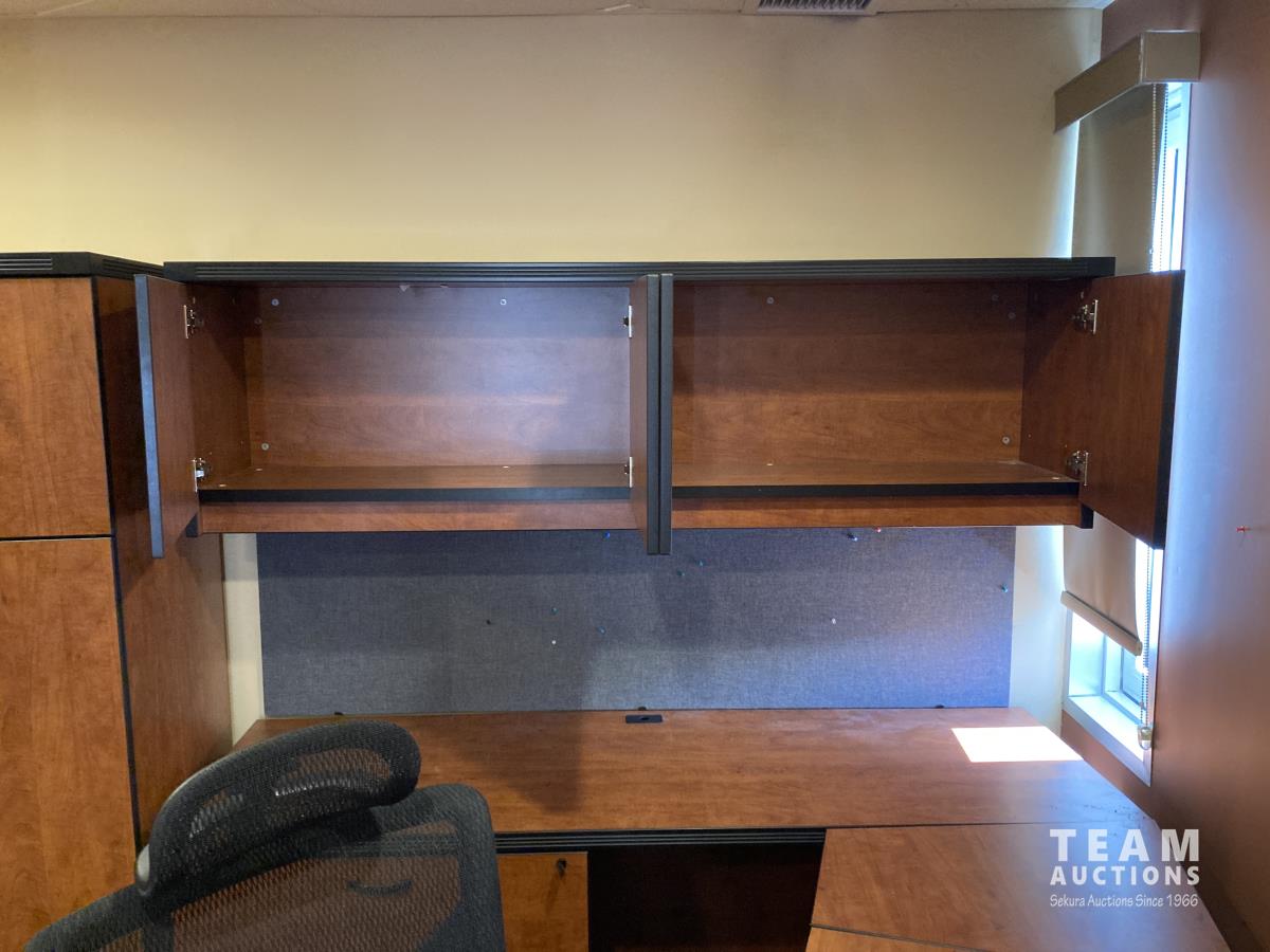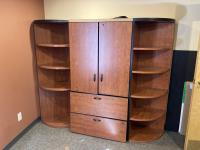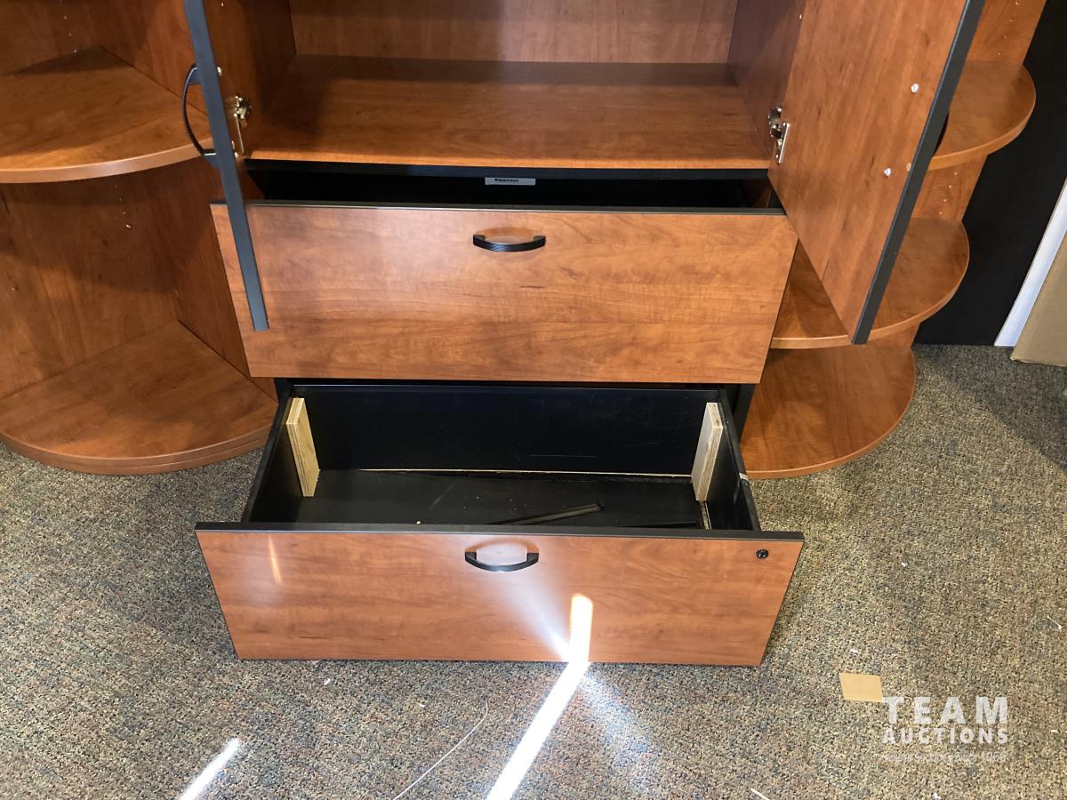 Main desk 72 inch x 105 inch x 29 inch, side desk with cabinets 24 inch x 72 inch x 70 inch, end cabinet 24 inch x 24 inch x 70 inch, pie shape shelf 24 inch x 33 inch x 70 inch, (2) pie shaped shelves 21 inch x 28 inch x 70 inch, separate cabinet 20 inch x 36 inch x 70 inch, white board cabinet 8 inch x 48 inch x 48 inch, round table 30 inch diameter x 29 inch
