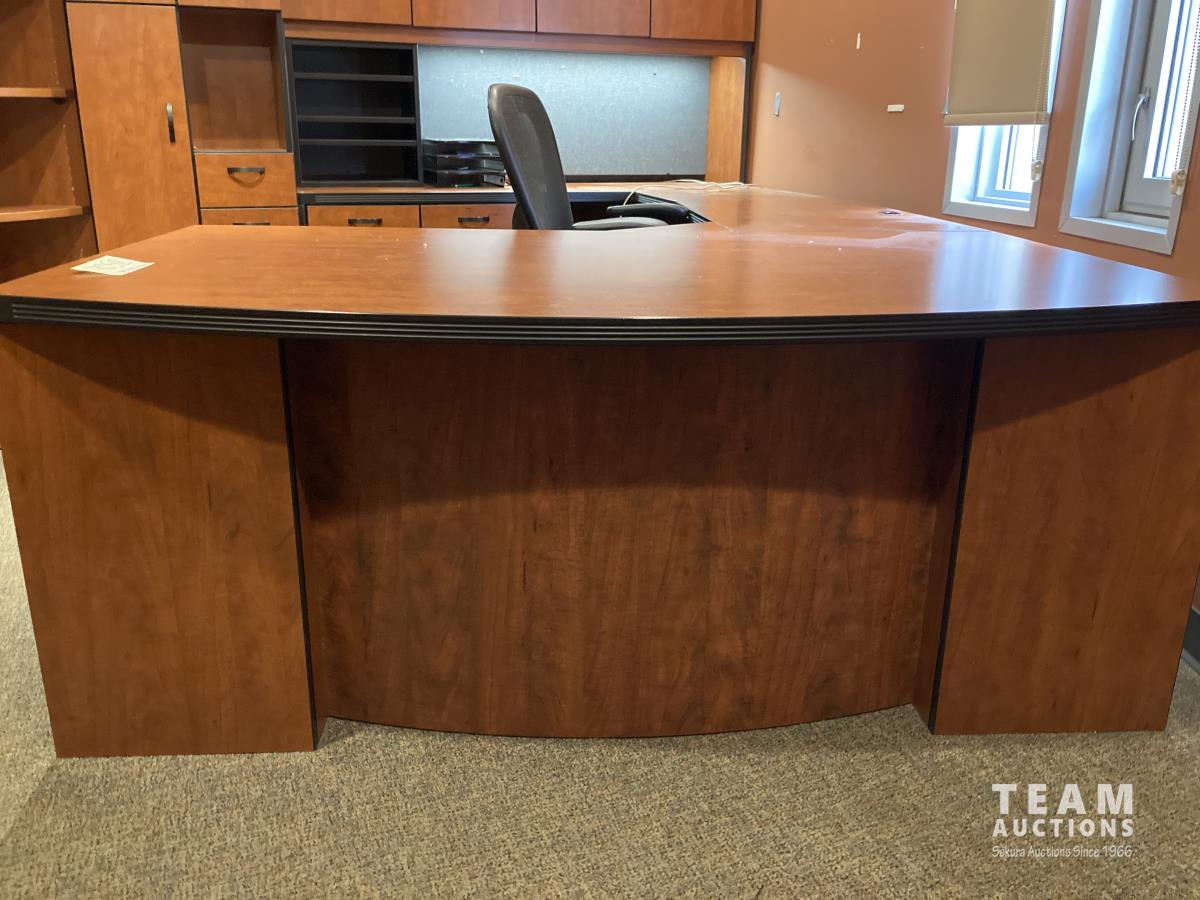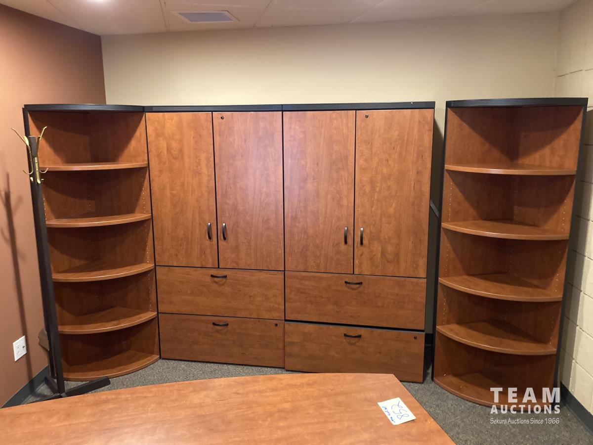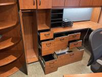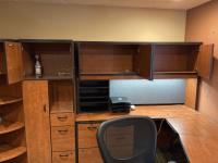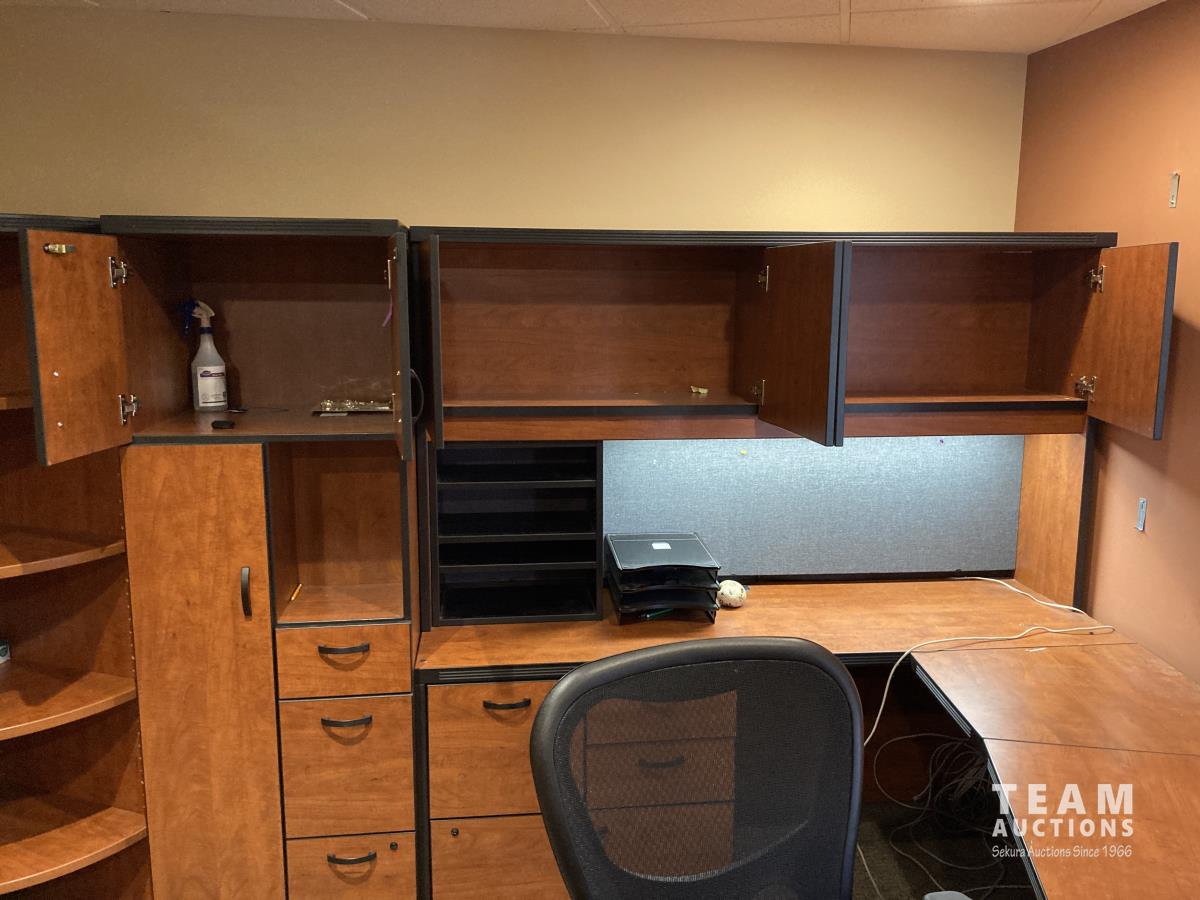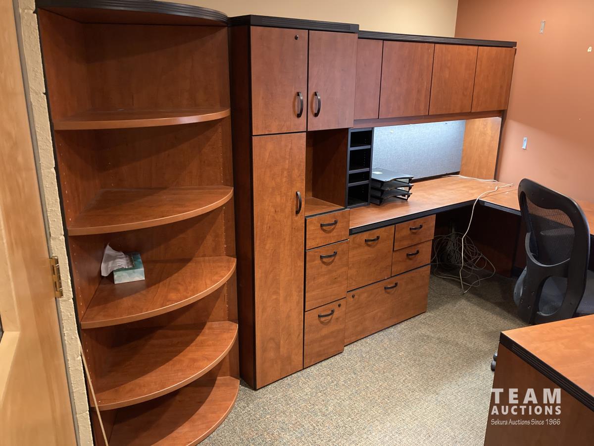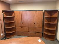 Main desk 72 inch x 105 inch x 29 inch, side desk with cabinets 24 inch x 72 inch x 70 inch, end cabinet 24 inch x 24 inch x 70 inch, pie shaped shelves 24 inch x 33 inch x 70 inch, separate cabinets 20 inch x 36 inch x 70 inch