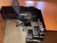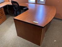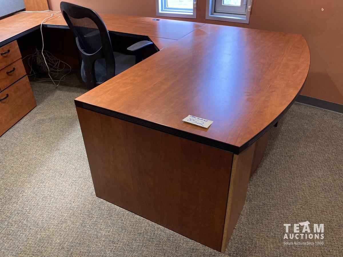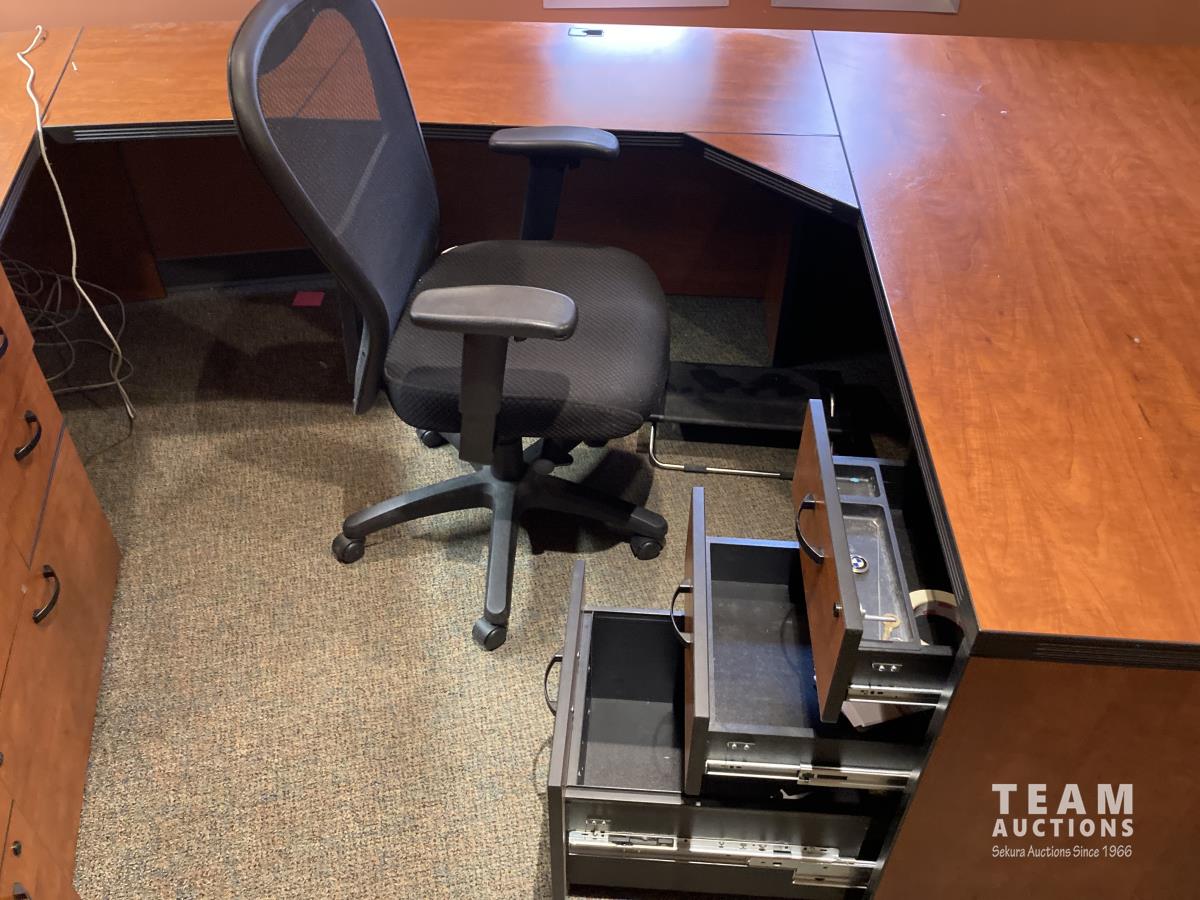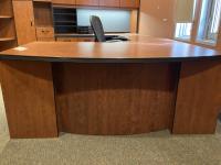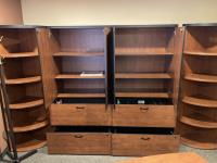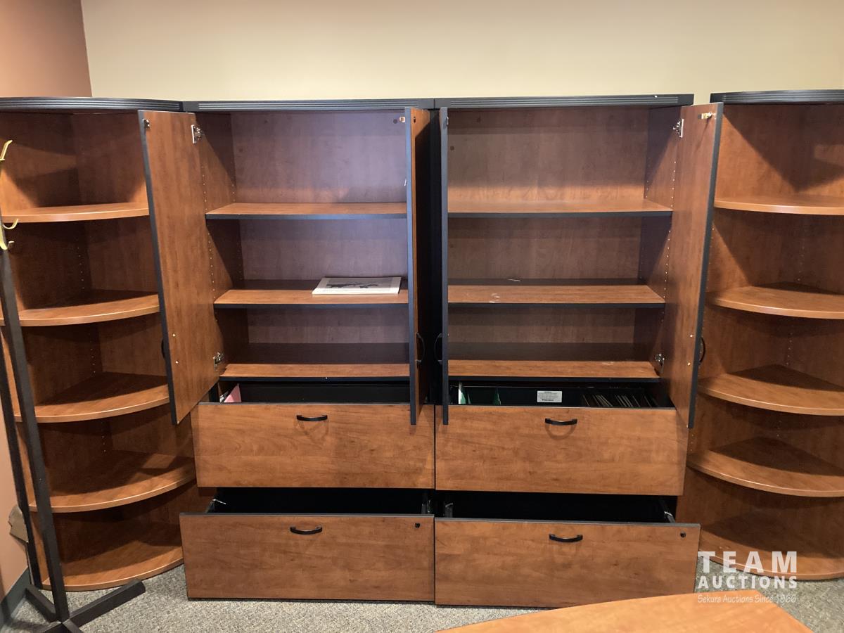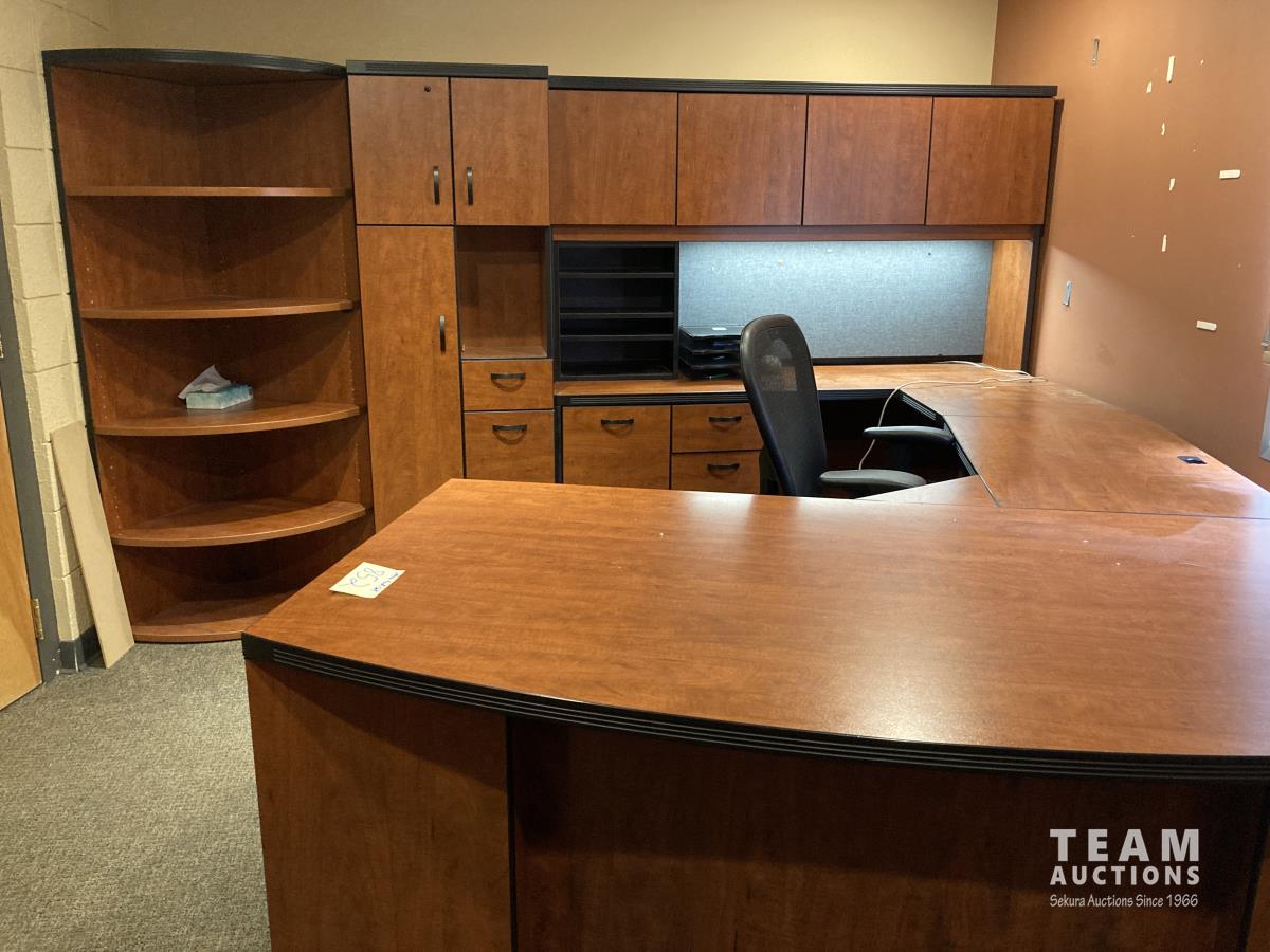 Main desk 72 inch x 105 inch x 29 inch, side desk with cabinets 24 inch x 72 inch x 70 inch, end cabinet 24 inch x 24 inch x 70 inch, pie shaped shelves 24 inch x 33 inch x 70 inch, separate cabinets 20 inch x 36 inch x 70 inch