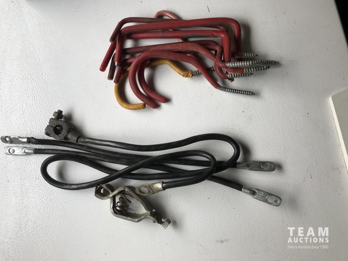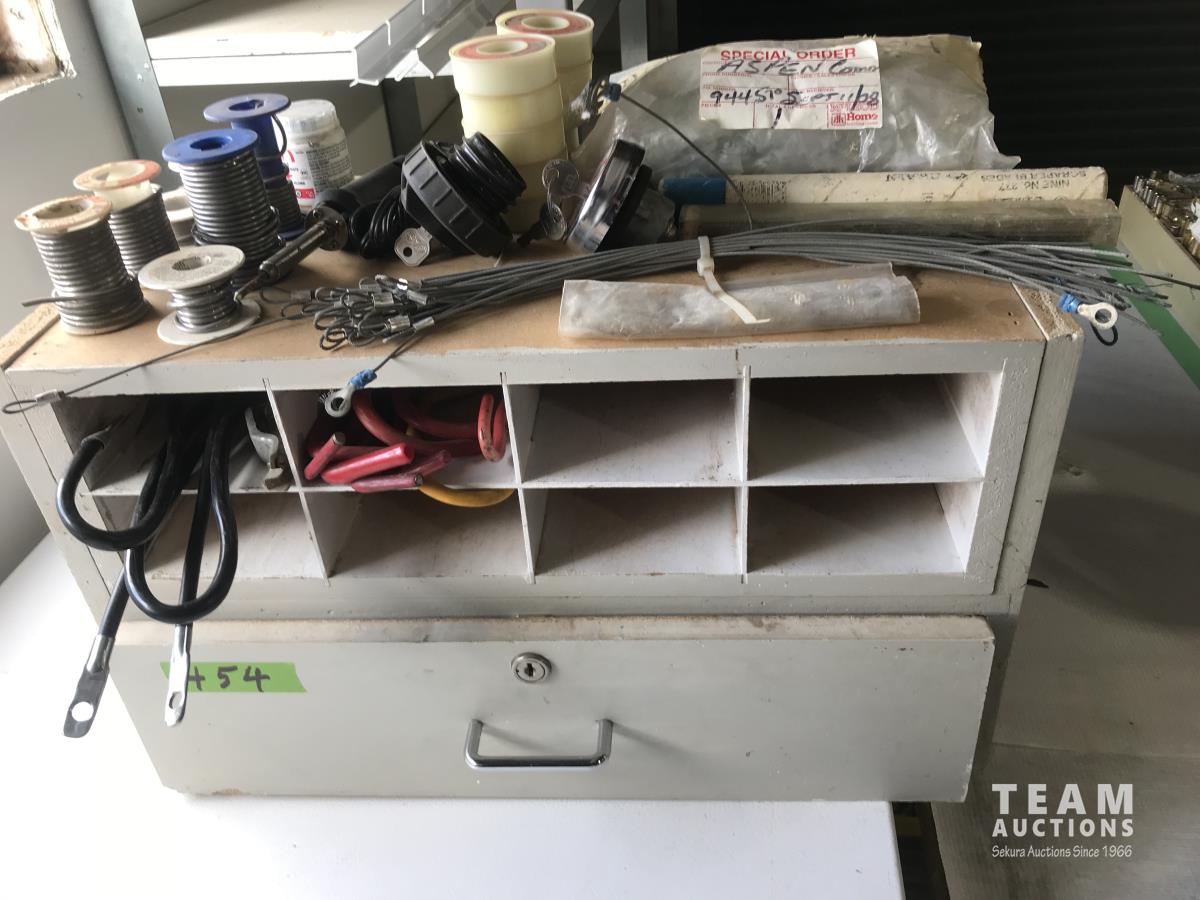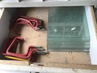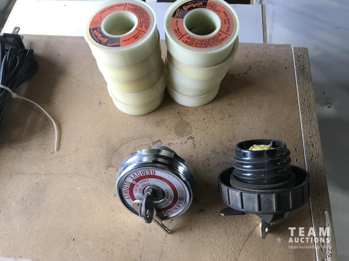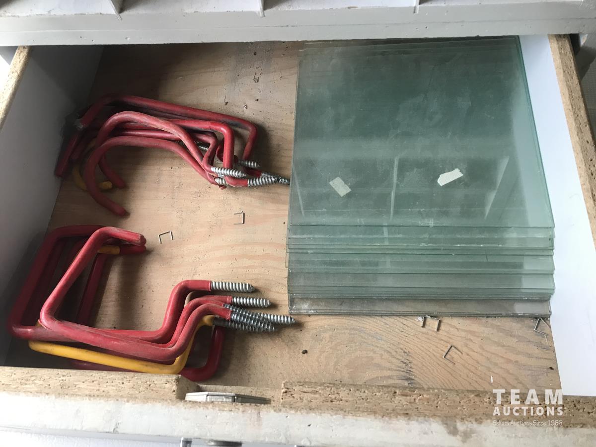 Wood cabinet, window inserts, Teflon tape, soldering iron, 7 inch window panes, locking gas caps, miscellaneous hooks, scraper blades, cable & crimps