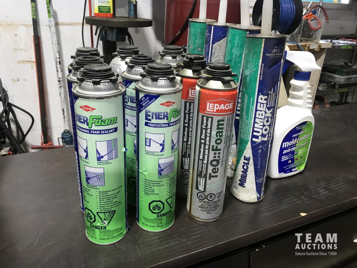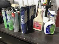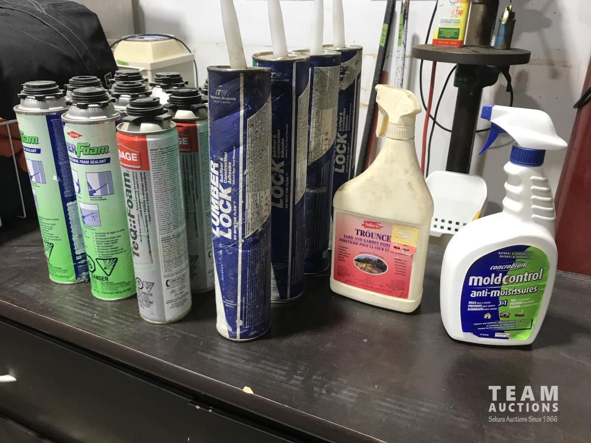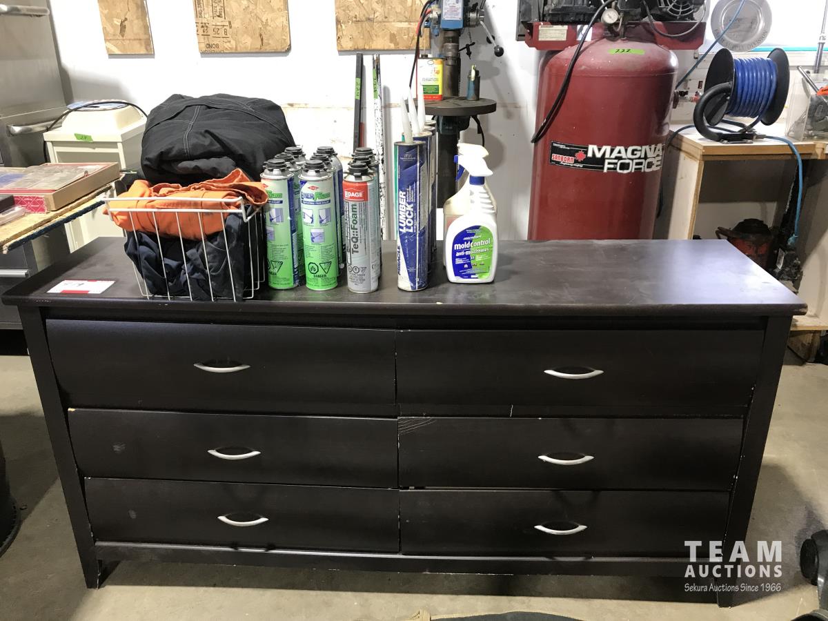 6 drawer dresser, 30 inch x22 inch porcelain sink, (3) pairs of coveralls, (1) snowsuit), (9) cans of window and door foam, (4) lumber lock, tool bag, gun case and dehorners.