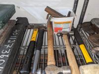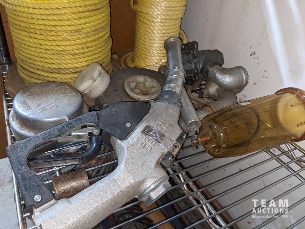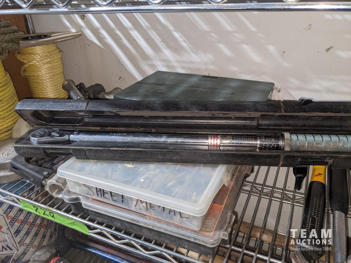 1/2 inch torque wrench, nylon rope, OPW fuel nozzle, sheet metal screws, various hammers, hex keys