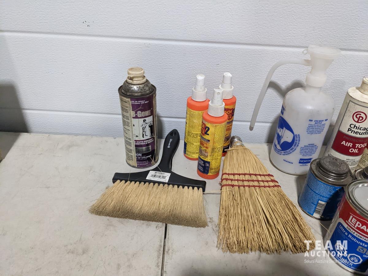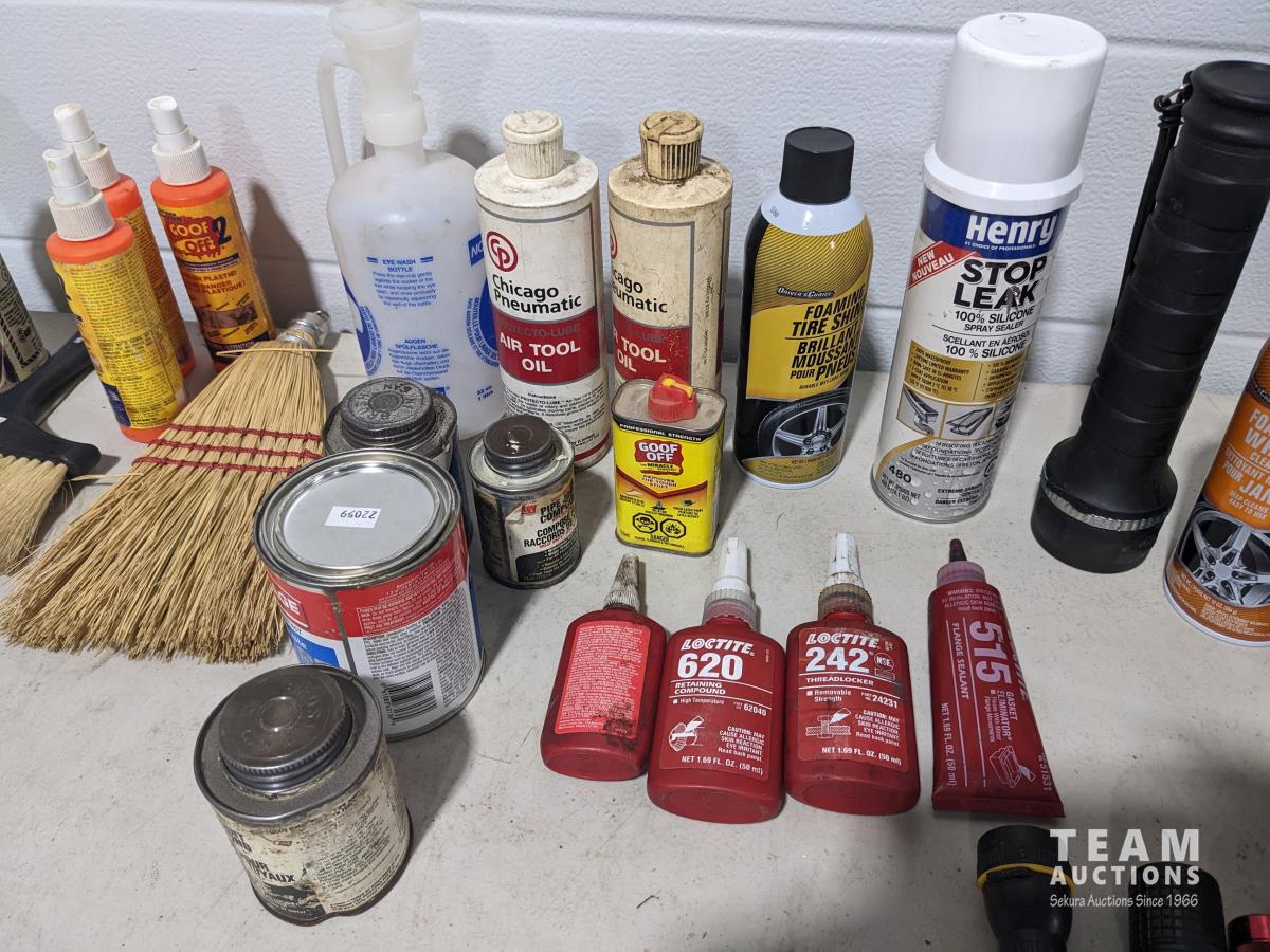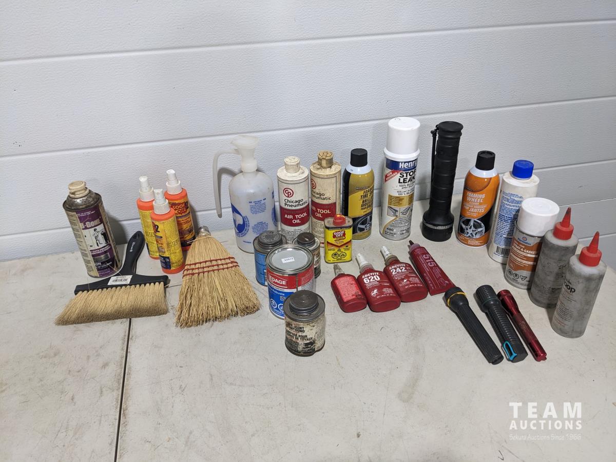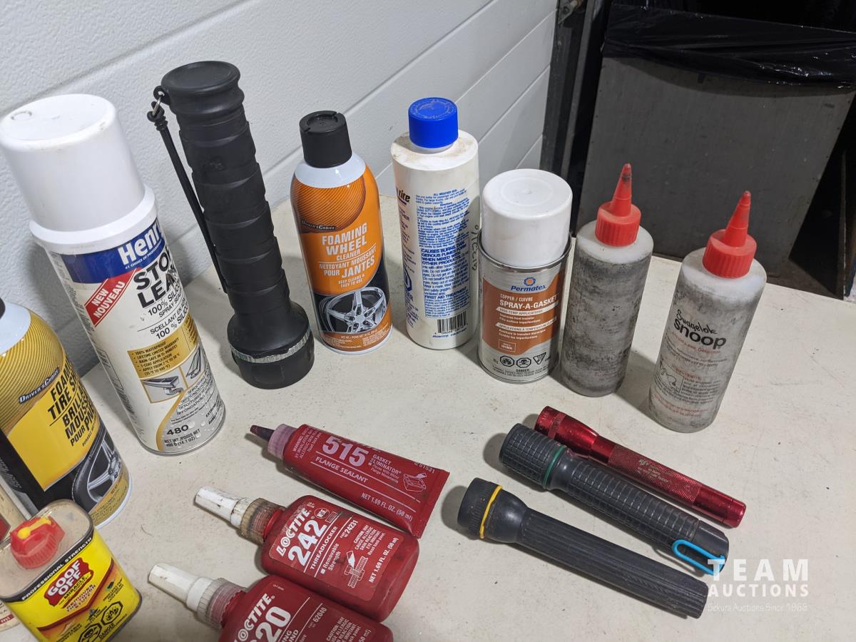 Loctite, snoop bottles, brushes, vehicle cleaning supplies, eyewash, flashlights