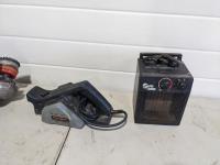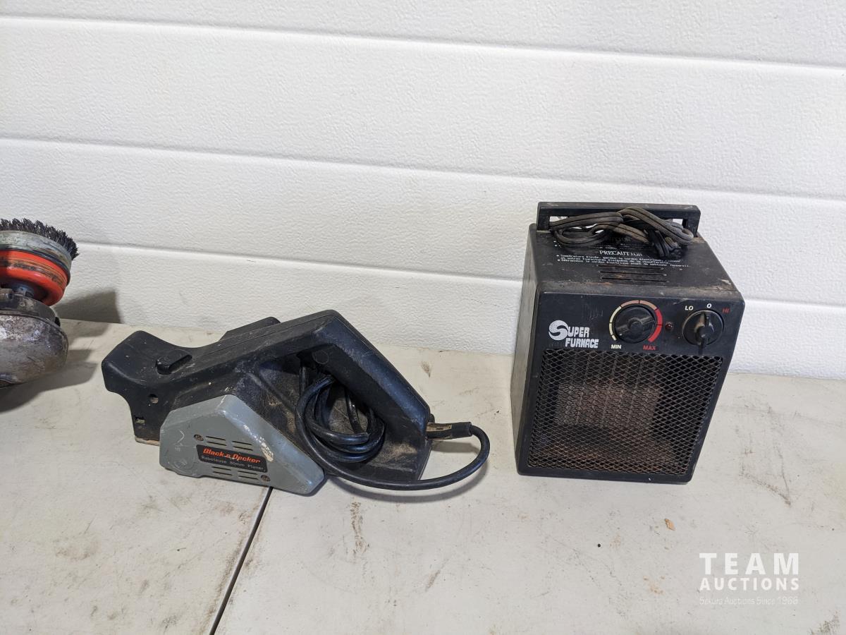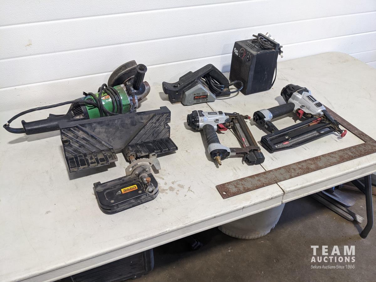 Hitachi grinder, Black and Decker planer, (2) Husky brad nailer, electric heater