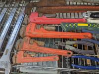 Combination wrenches, pipe wrenches, vise grips, pliers, hatchet, box cutter
