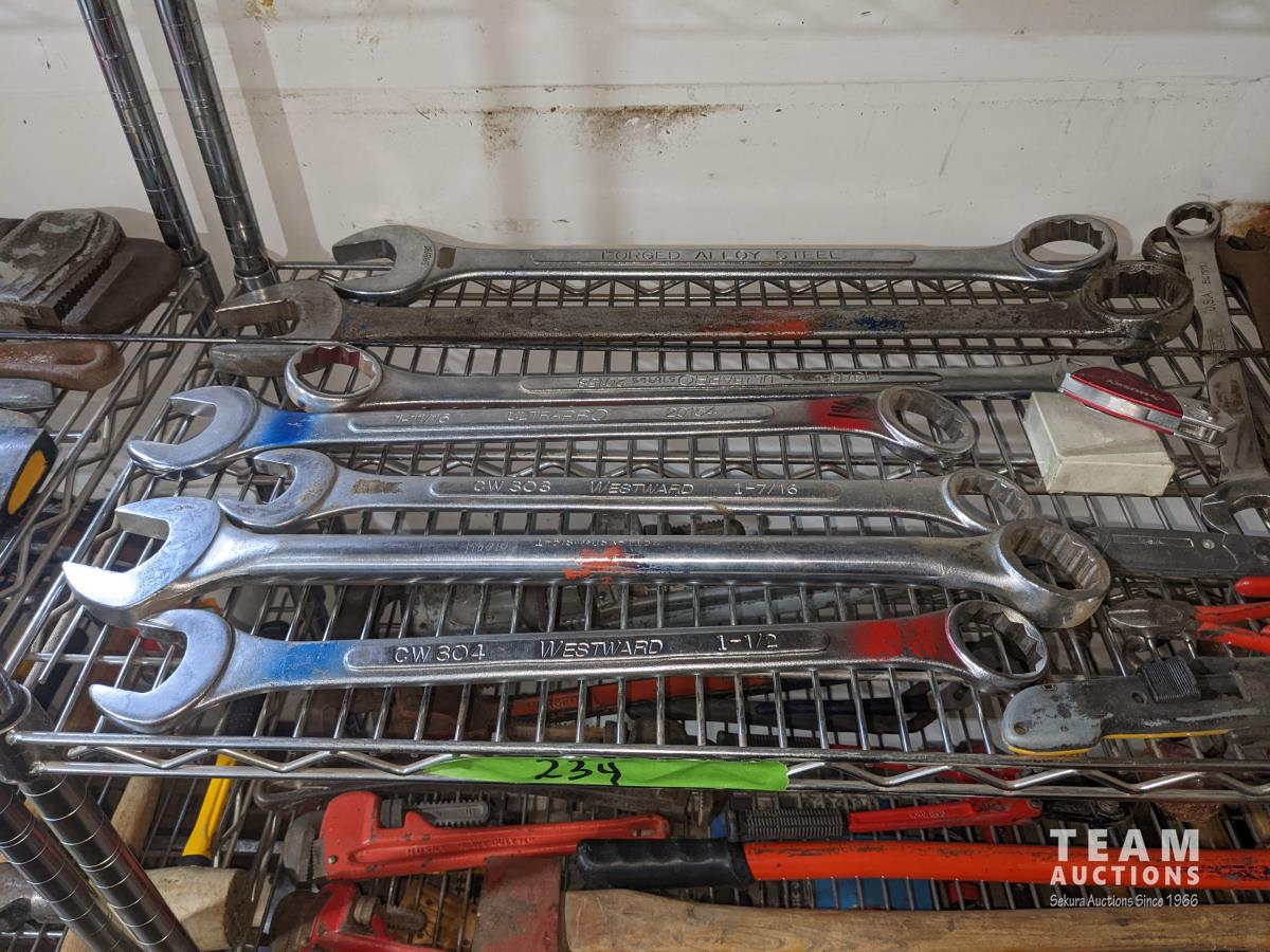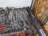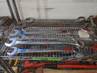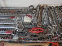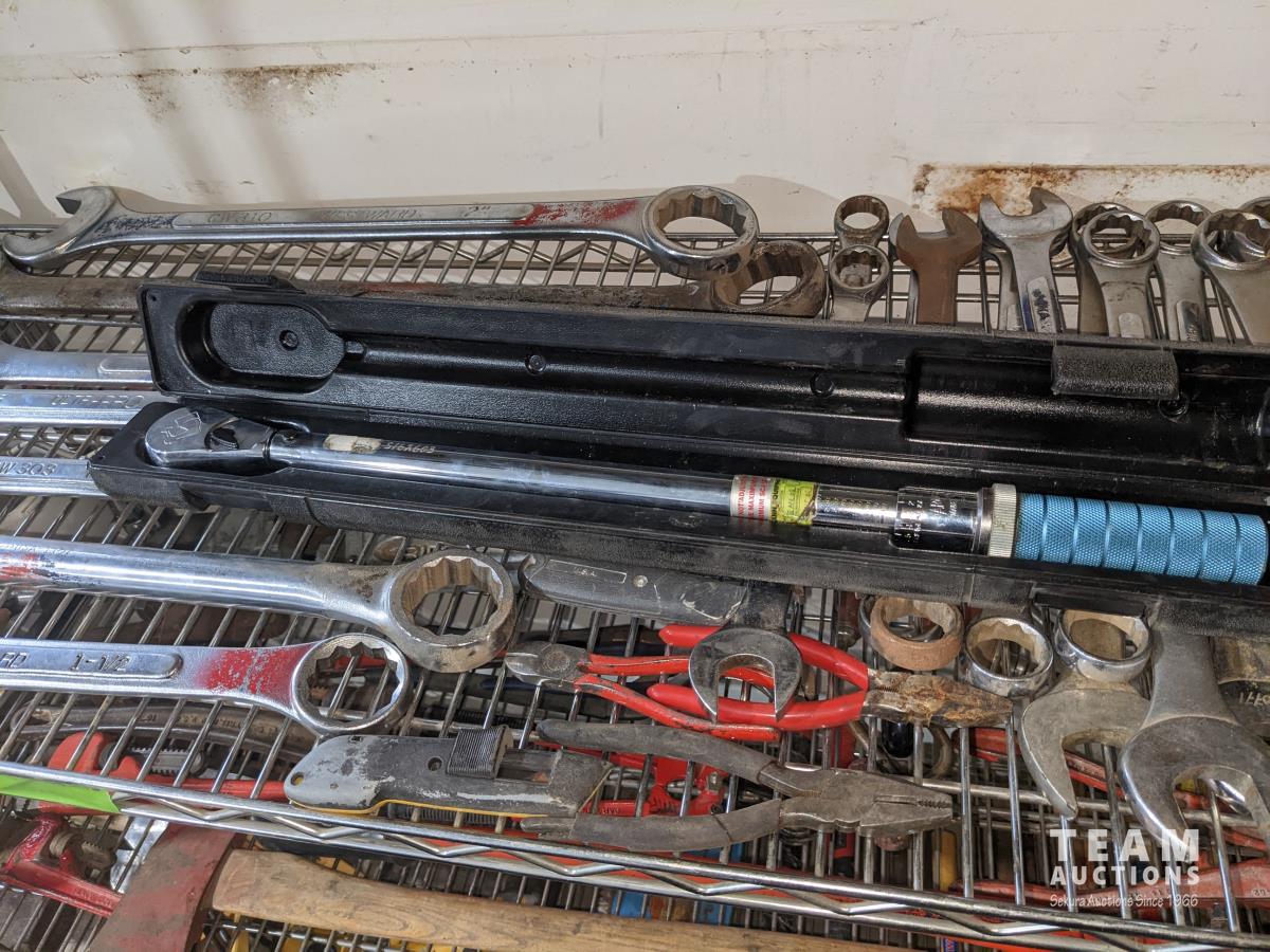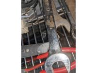 Large combination wrenches,1/2 inch torque wrench, pliers, box cutter