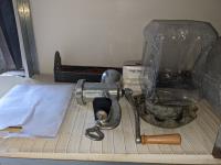 Hand meat grinder, hinges, digital scale, chicken waterer, rechargeable search light, solar yard light, washer fluid, towels