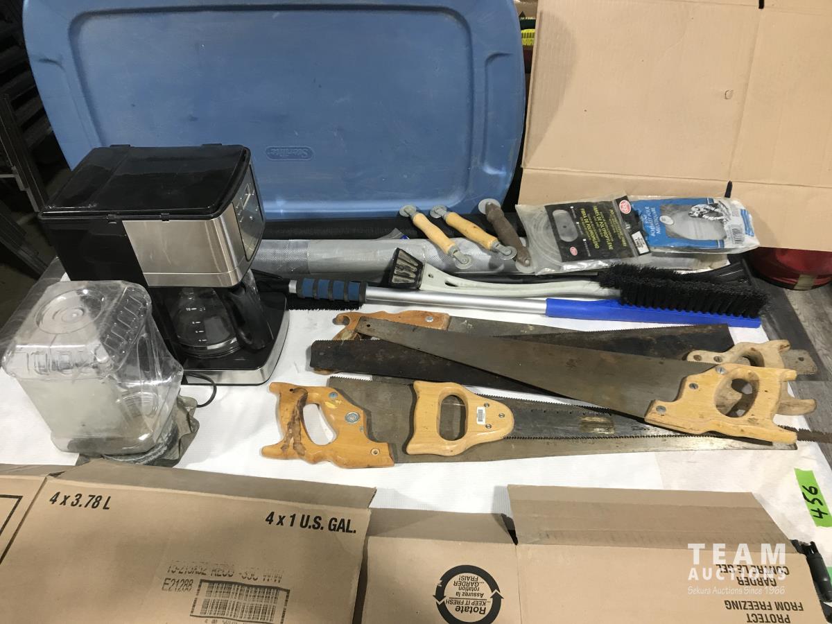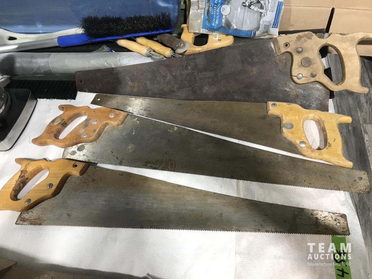 (4) hand saws, tree pruning saw, wire & nylon mesh screen, window scrapper, chicken waterer, coffee pot