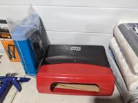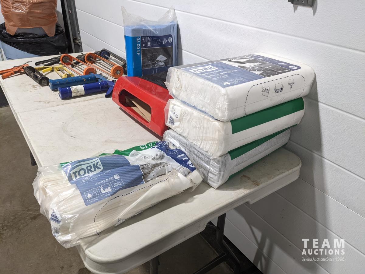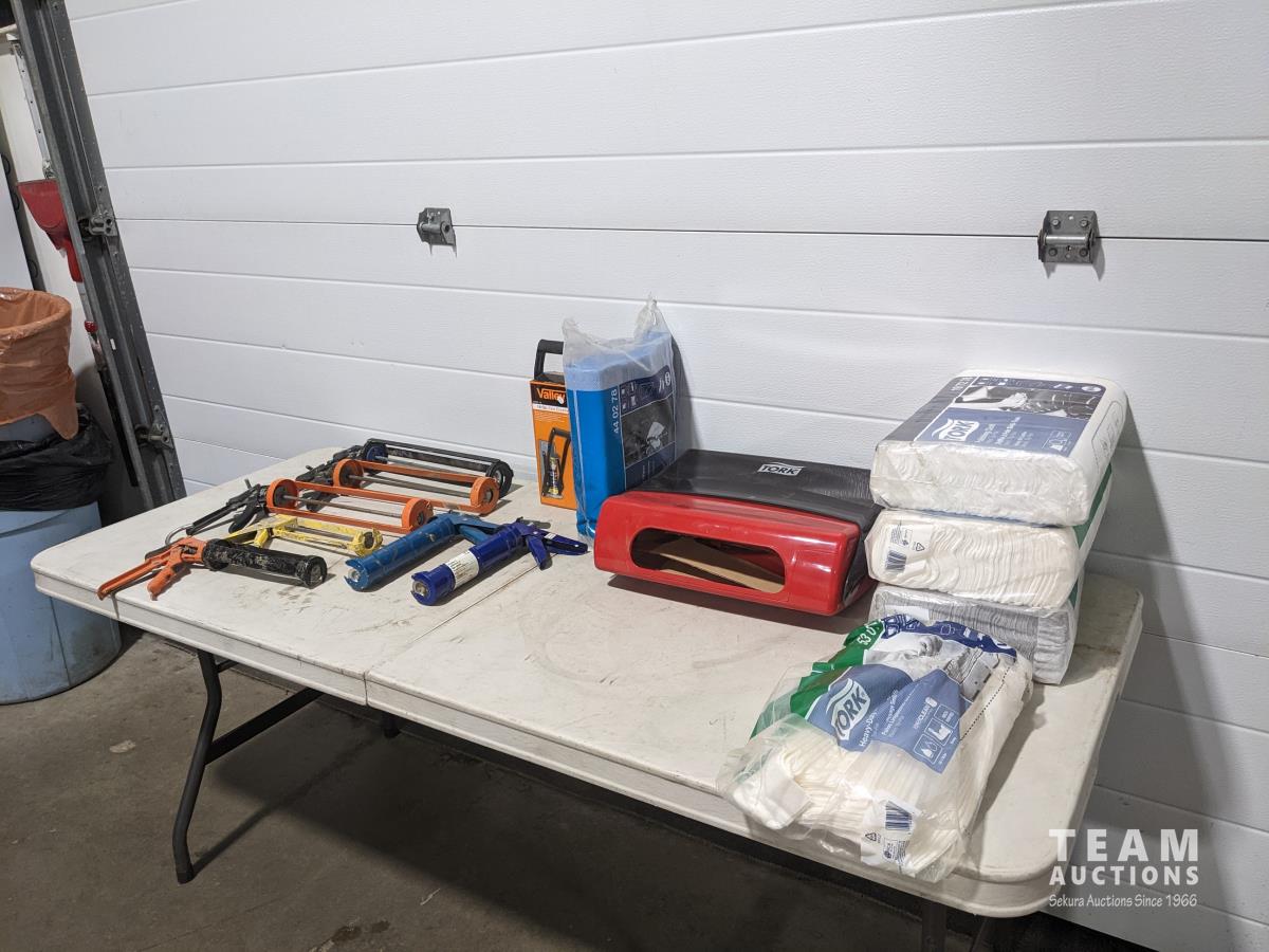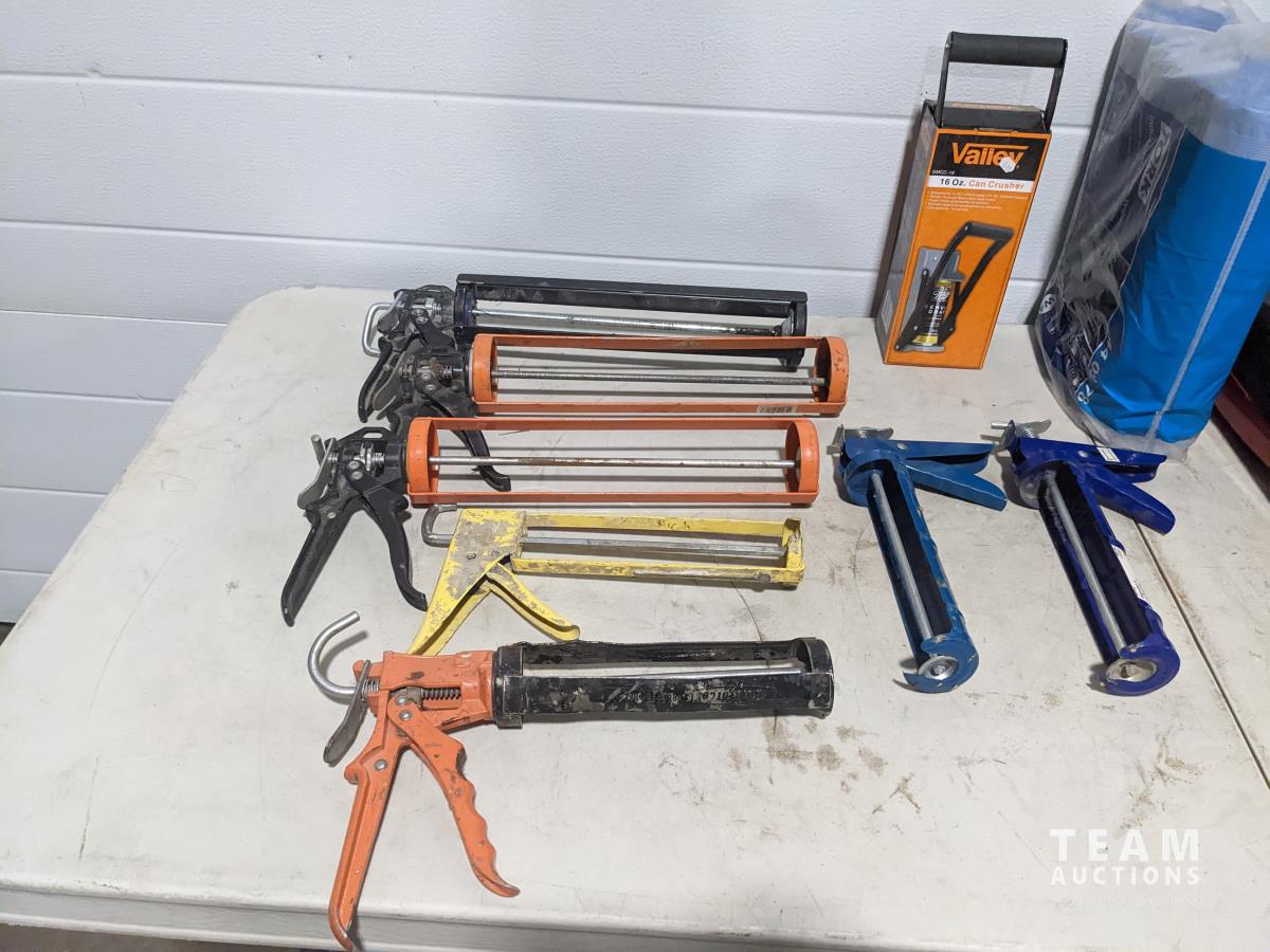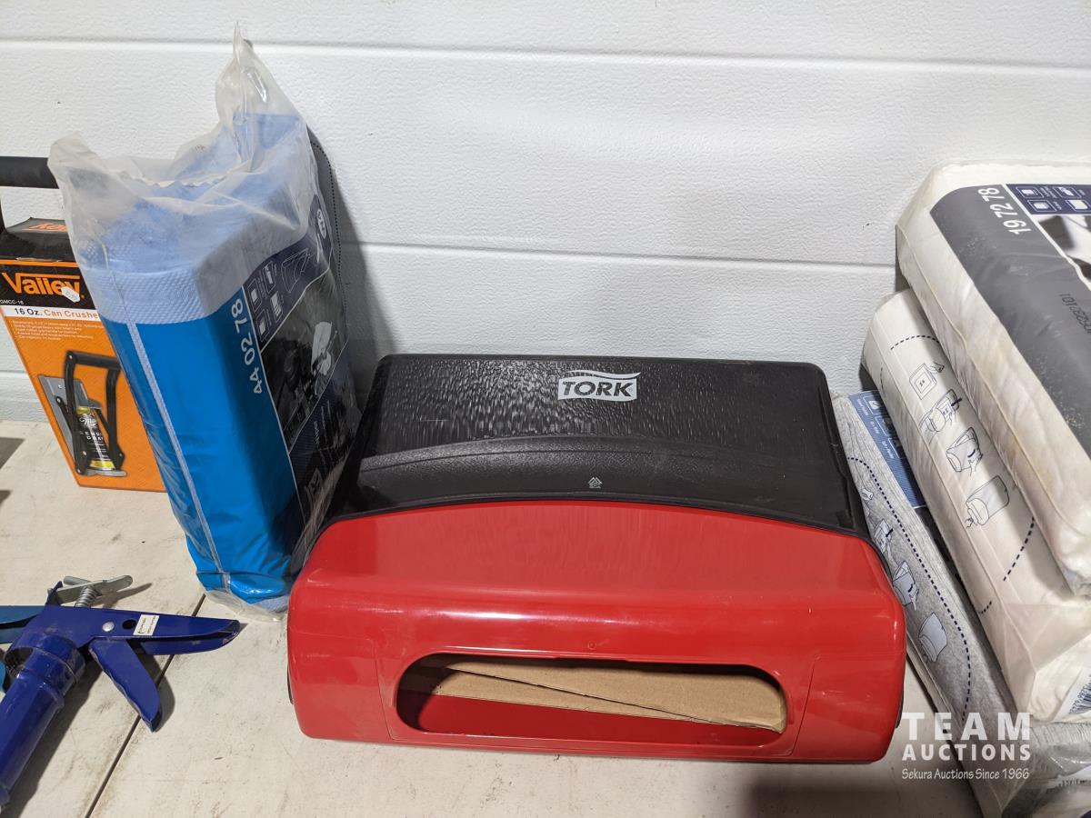 Caulking guns, can crusher, paper towel dispenser, paper towels