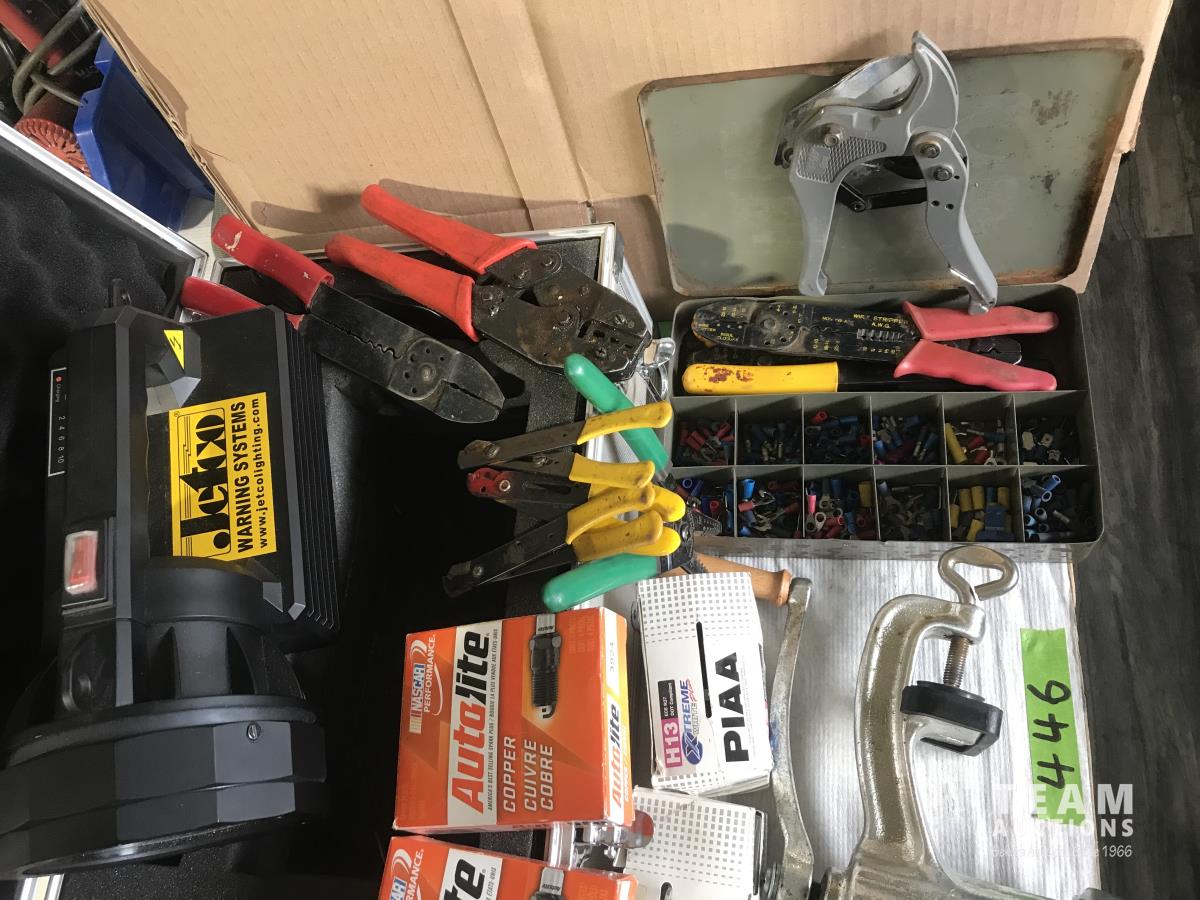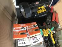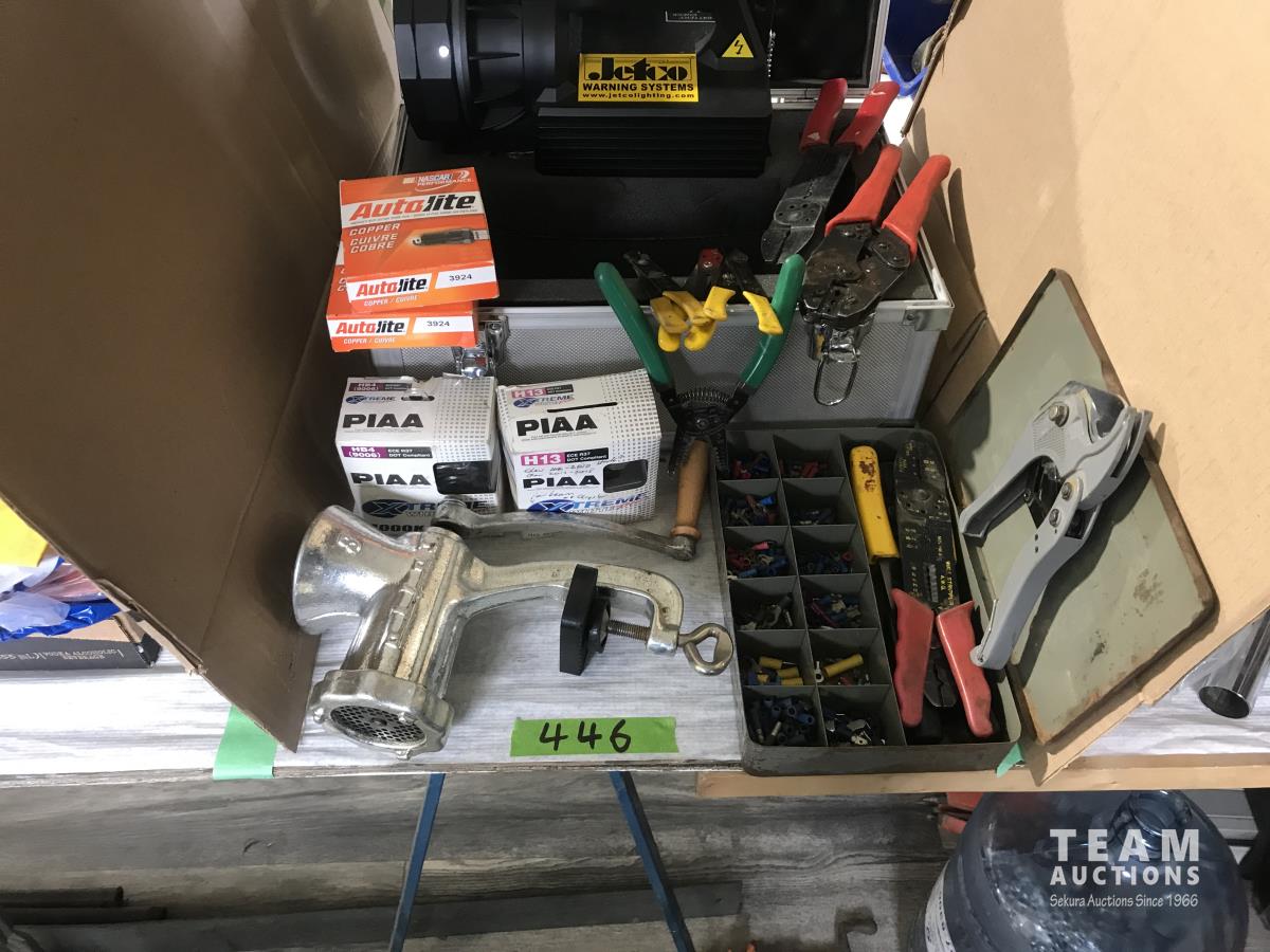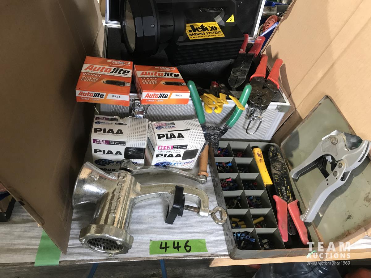 Rechargeable search light, meat grinder, spark plugs, automotive wire pliers and connectors, hose cutter, GM headlight bulbs