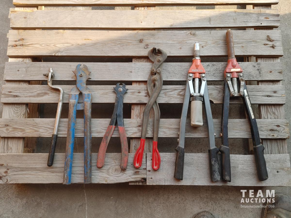 Clutch adjusting wrench, (3) tire chain pliers, (2) long arm riveter.