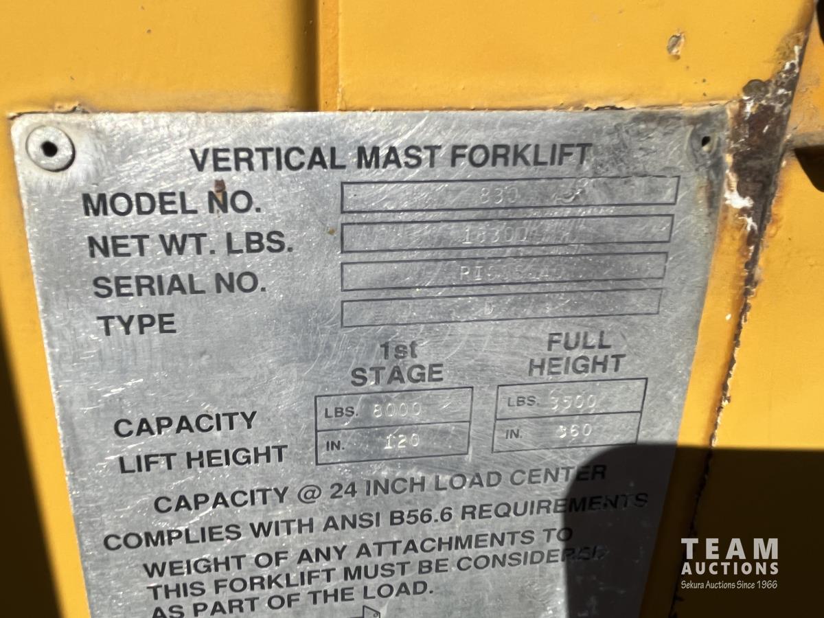 Diesel, 8000 lb lifting capacity, 3 stage mast, side shift, 30 ft lifting height, 24 inch load center, 8 inch to 68 inch fork spread, 14.00-20 front tires, 9.00-15 rear tires
