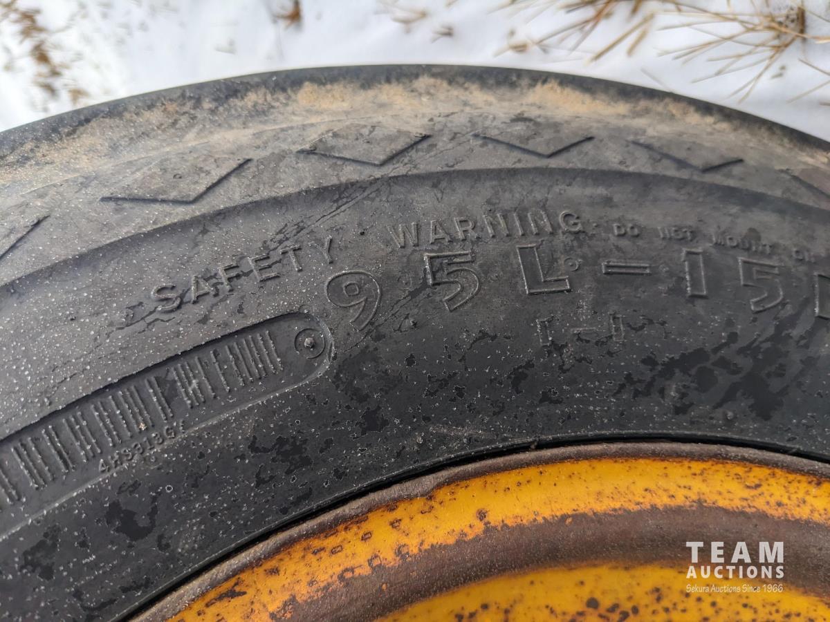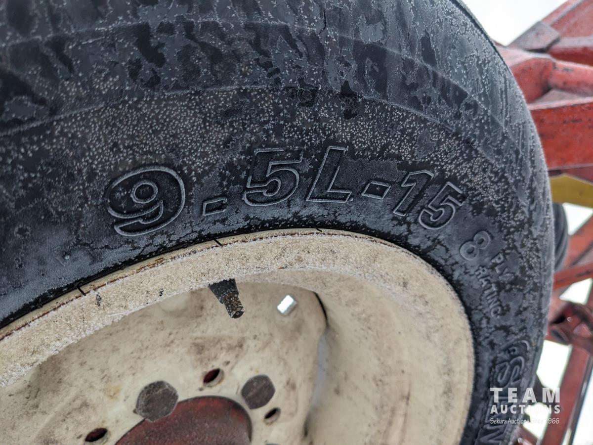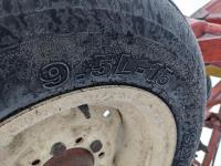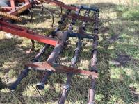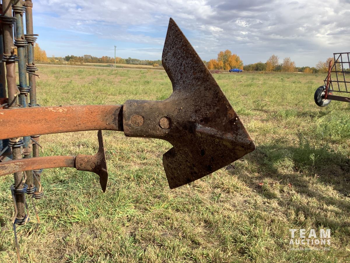 4 bar harrows on main frame and 3 bar on the wings with dual arms, front row has new reversible 4 inch spikes, rows 2 and 3 have new 14 inch sweeps, 9.5L-15 tires