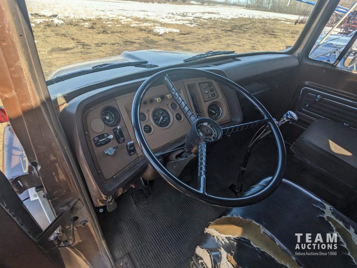 Ford 429 cu in V8 gas engine, 13 speed transmission, spring suspension, 10,860 lb front axle, 34,000 lb rear axles, air brakes, 20 ft steel grain box, Nordic twin cylinder hoist, roll tarp, 3 piece tailgate, 9.00-20 tires
