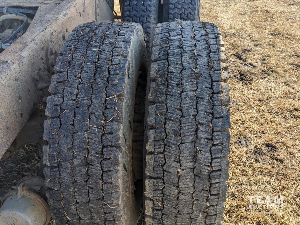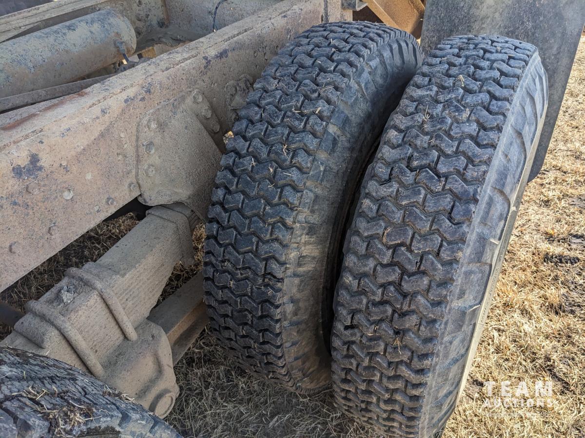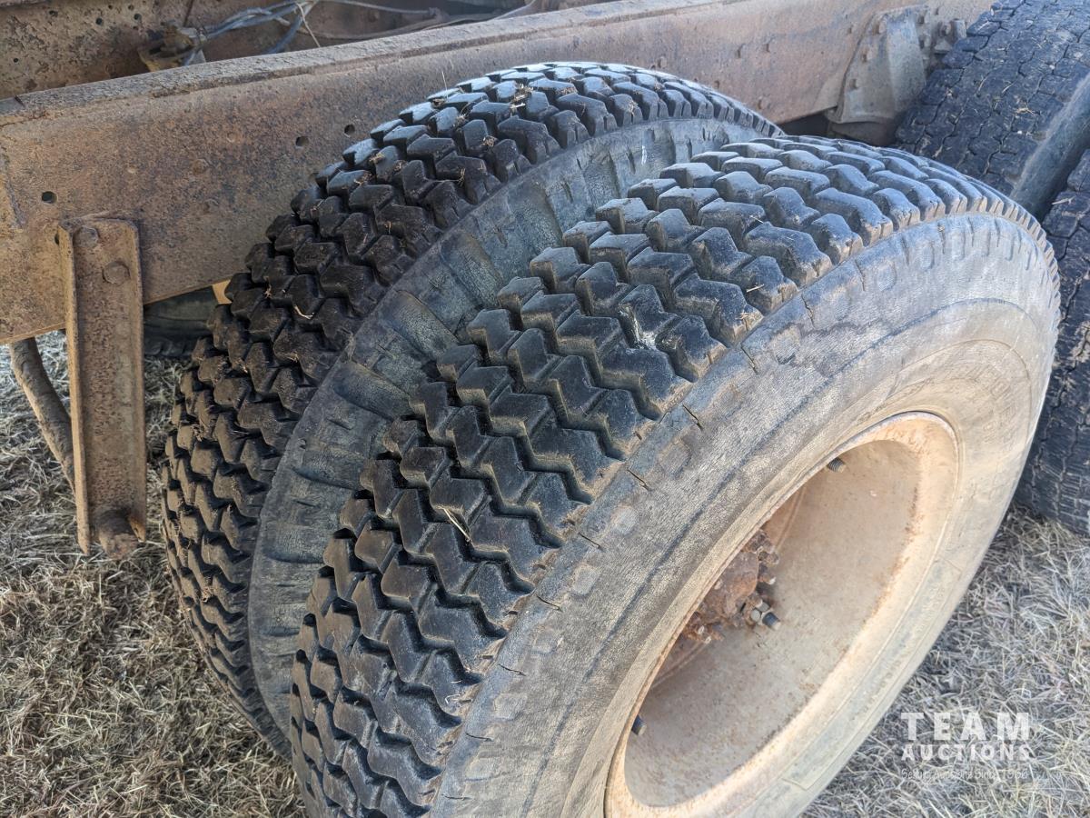 Gmc 427 V8 355 HP gas engine, manual transmission, 18 ft box, spring suspension, 10,860 lb front axle, 32,320 lb rear axles, Nordic twin cylinder hoist, air brakes, 9.00-20 tires