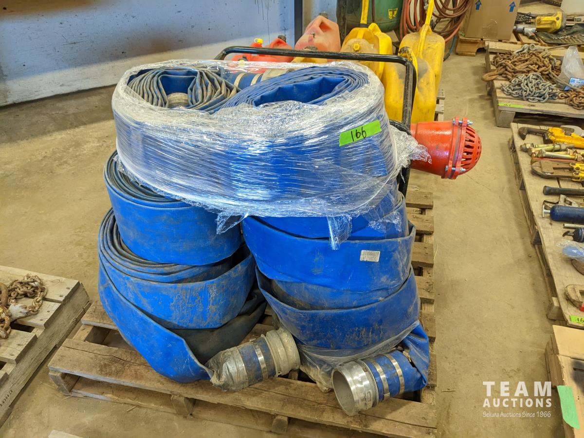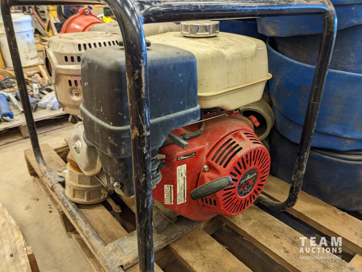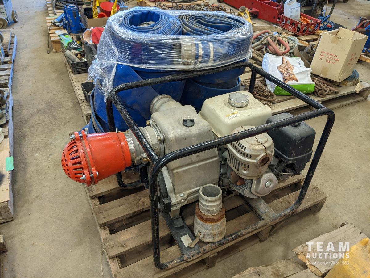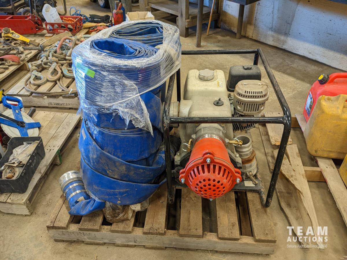 Honda GX390 13 HP gas engine, qty of 4 inch lay flat hose, unused 4 inch foot valve