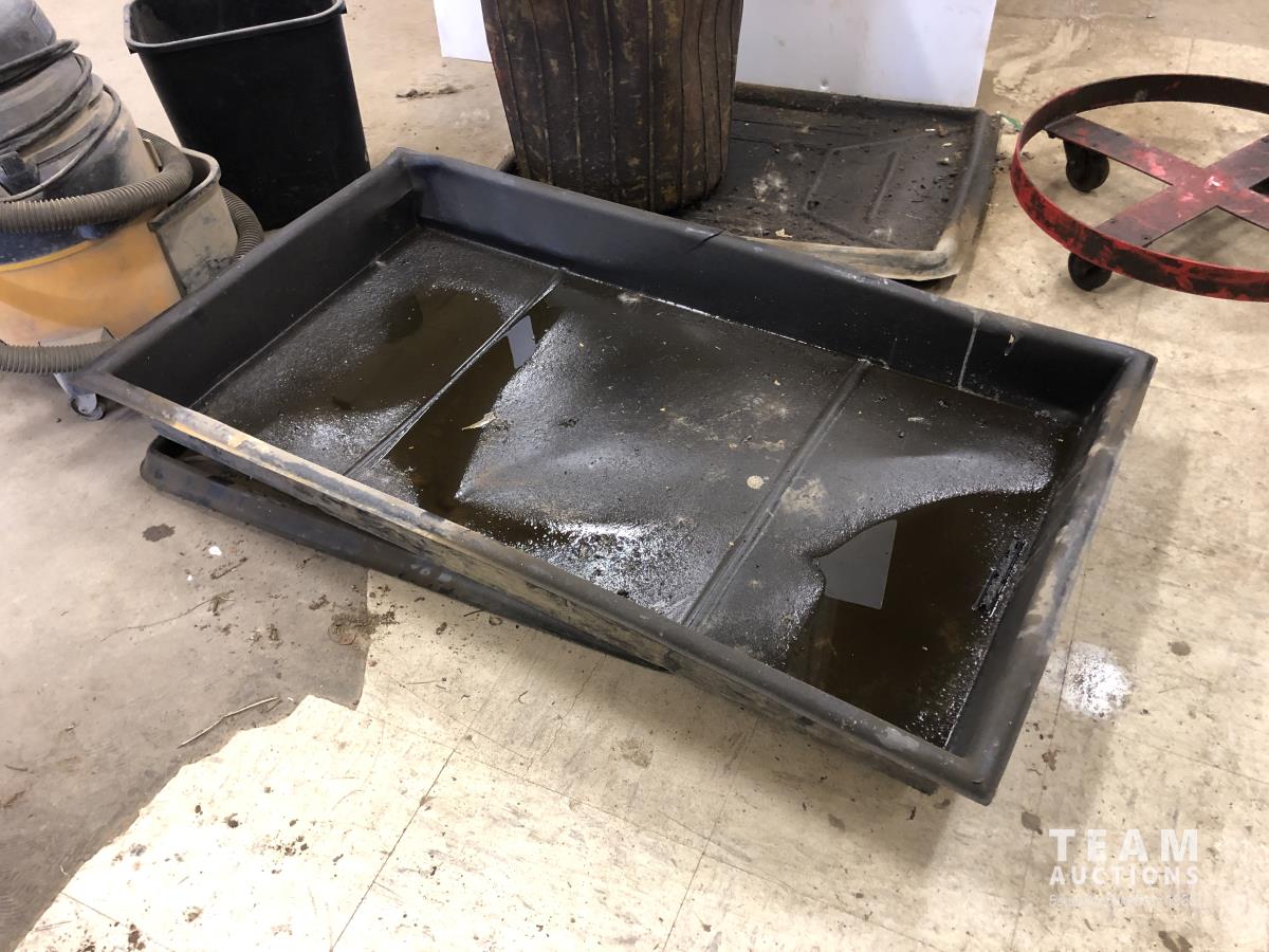 (4) containment trays, oil funnels, 6.5 HP shop vac, mop bucket, garbage can, barrel dolly
