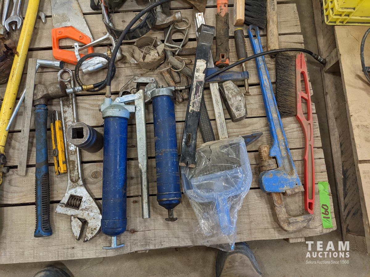 Grease guns, wrenches, hammers, bolt cutter, pipe wrenches, saws, miscellaneous hardware