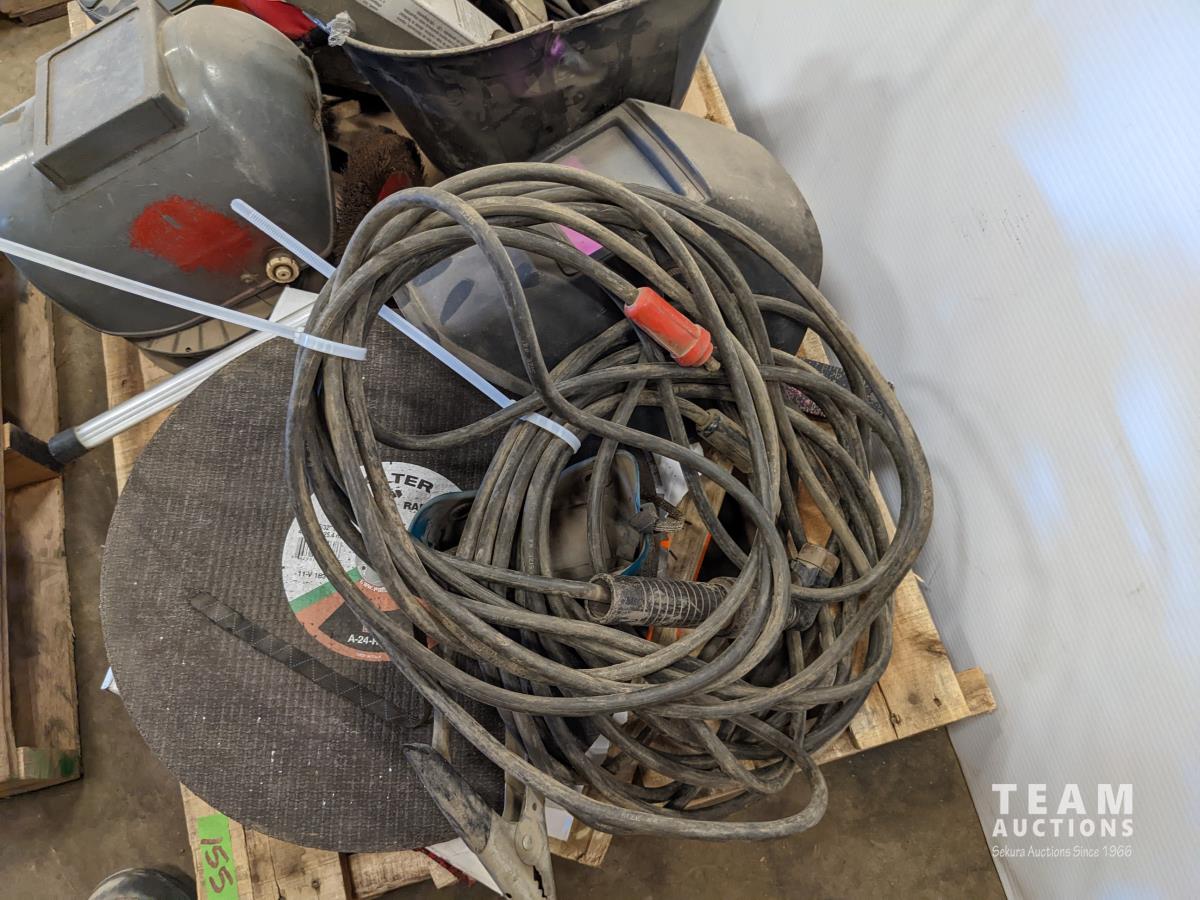 (2) welding helmets, cables, grinding and cut off discs, wire wheels, knee pads, miscellaneous items