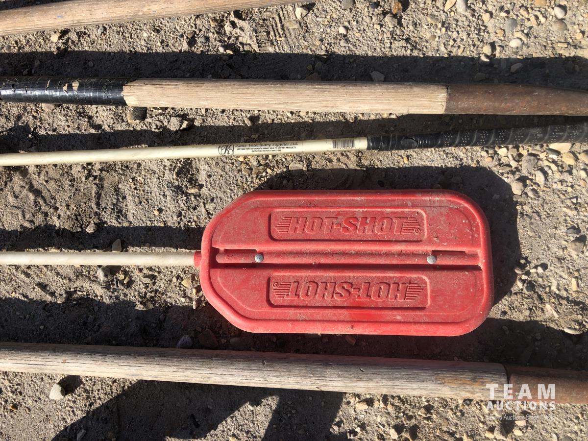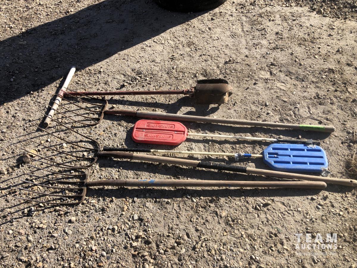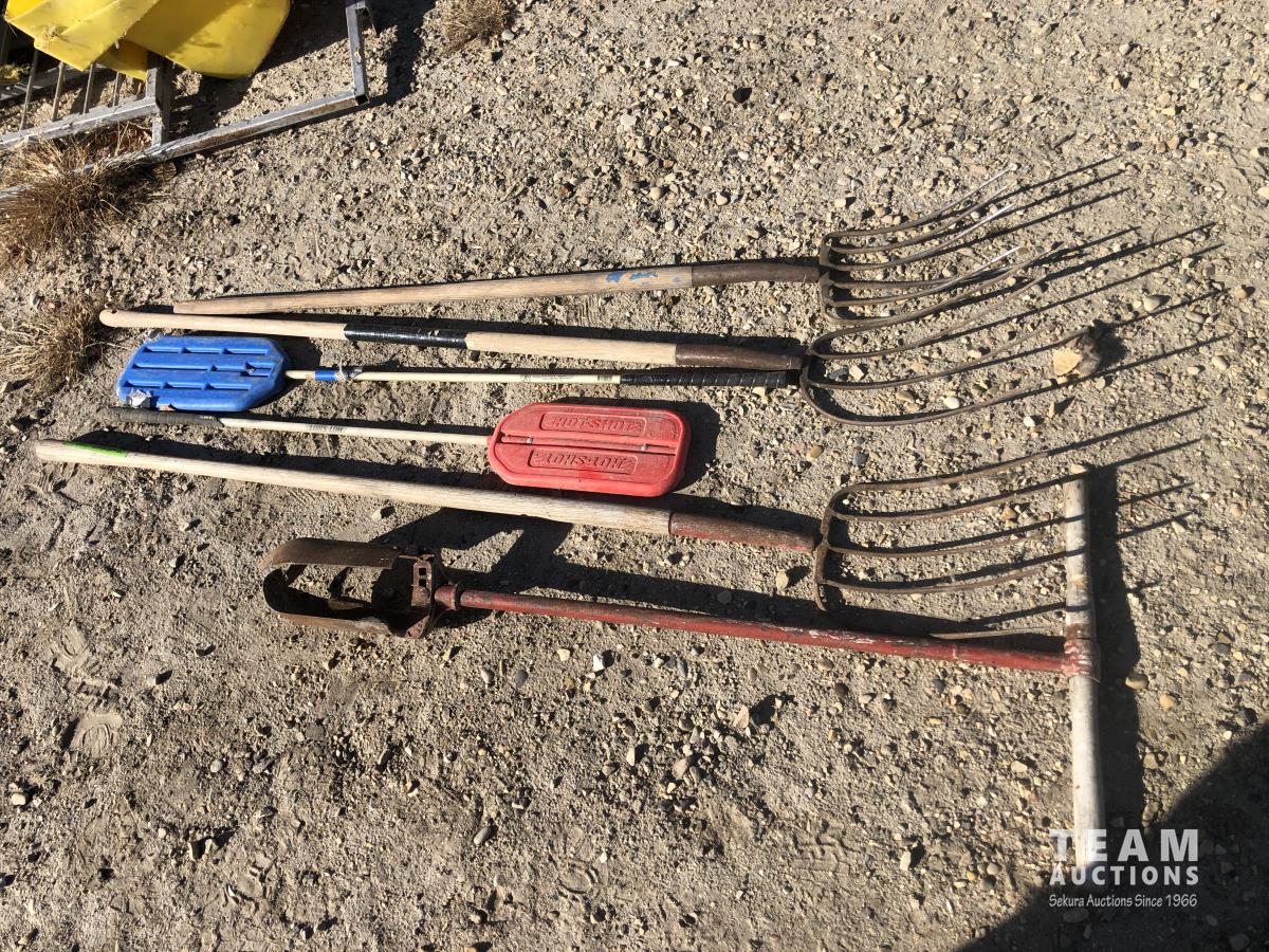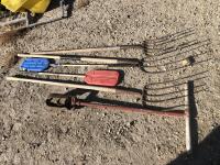 11 (3) Pitch Forks, (2) Livestock Paddles, 6 Inch Hand Post Auger
