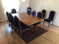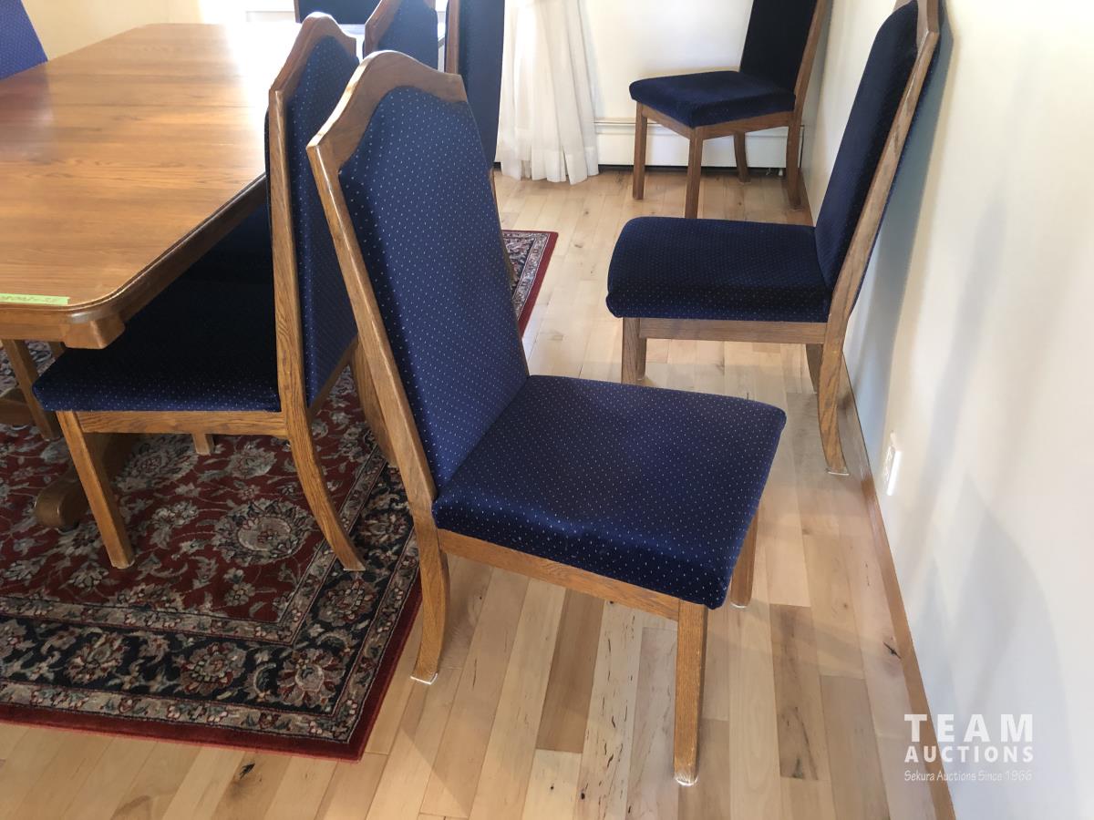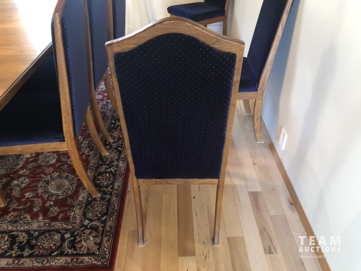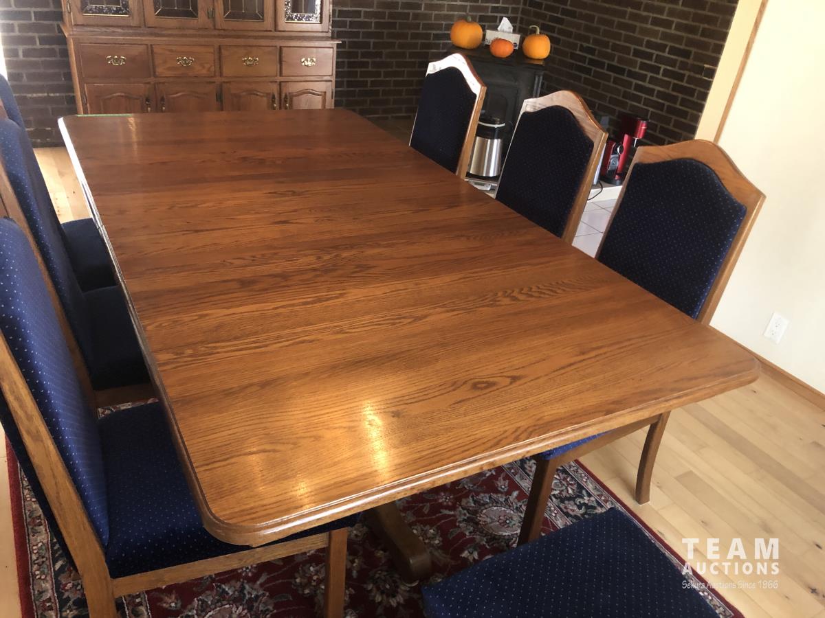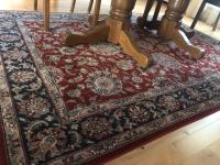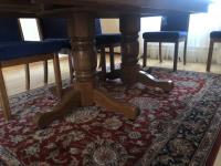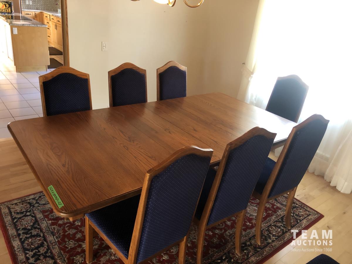 45 inch W X 60 inch L table 84 inch with leaves, (10) chairs, china cabinet and hutch, 63 inch X 93 ft rug