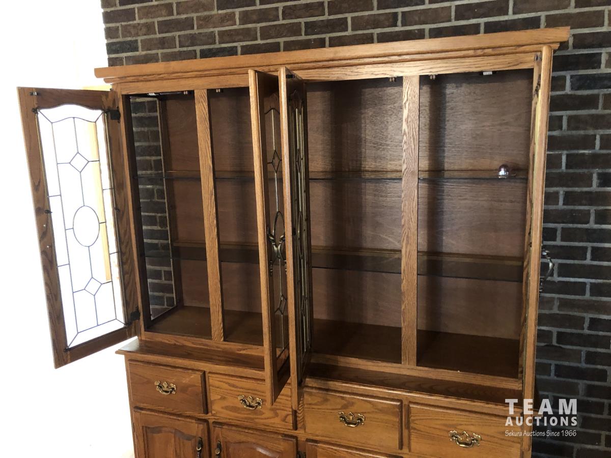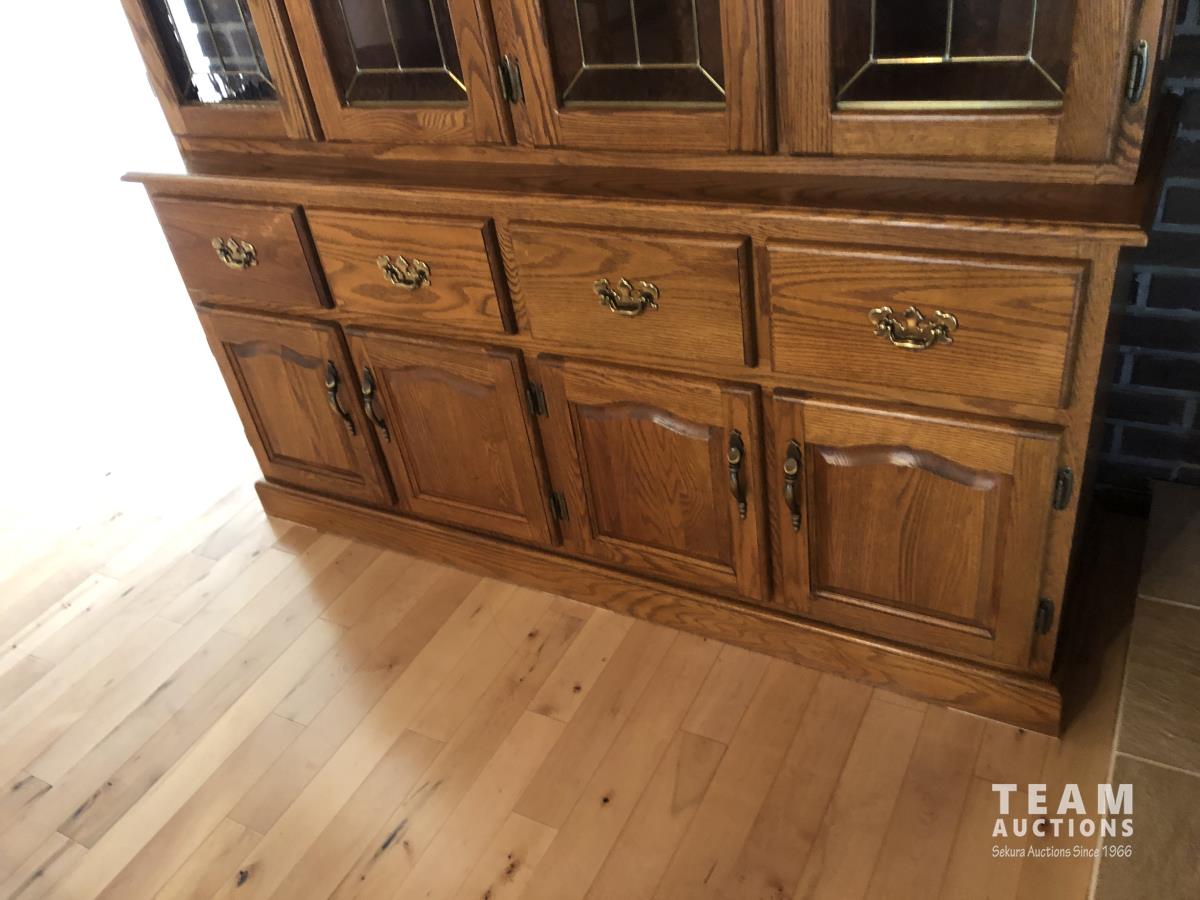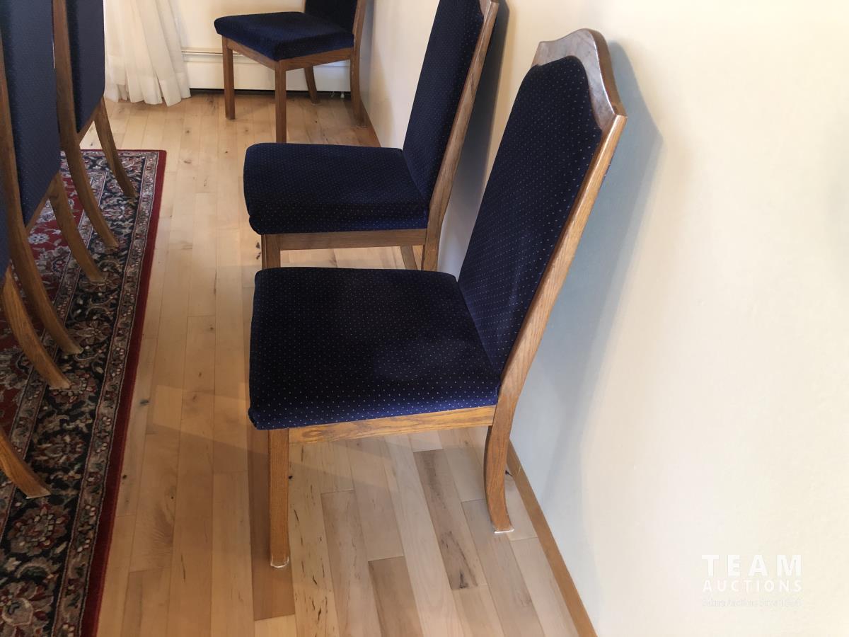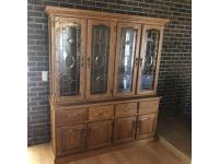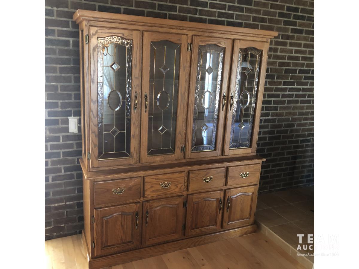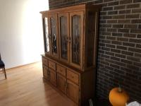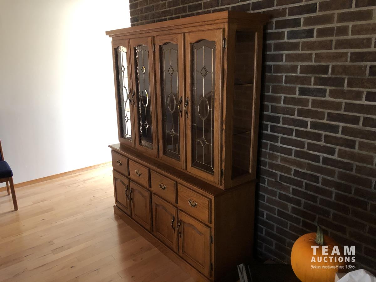 45 inch W X 60 inch L table 84 inch with leaves, (10) chairs, china cabinet and hutch, 63 inch X 93 ft rug