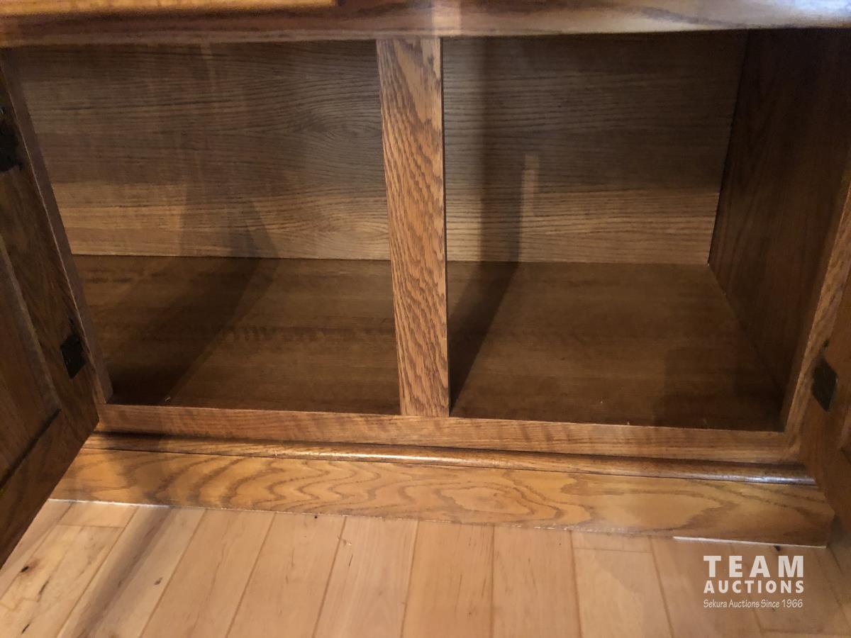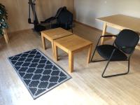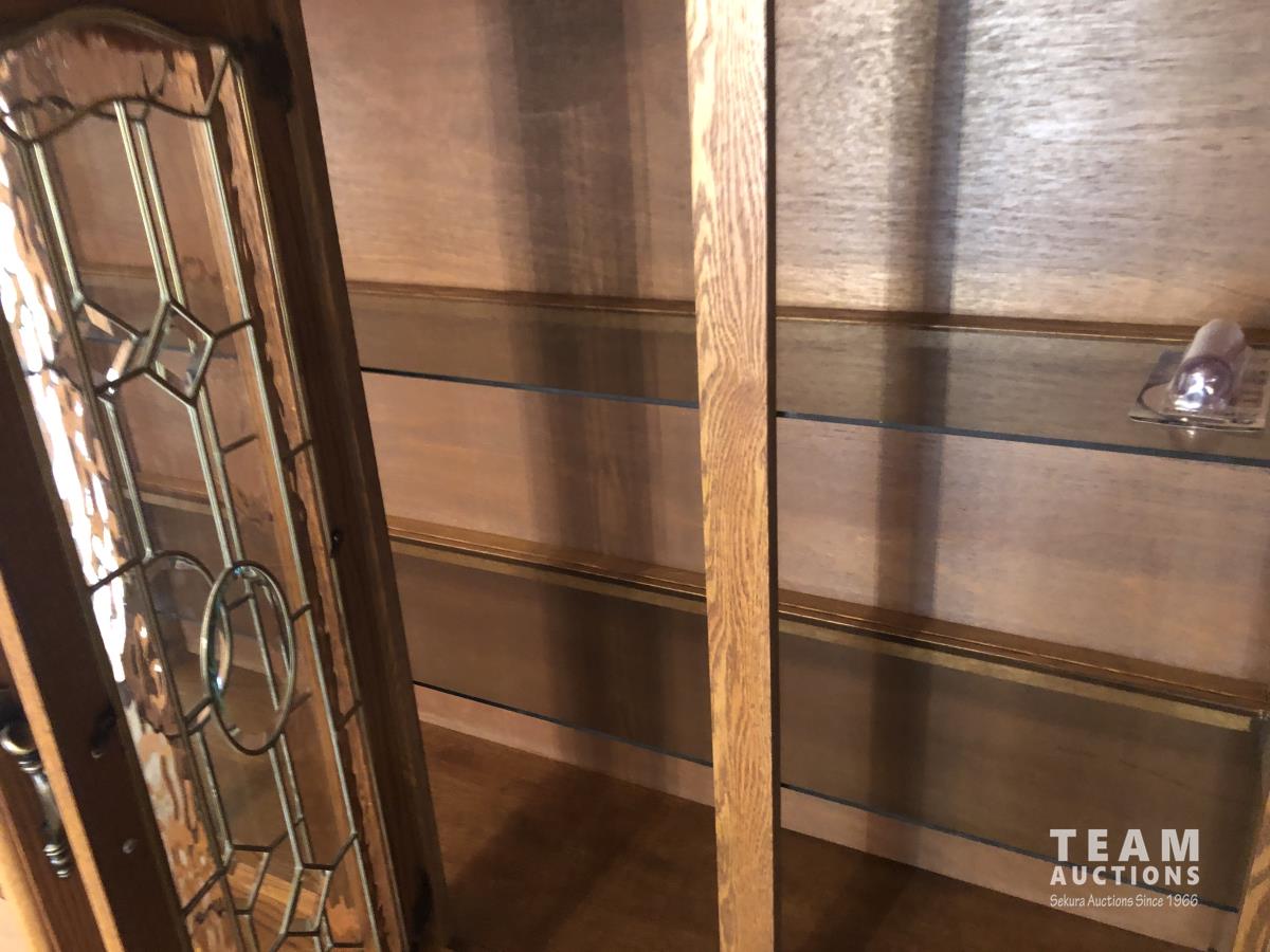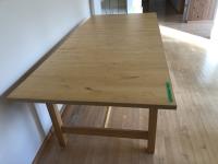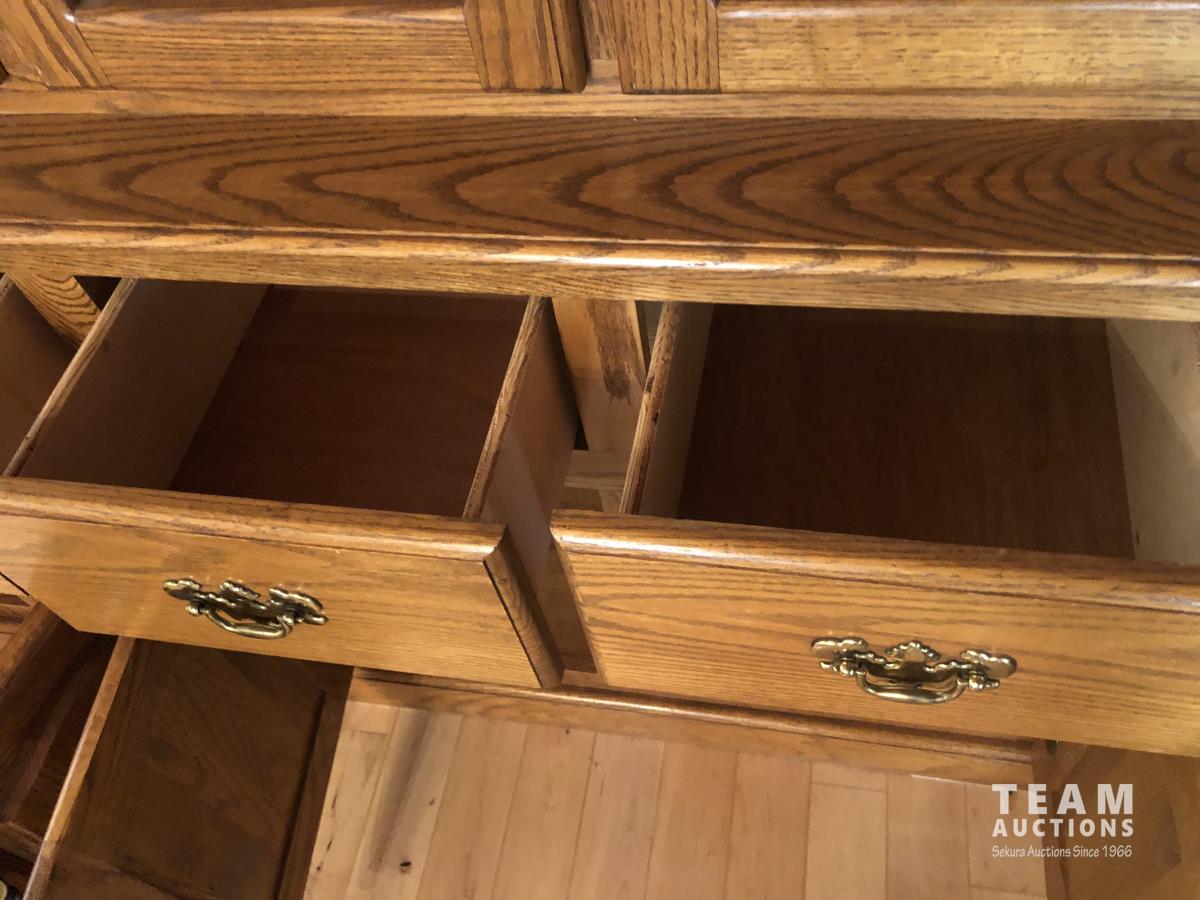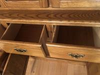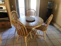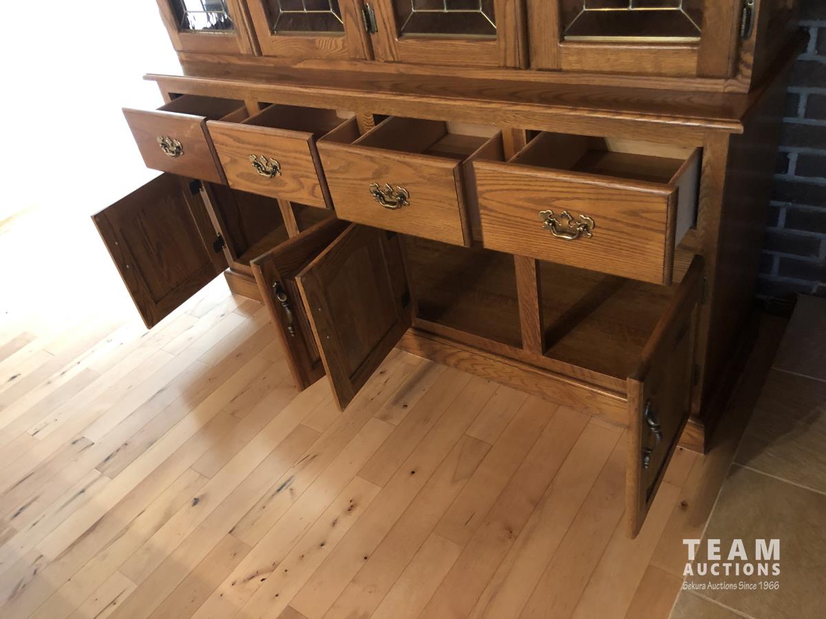 45 inch W X 60 inch L table 84 inch with leaves, (10) chairs, china cabinet and hutch, 63 inch X 93 ft rug