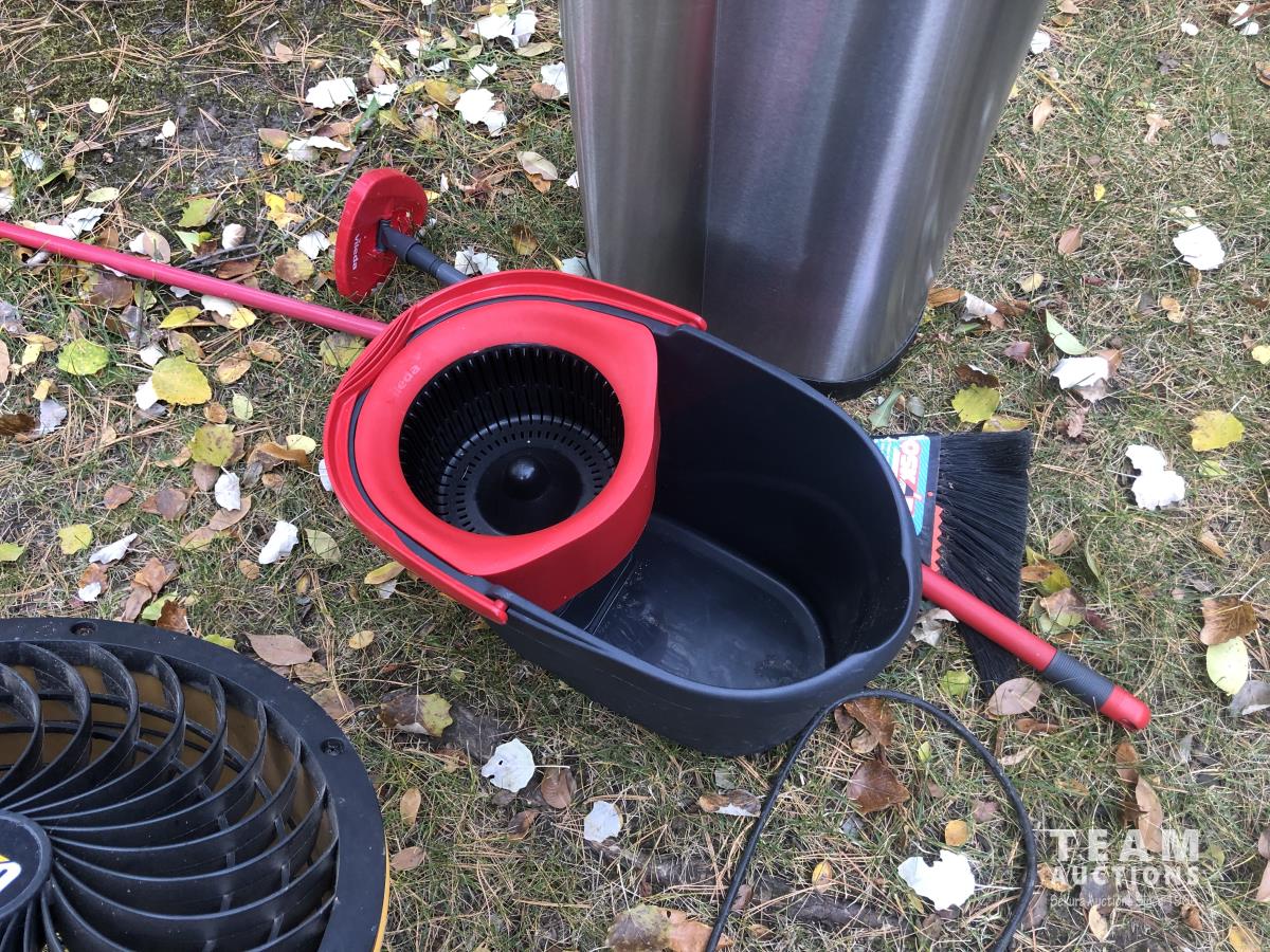 65 Garbage Can, Broom, Mop Bucket & Caterpiller Fan