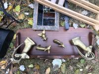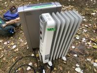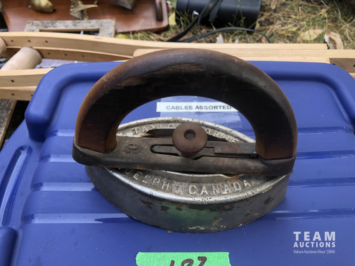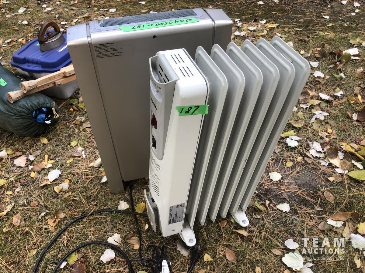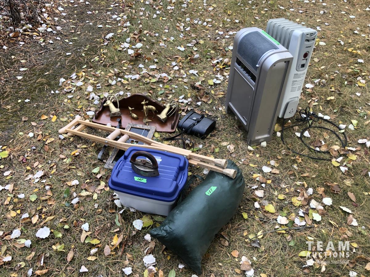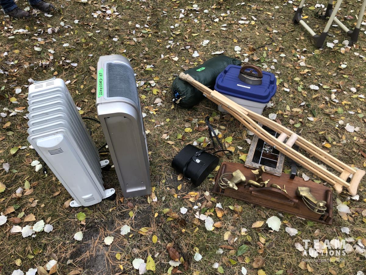 (2) space Heaters, tent, crutches, sad iron, binoculars, ornamental shelf, cords