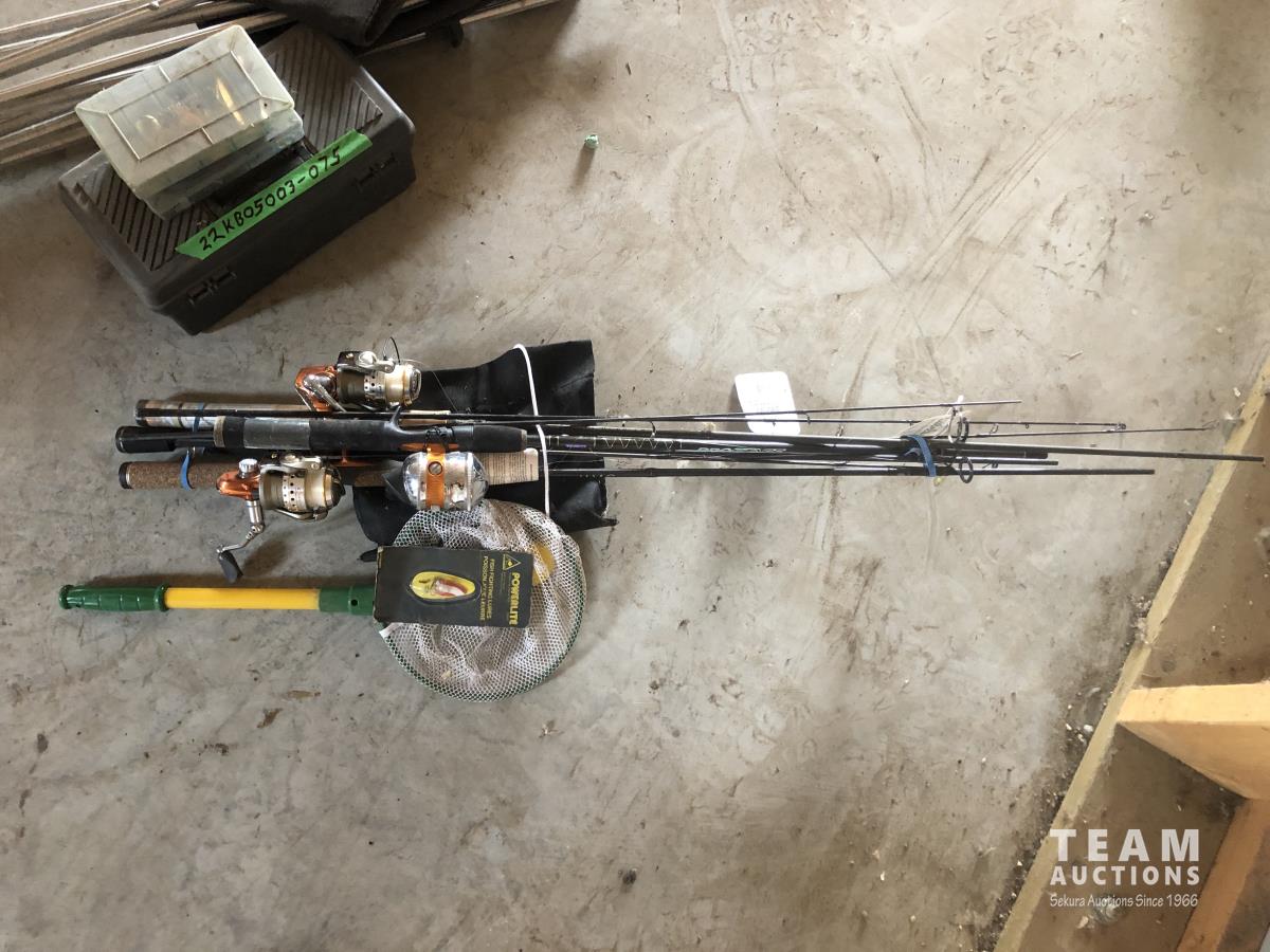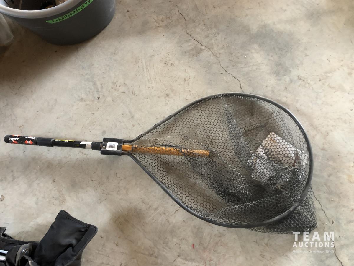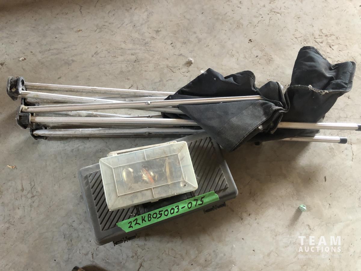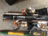 Rods, net, minnow net and chair, dog tattoo kit