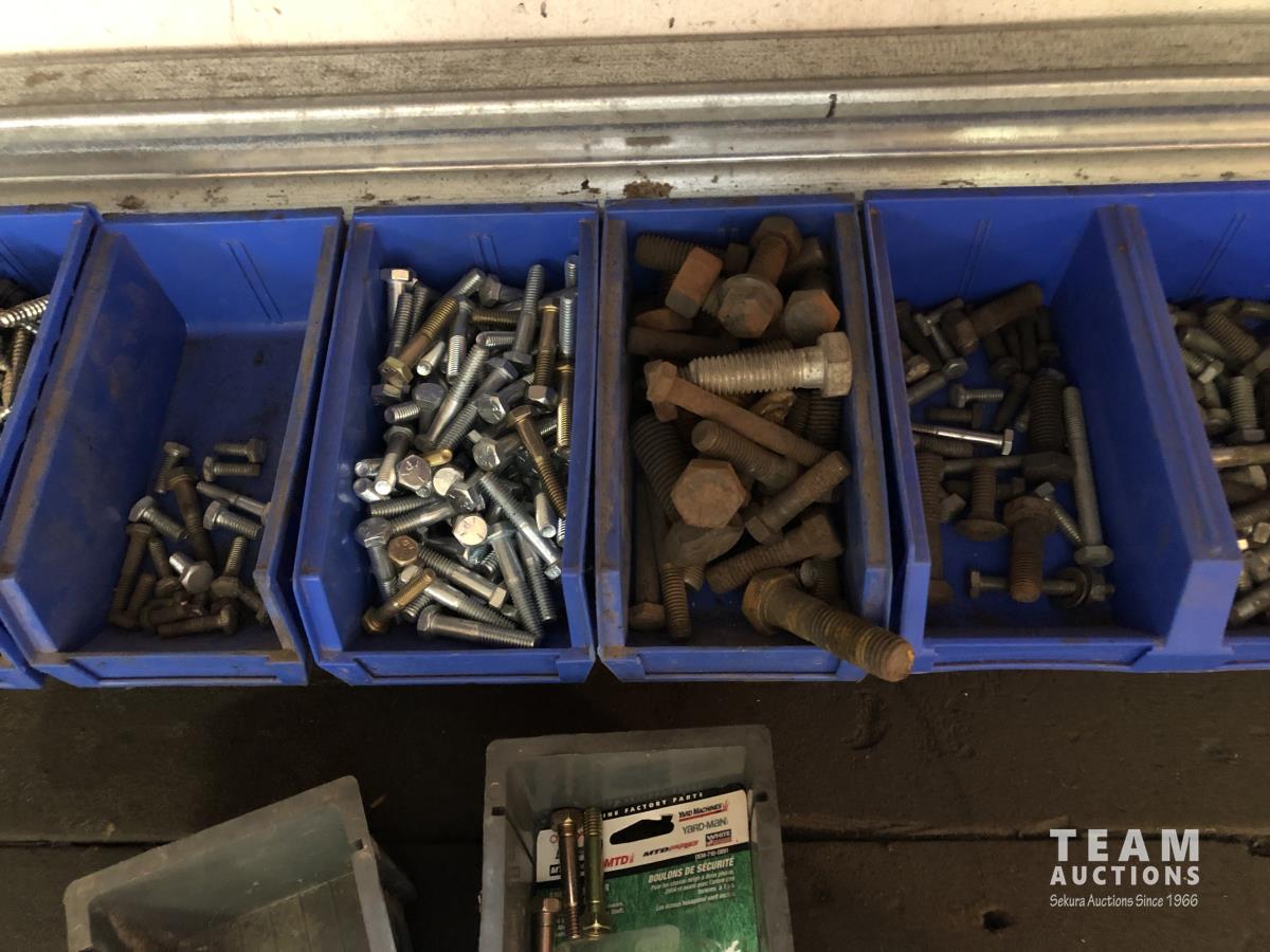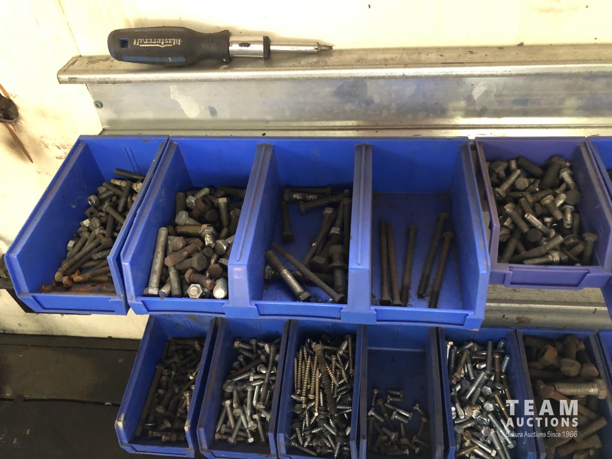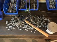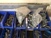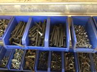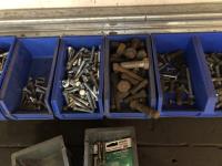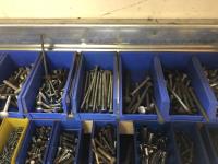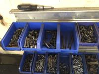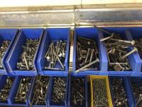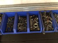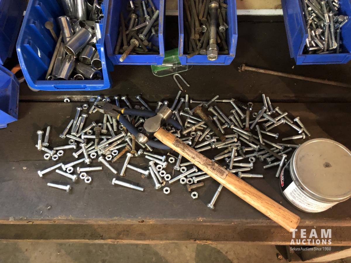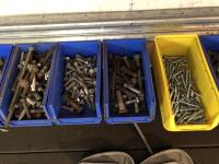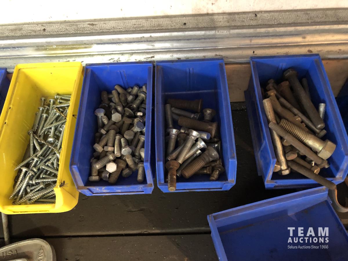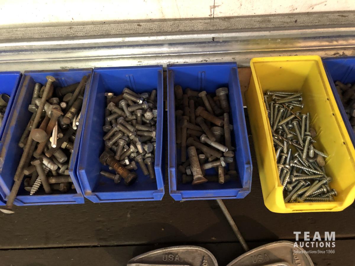 52 Qty of Parts Bins with Nuts, Bolts, Clamps, Hammer