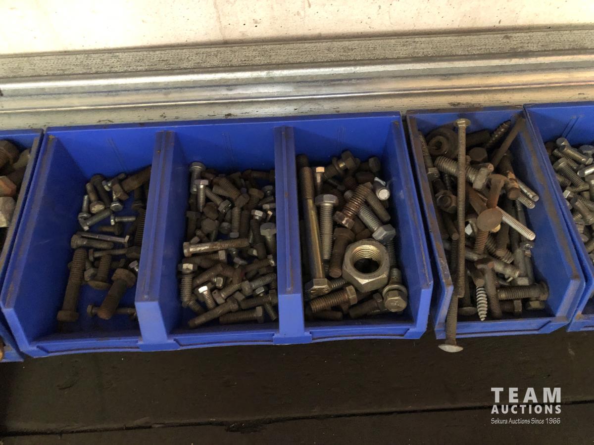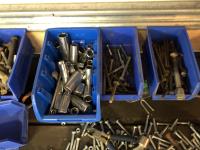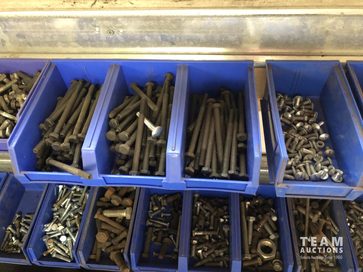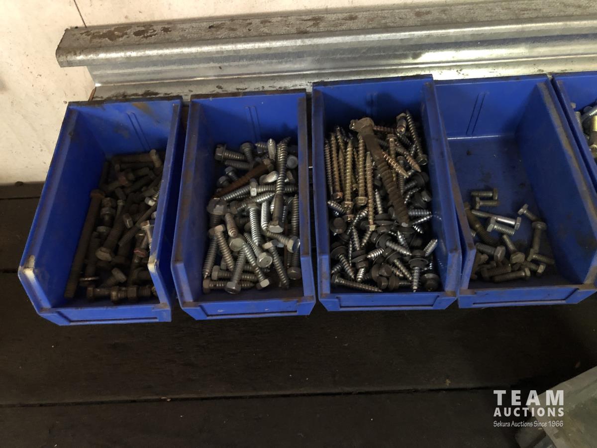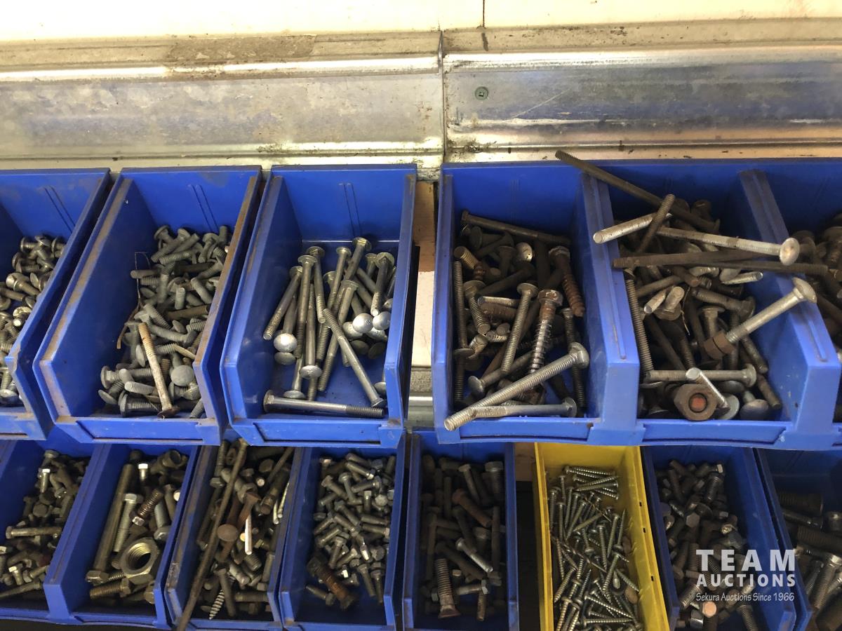 52 Qty of Parts Bins with Nuts, Bolts, Clamps, Hammer