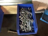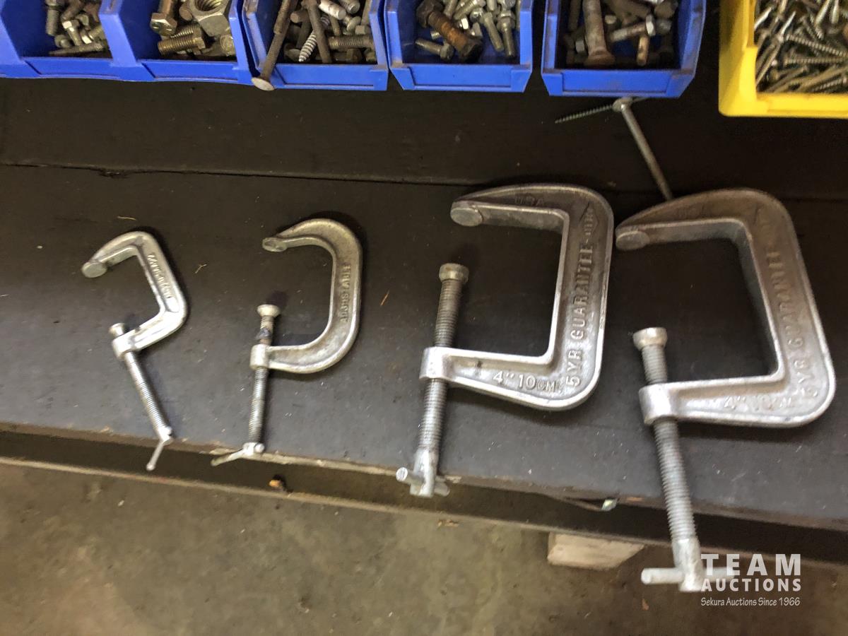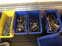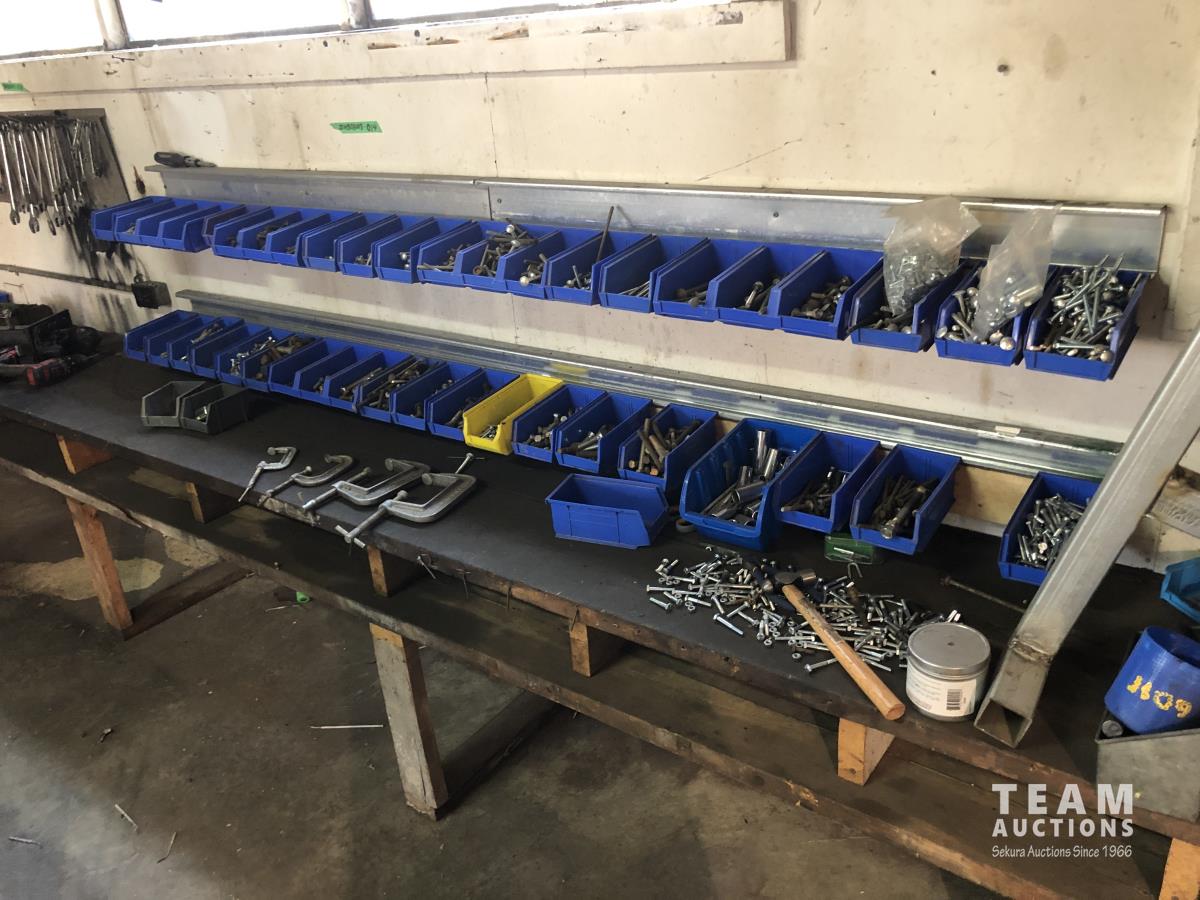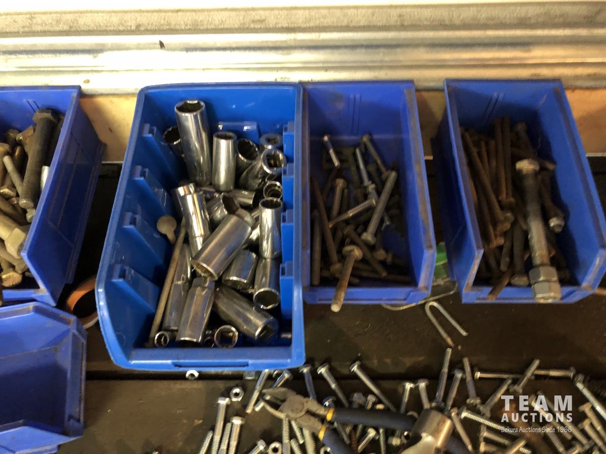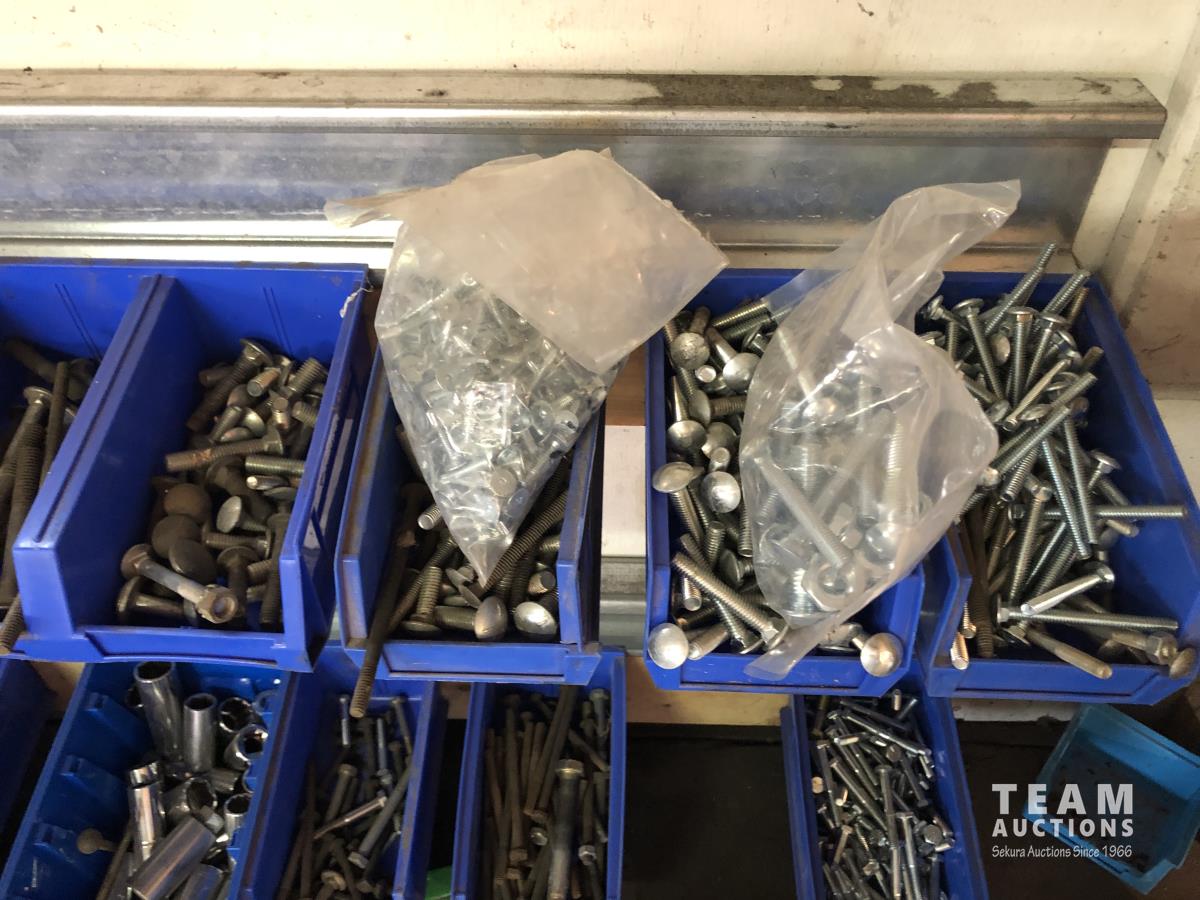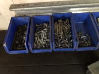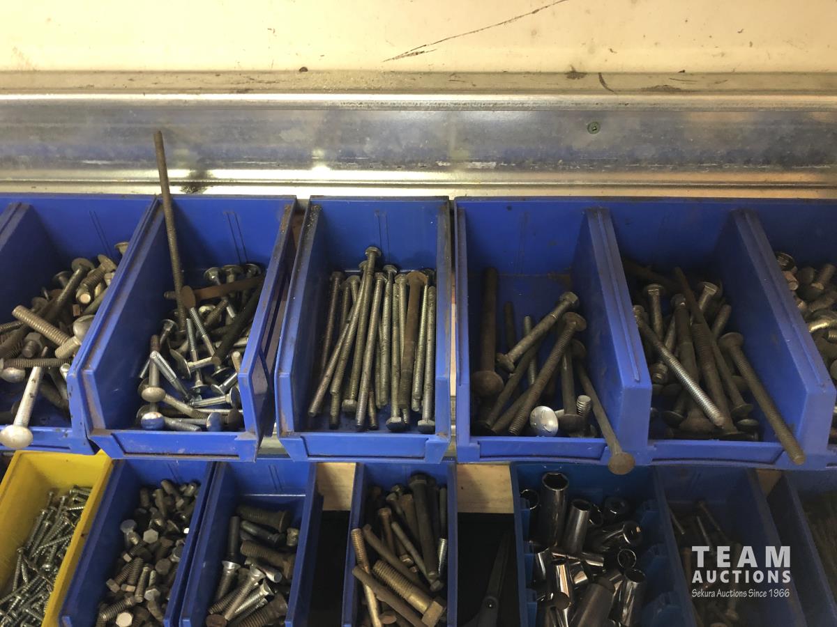 52 Qty of Parts Bins with Nuts, Bolts, Clamps, Hammer