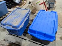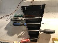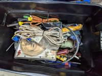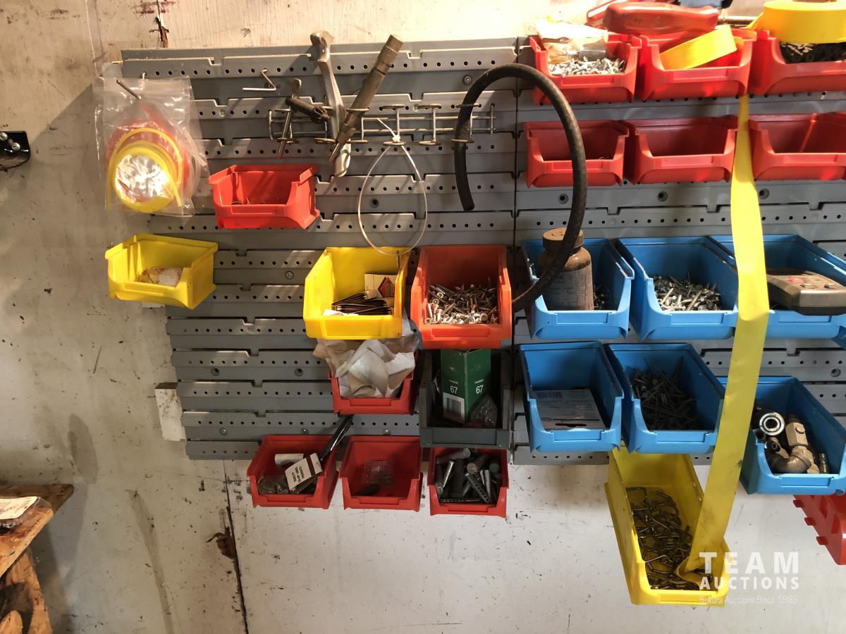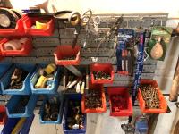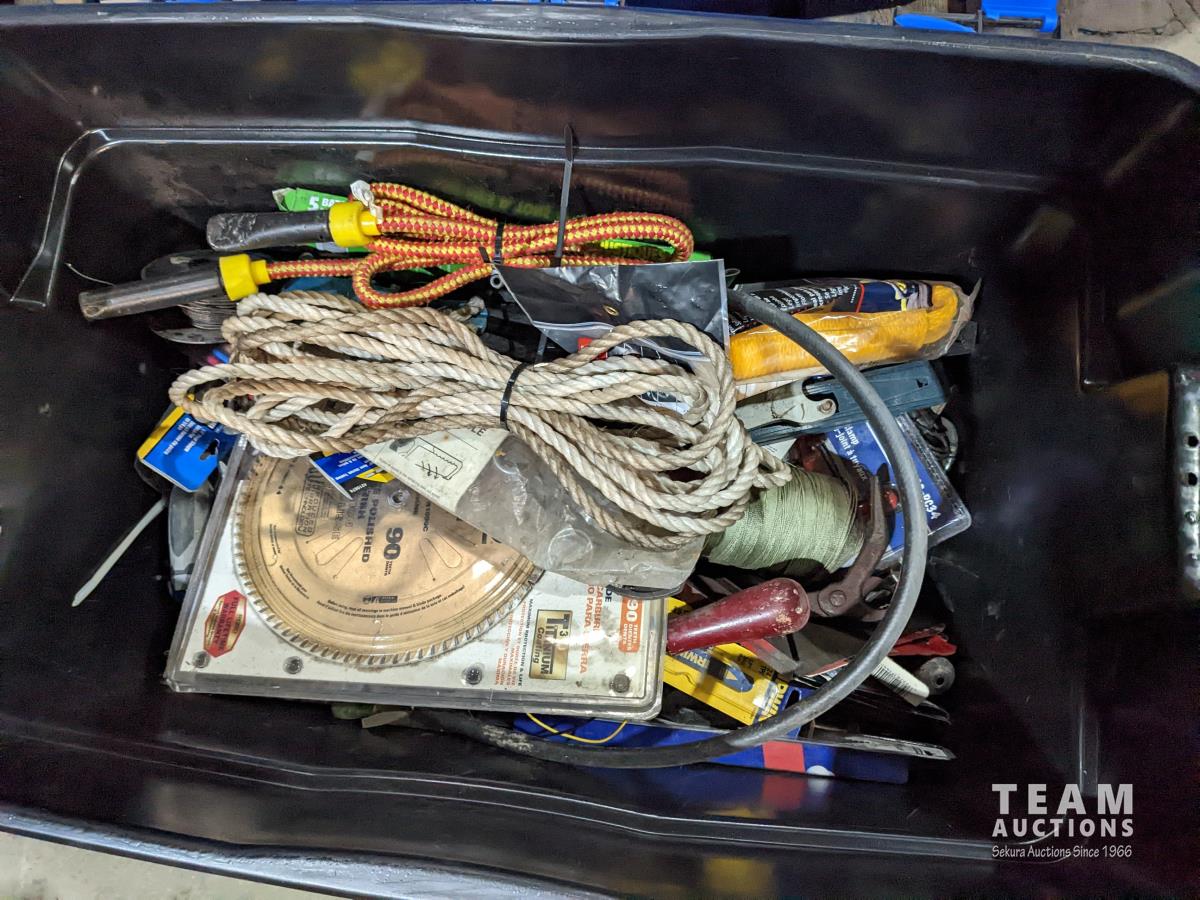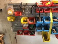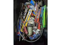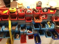 Screws, air compressor fittings, vinyl electrical tape, pad locks, hose/pipe fittings, shop tools & accessories, (2) blue totes