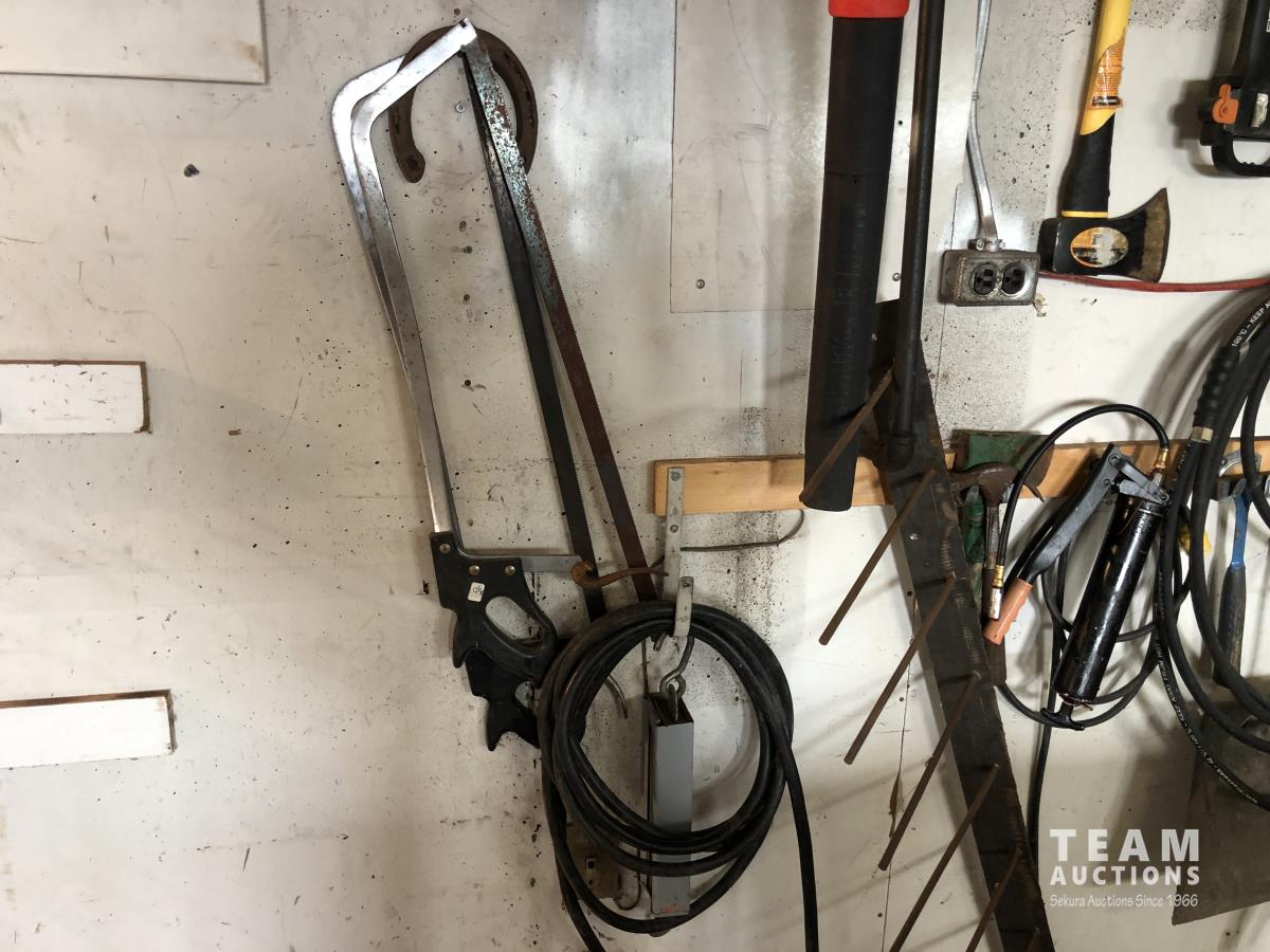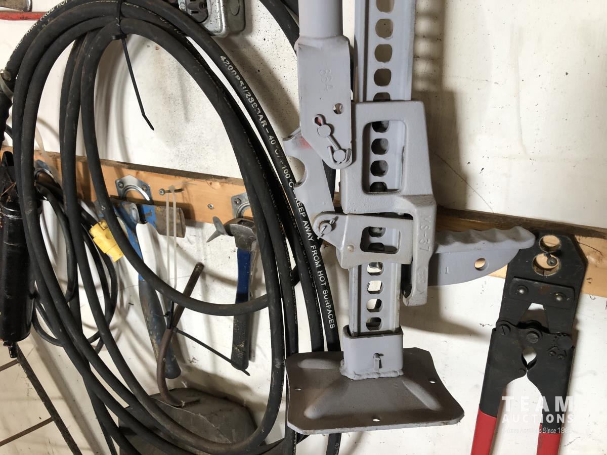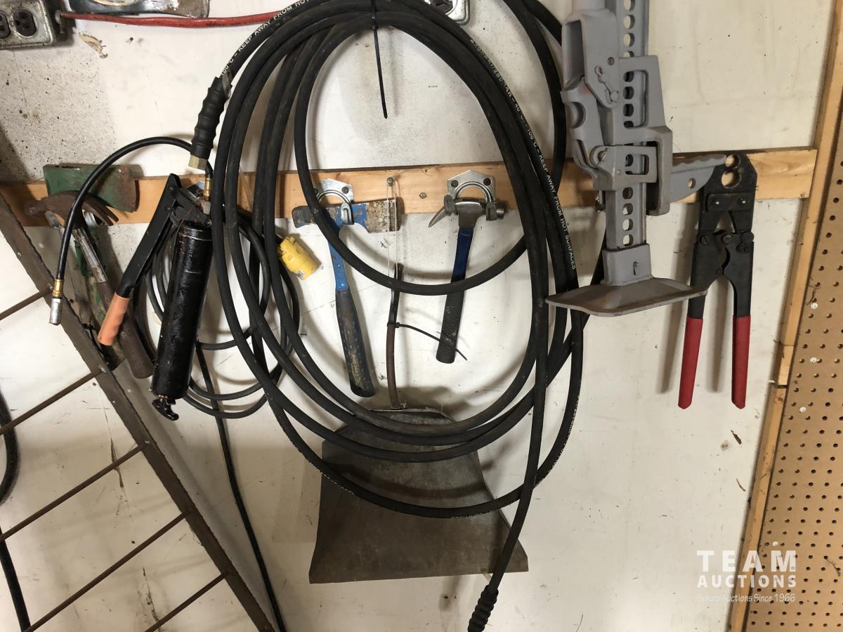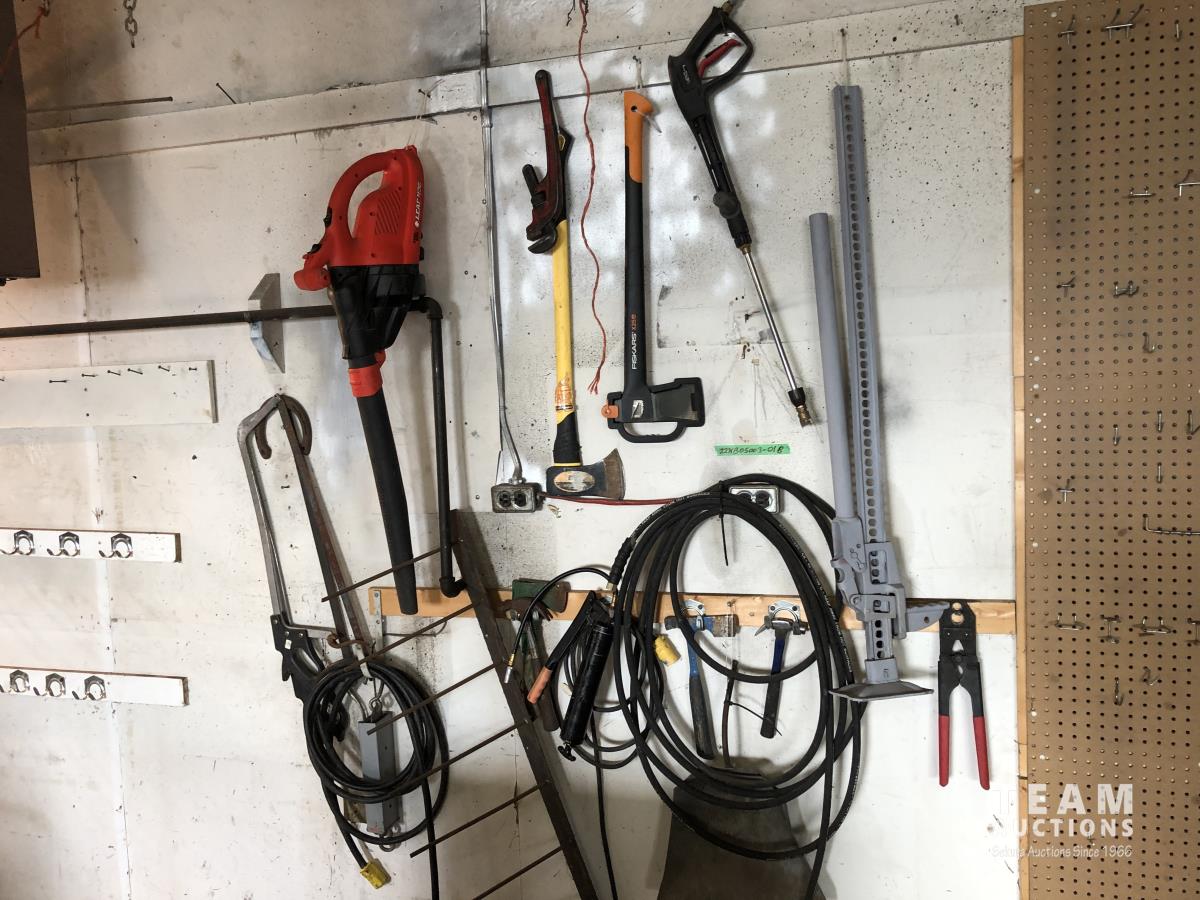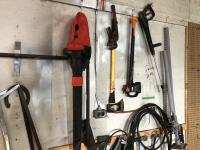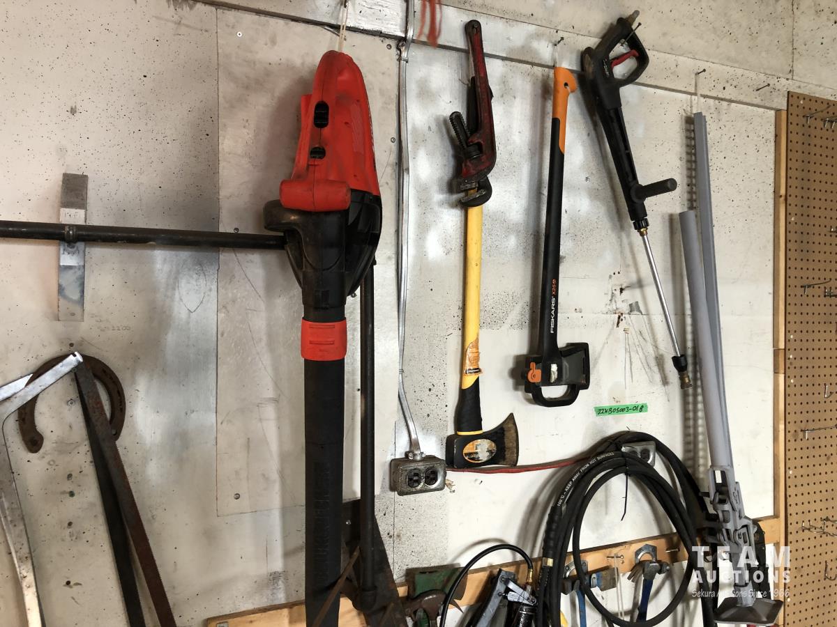 Jackall, axes, hammers, leaf blower, pressure washer gun, hack saws, electrical cords, crimpers, grease gun, offset pipe wrench