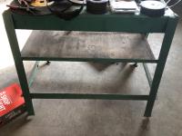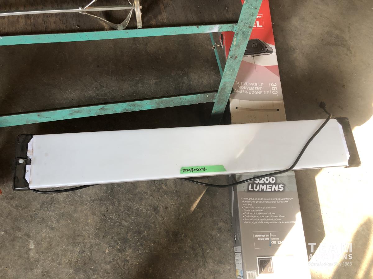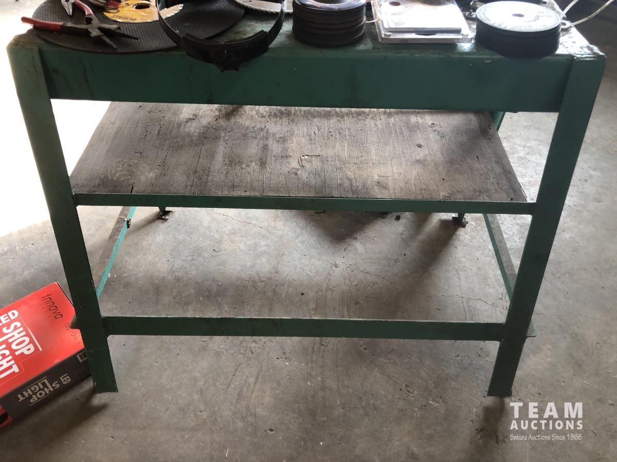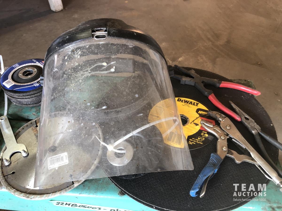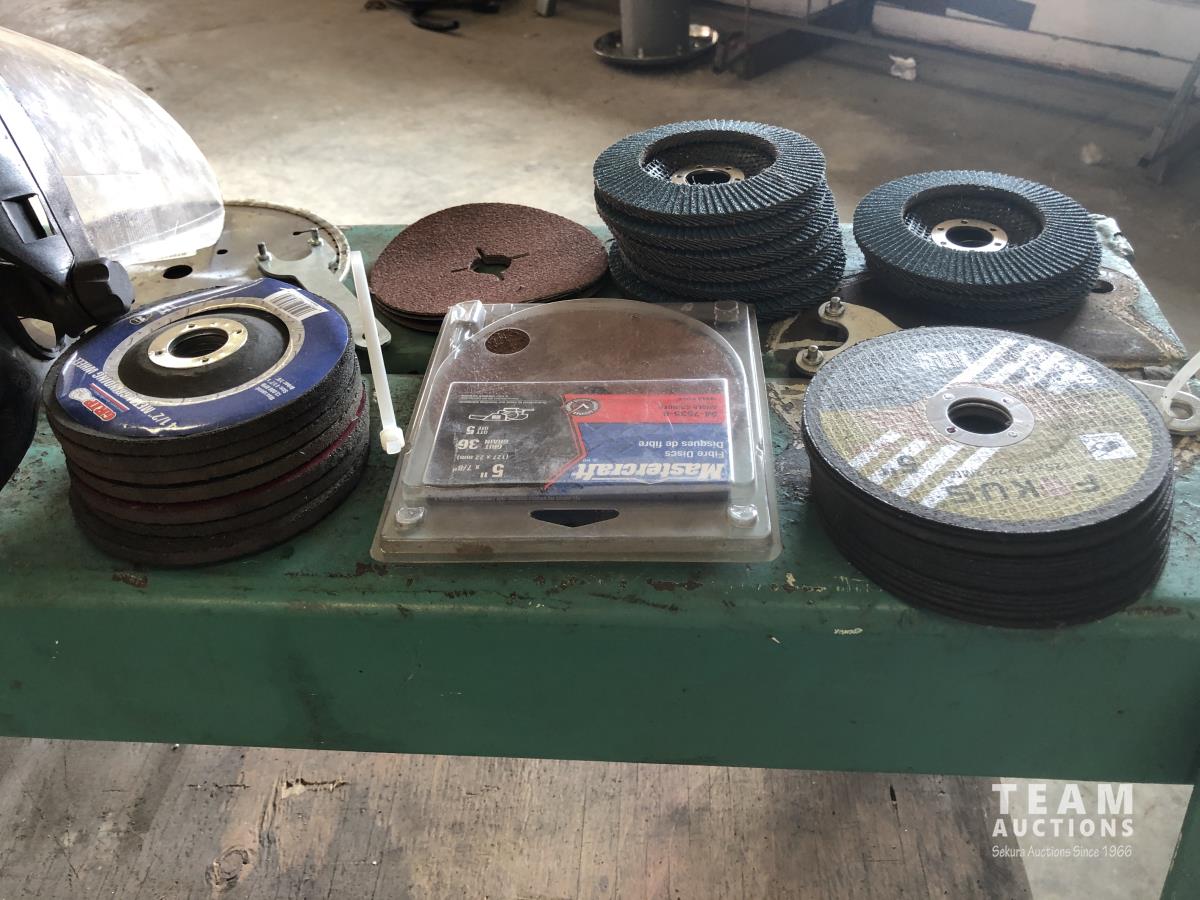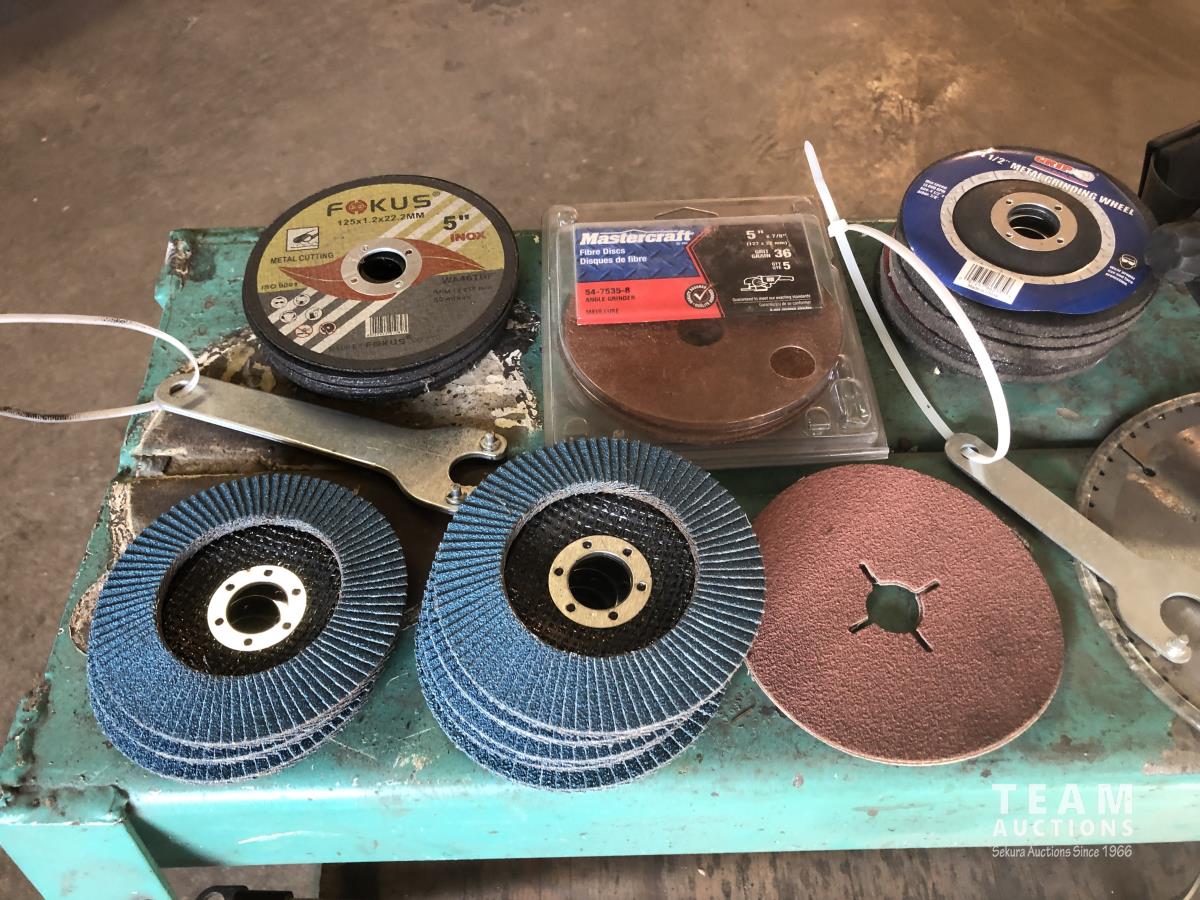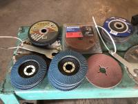 (2) portable lights, paint mixer, face shield, (2) 14 inch chop saw blades, (9) 4 inch flap discs, qty of 5 inch zip discs, 5 inch fibre discs, 4-1/2 inch grinder discs, assorted tools, 36 inch shelf