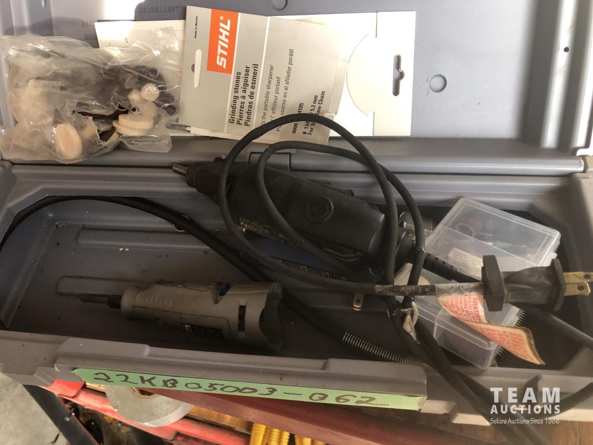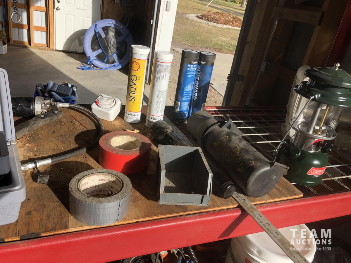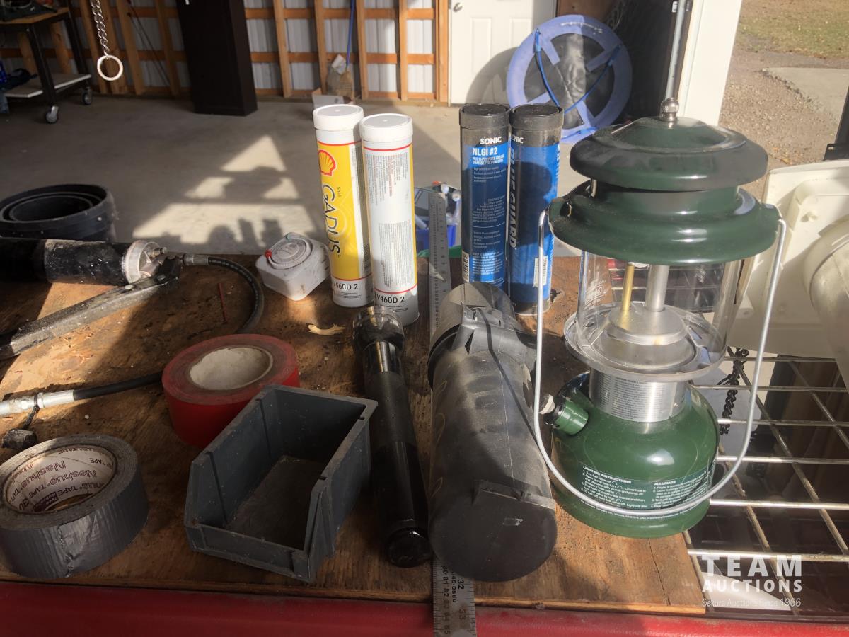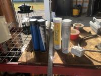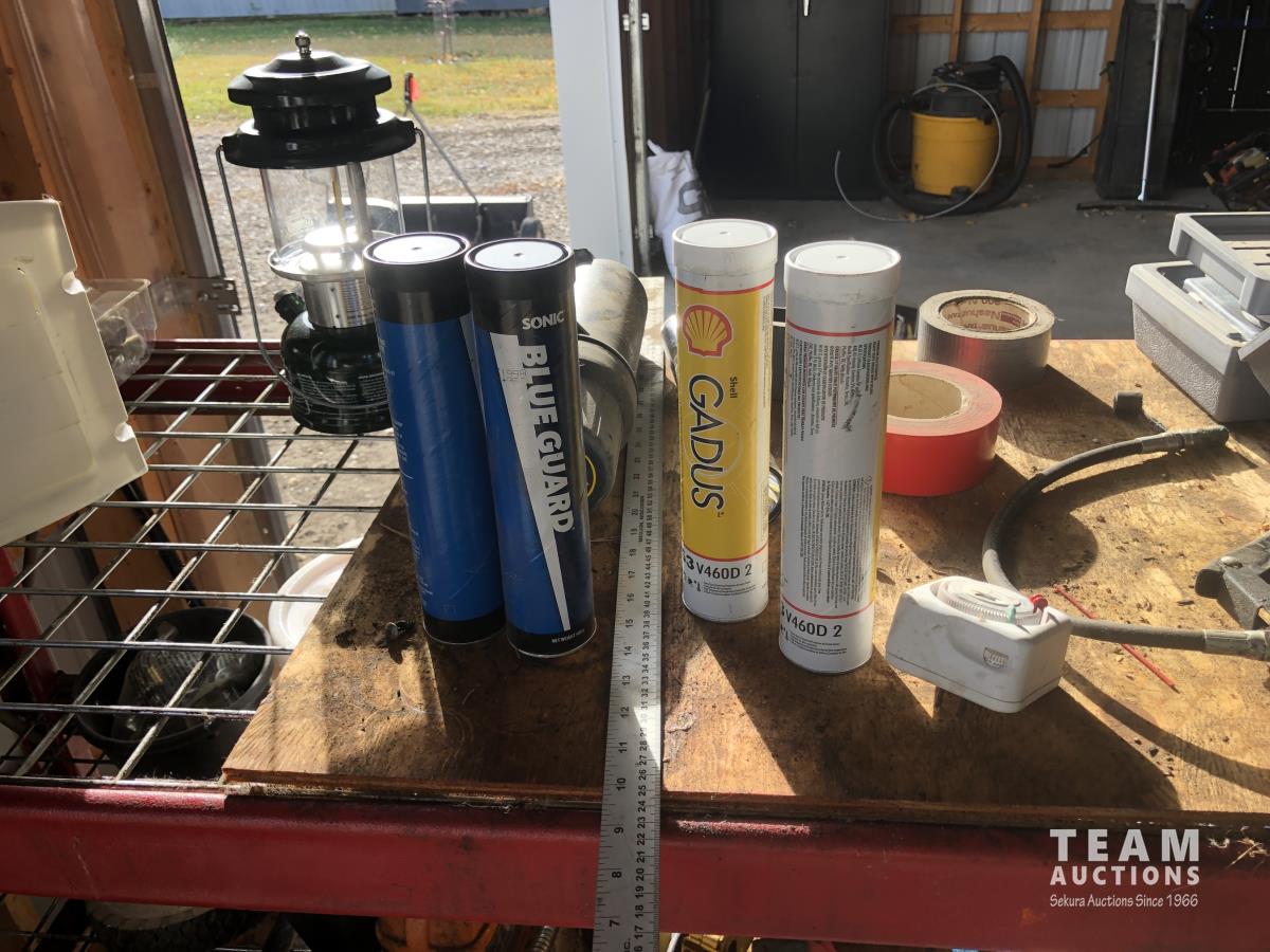 Grease guns, (4) tubes of grease, lantern, flashlight, welding rod case, Stihl dremel