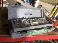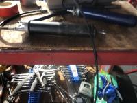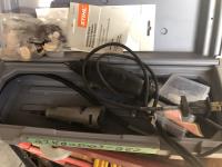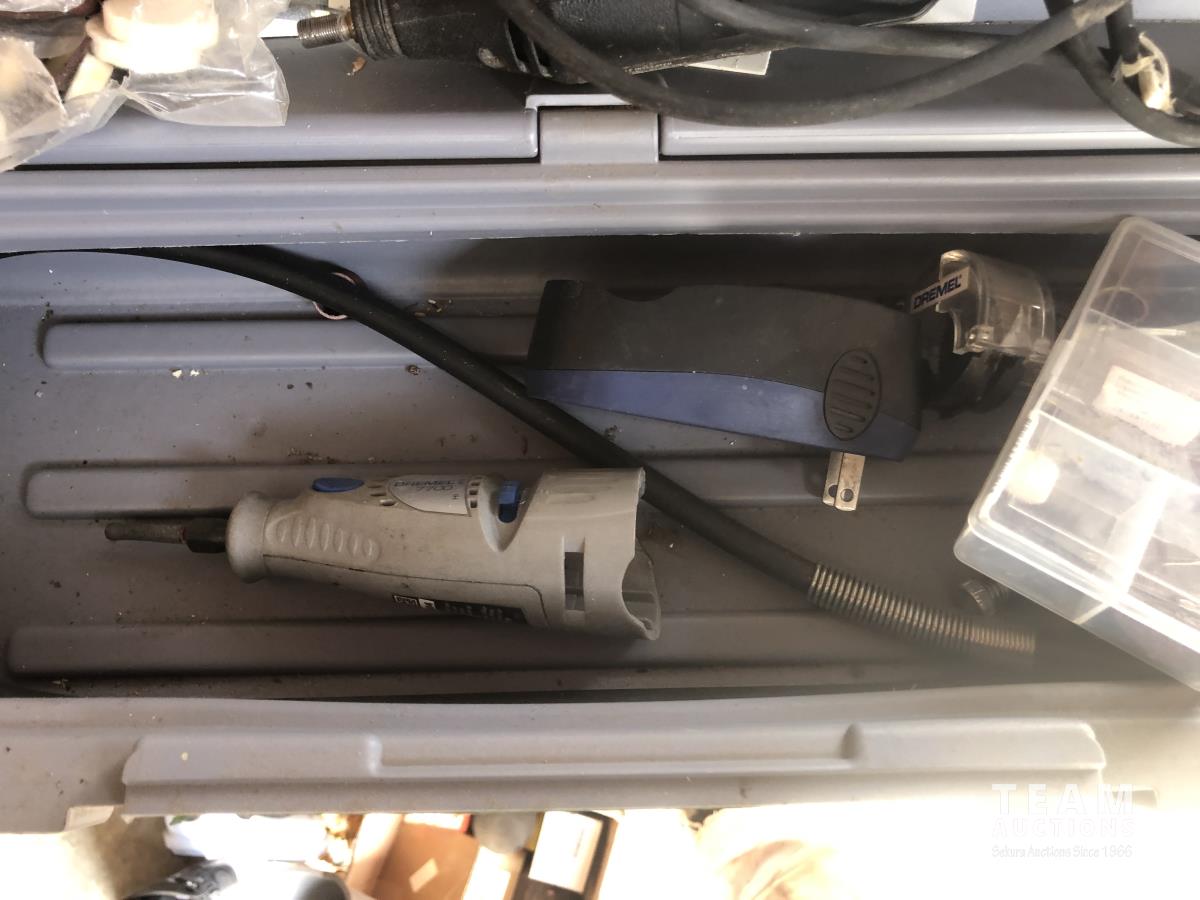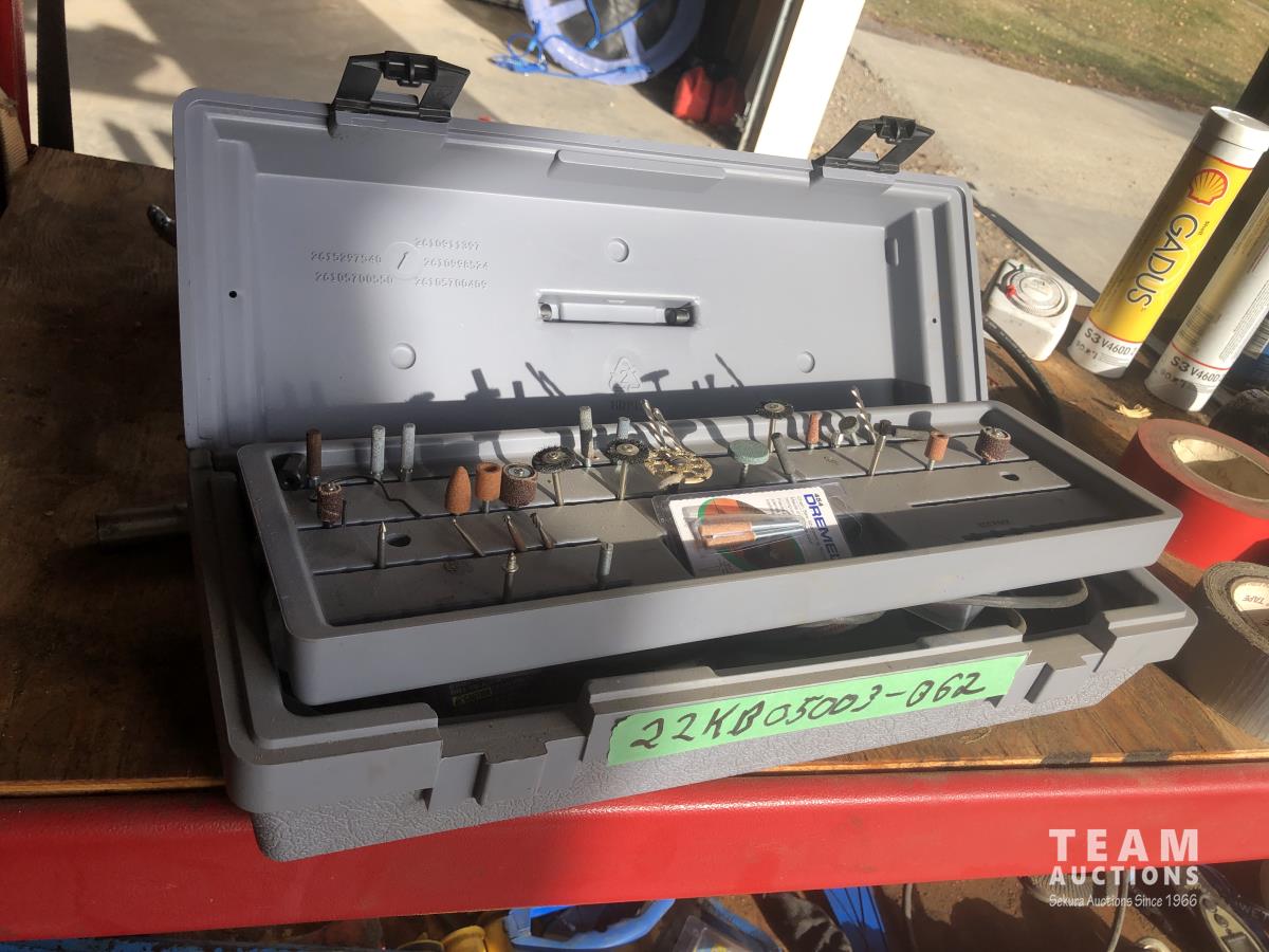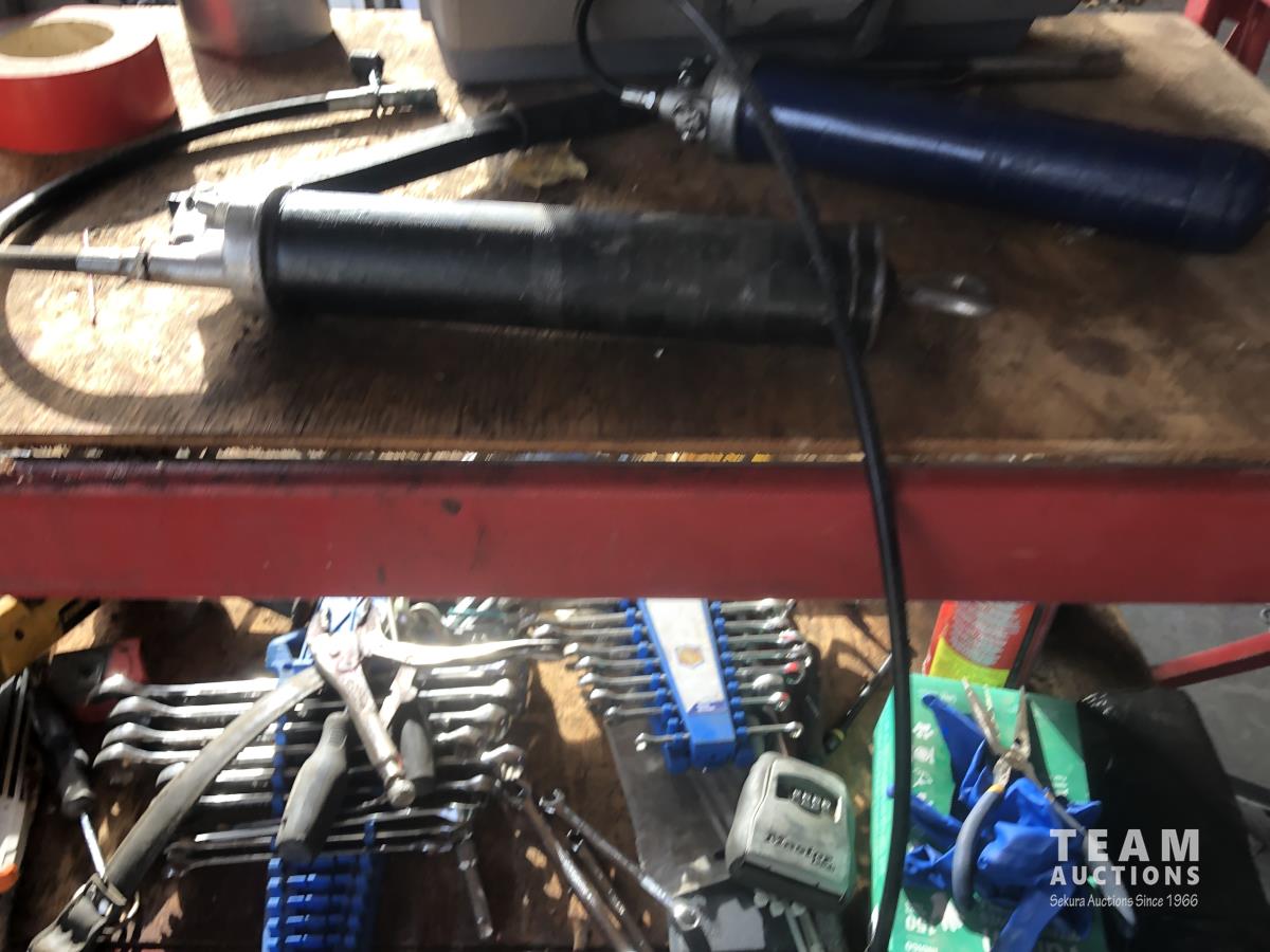 Grease guns, (4) tubes of grease, lantern, flashlight, welding rod case, Stihl dremel