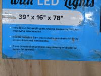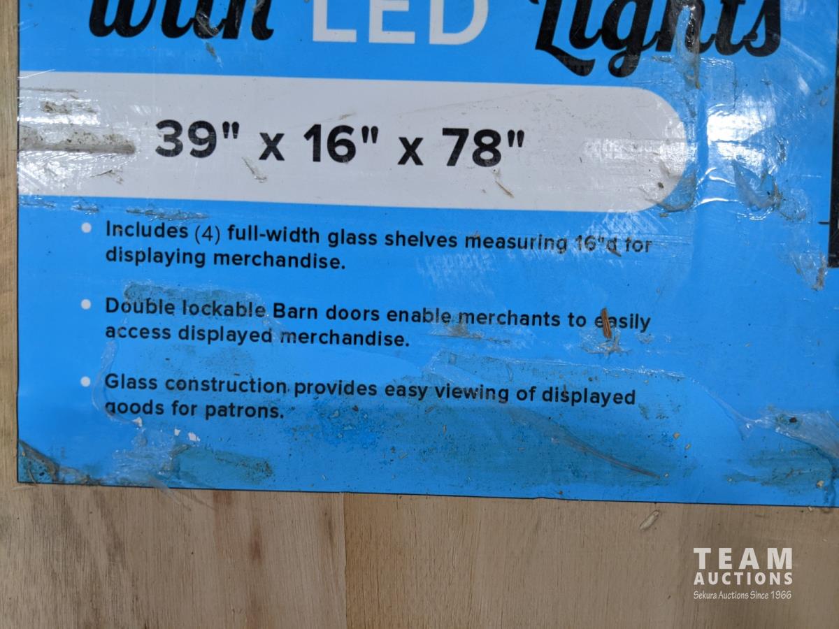 39 inch x 16 inch x 78 inch, LED lights, 4 glass shelves, lockable barn doors