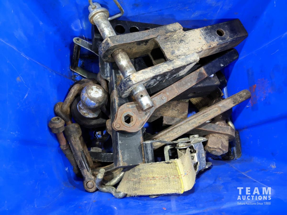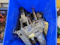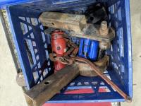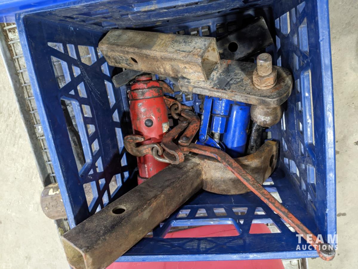 Engine stand receiver, hitches, box of screwdrivers, fuel transfer pump