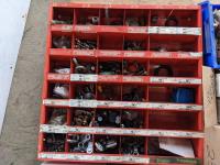 Wurth 36 compartment bolt bin with contents, assorted head lights, head light bulbs, 12 cup coffee maker, qty of bolts
